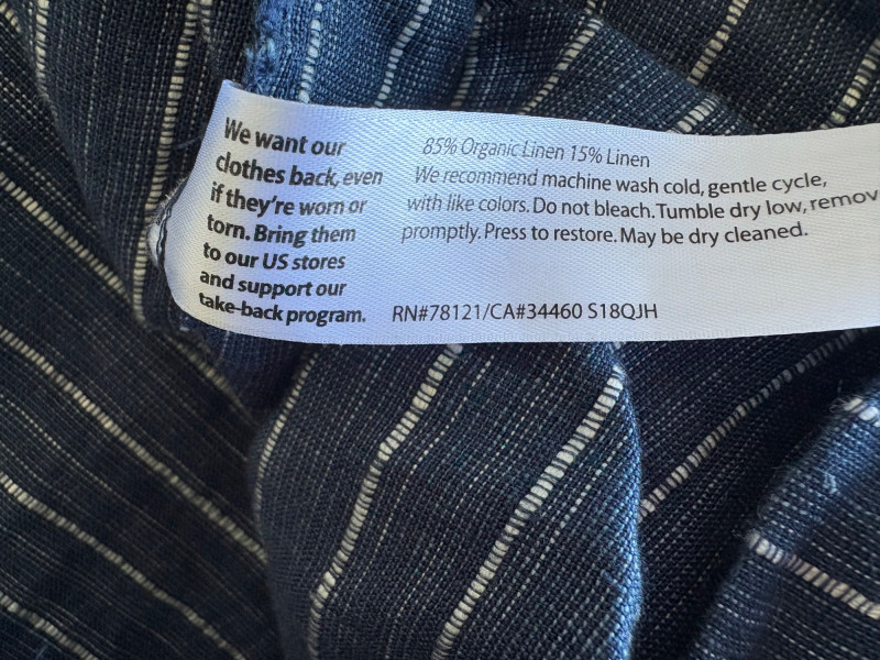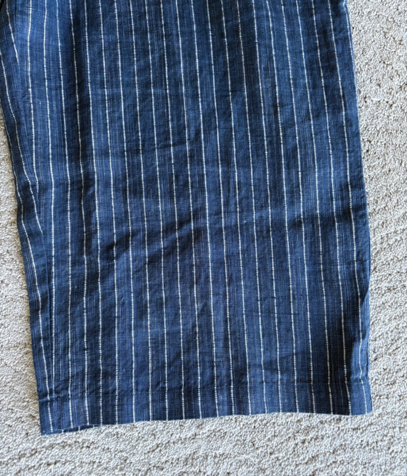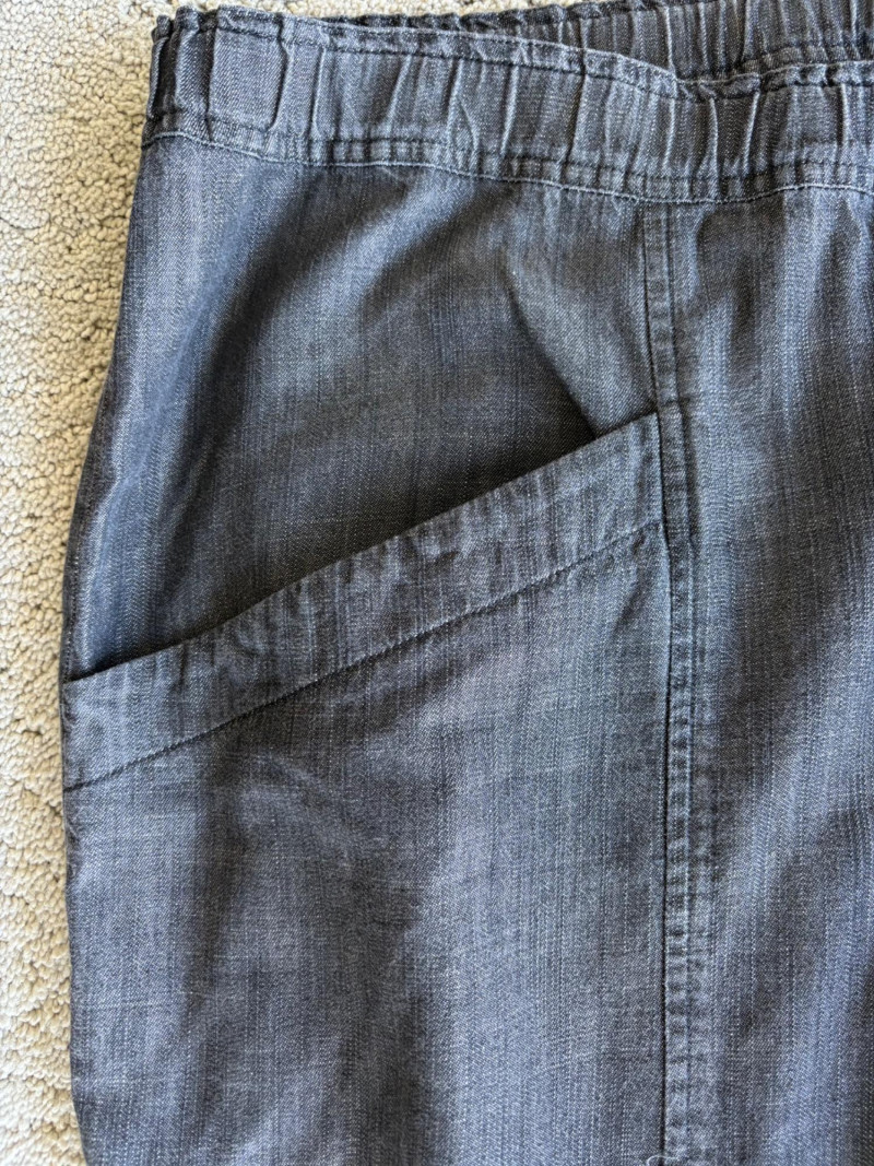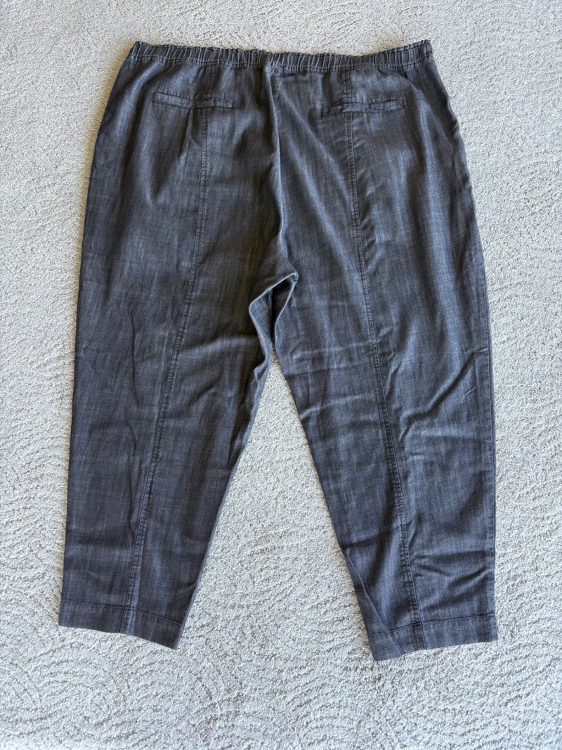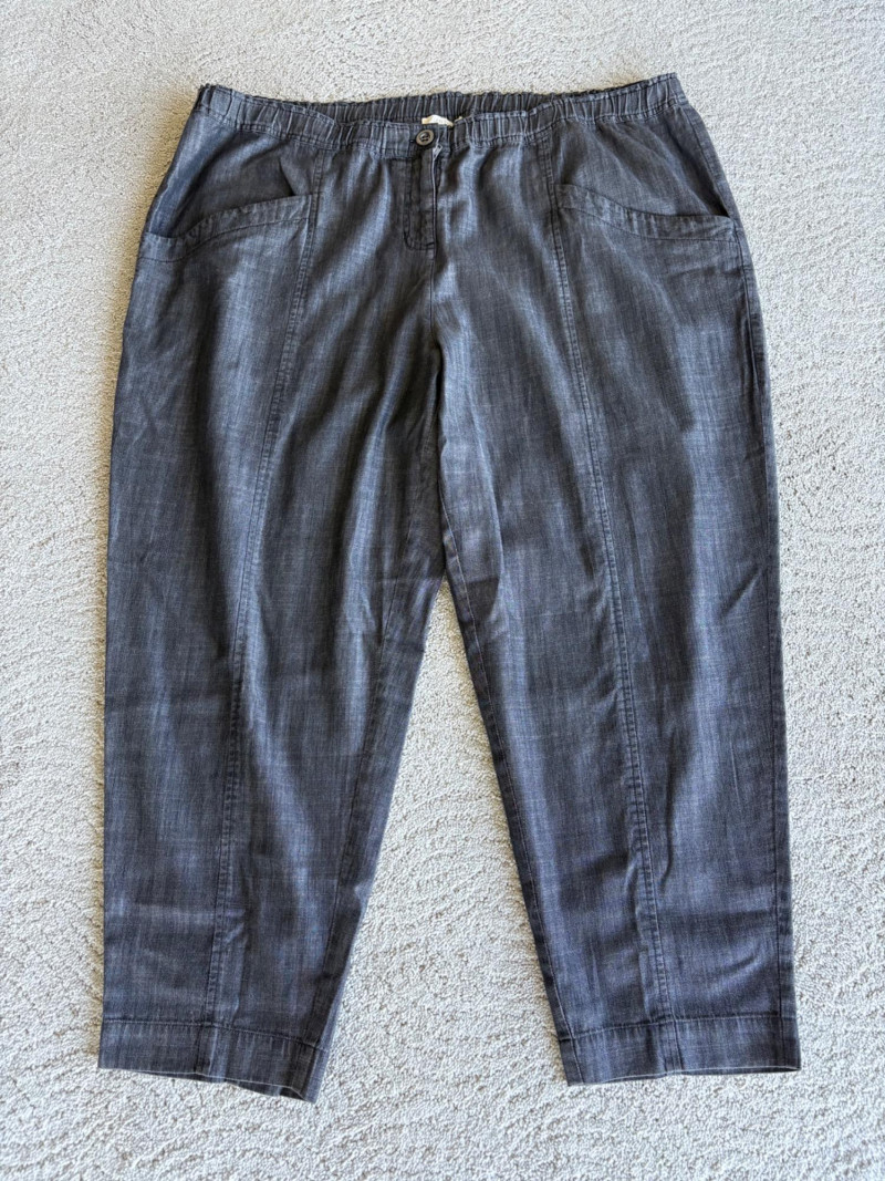 2 pairs of great summer pants from Eileen Fisher. Both measure 20" side to side at waist and are in excellent condition. Blue pair has vertical white stripes and a wide waistband that's elasticated in the back. Set-in side front pockets with very wide legs. 100% linen. 24" inseam. Size tag says XL. Grey pieced pair has roomy slanted set-in front pockets, zip fly closure, slightly tapered leg, back welted pockets, and elasticated back waistband. In excellent condition. 25" inseam. 63% Lyocell with 37% cotton. Size tag says XL.