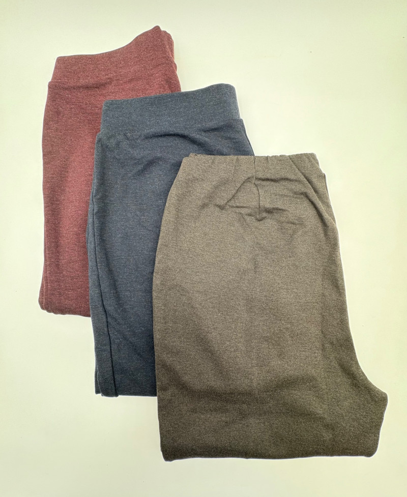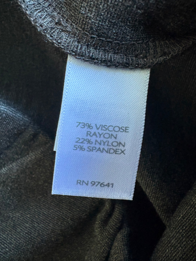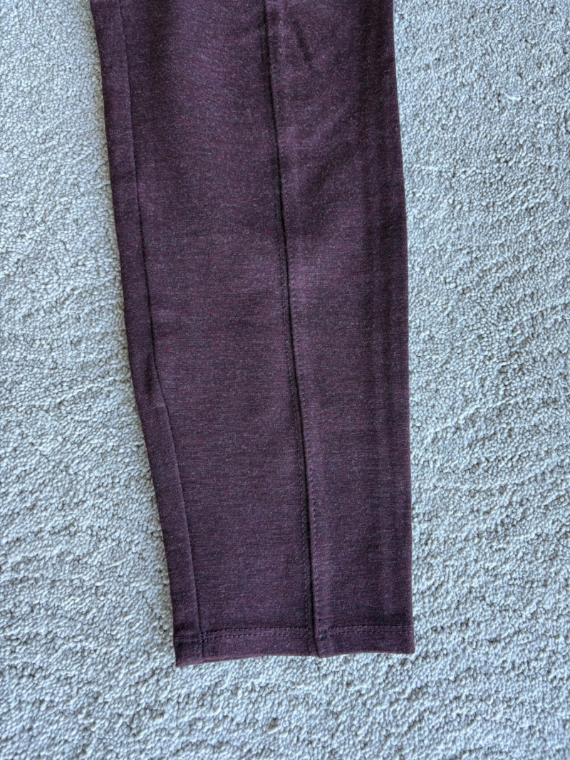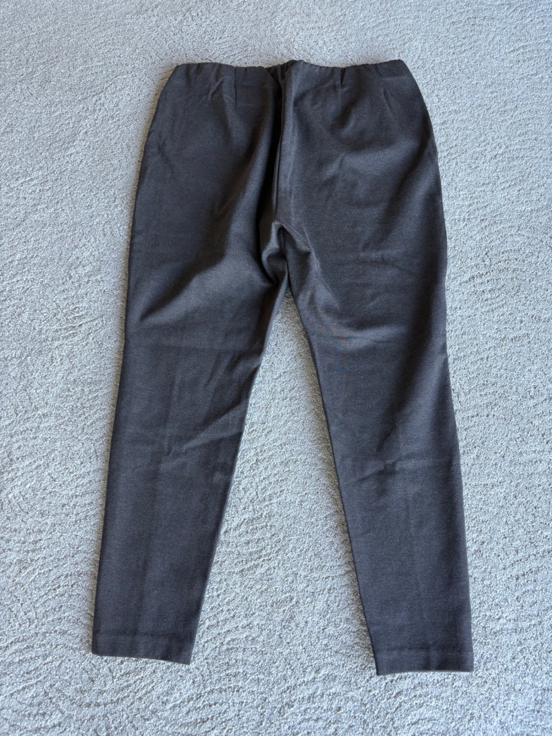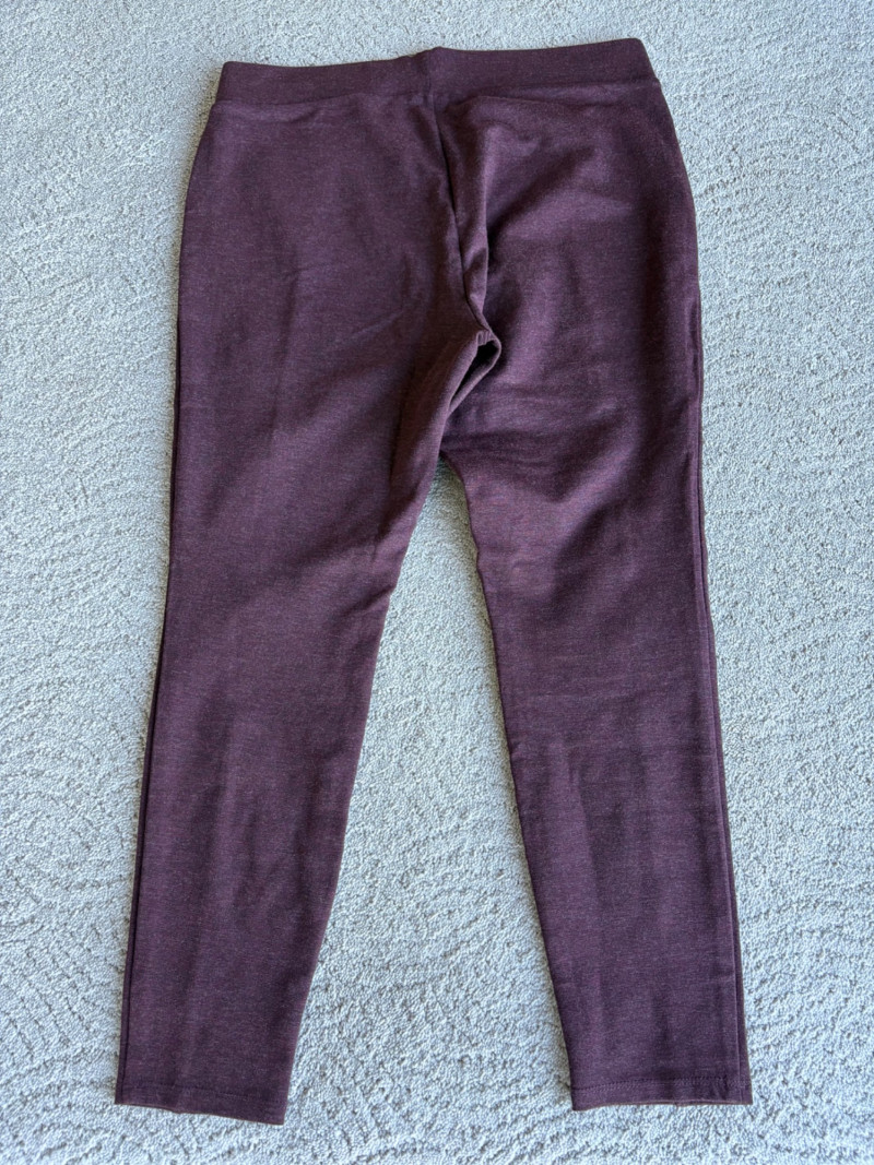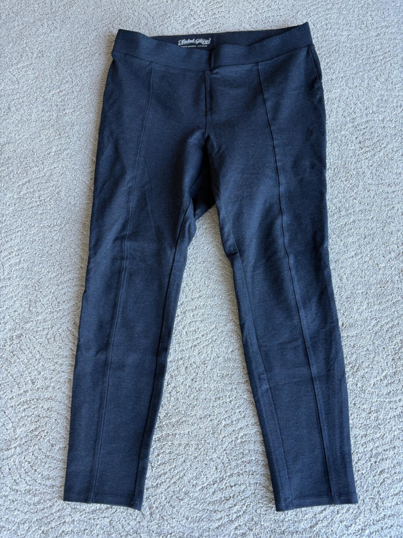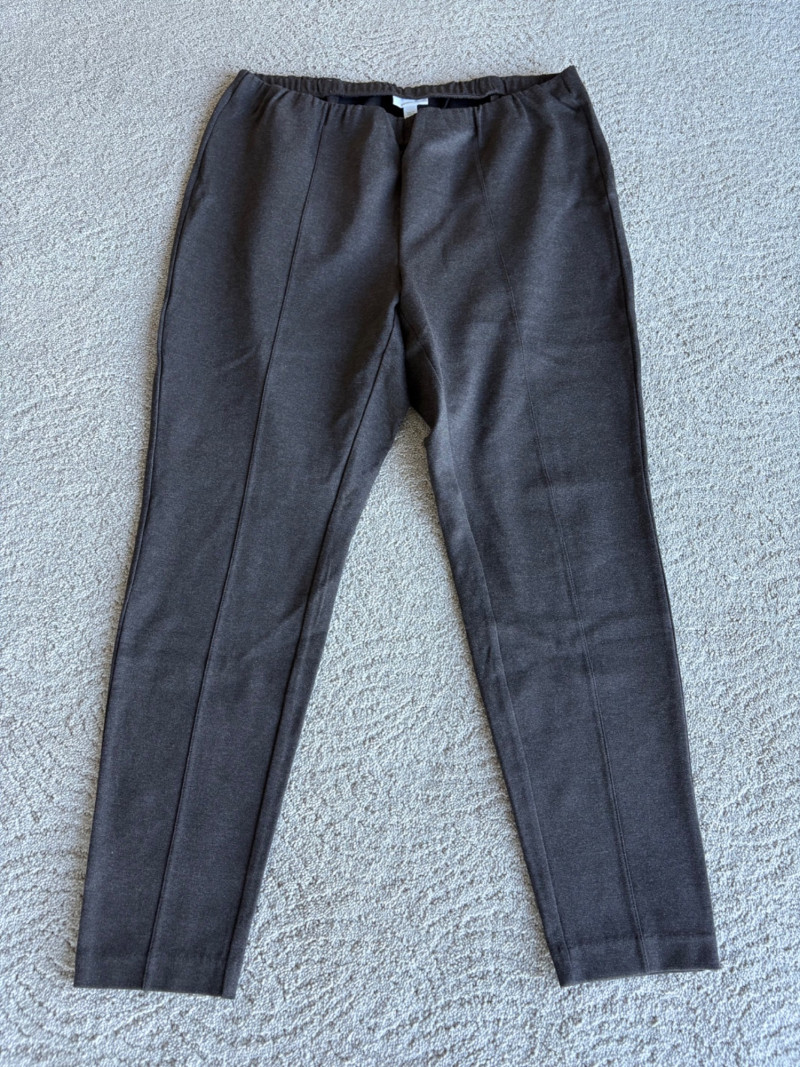 OK, we will admit stretch knits used to "yuck' us out, but they've really improved the feel and fit of ponte in particular over the past decade and now it's become a favorite of ours since it holds shape and hangs beautifully. These 3 pairs of ponte leggings/pants are a terrific layer under a light summer sweater or can transition to the fall under a top & jacket with their slim line. While they have different size tags, they all fit our client! Grey leggings from J. Jill have elasticated waist, front seaming, and back darts for better fit. Ponte is smooth, very stretchy, and very forgiving for all shapes. Excellent condition. Measures 16.5" side to side at waist with 22" inseam. 73% viscose and 23% nylon with 5% spandex, Size tag says XL. Burgundy & navy blue leggings from Faded Glory have wide elasticated waistband and front seaming. In excellent condition. 64% rayon with 43% nylon and 4% spandex. Both measure 17.5" side to side at waist. Burgundy pair has 26" inseam while blue pair has 27" Inseam. Size tags on both say L (12-14).