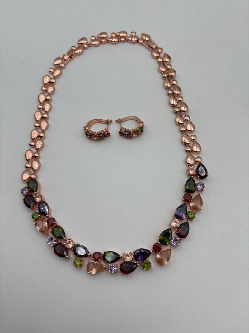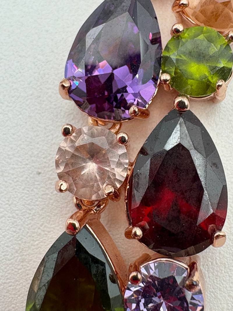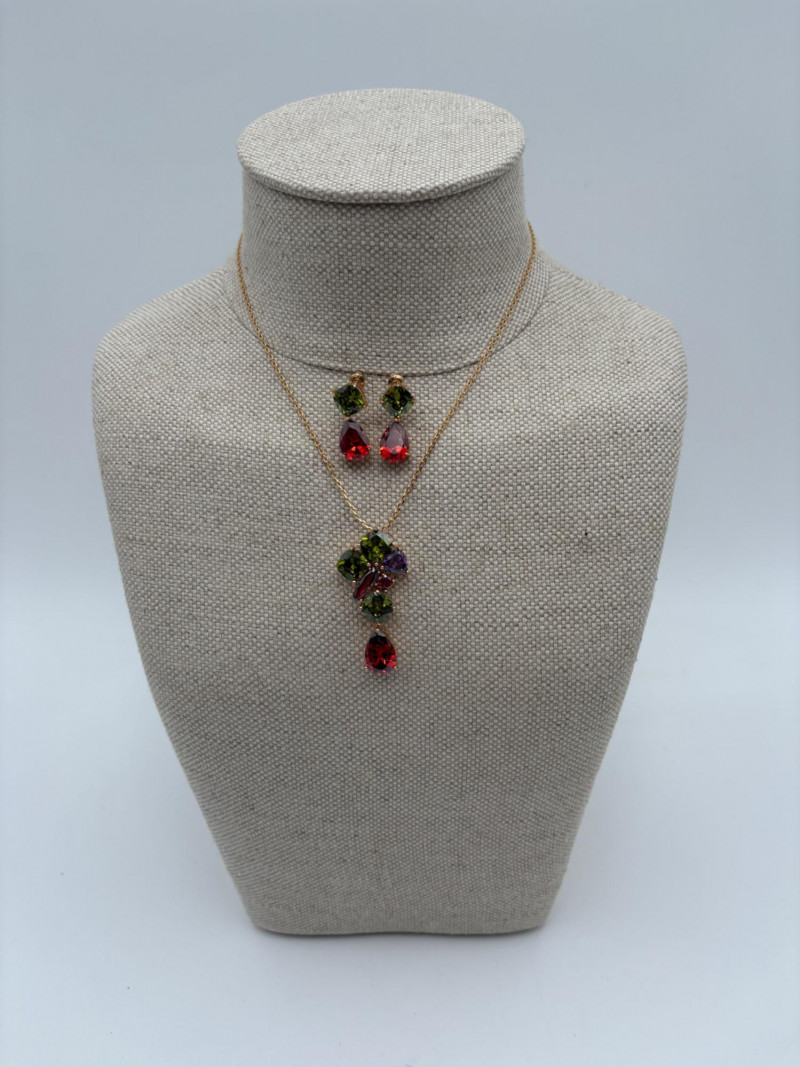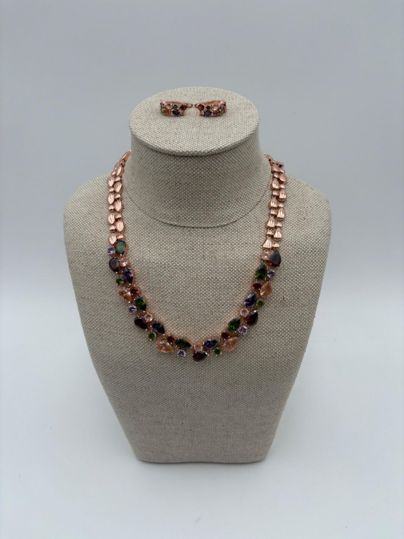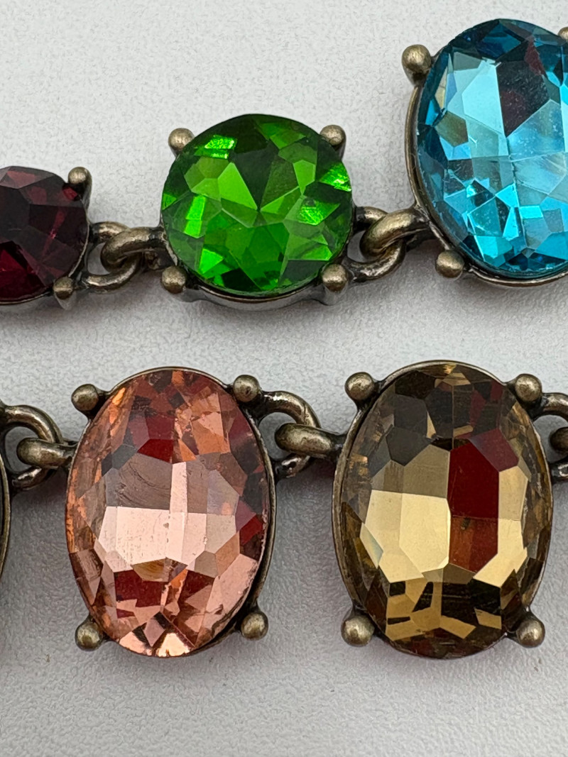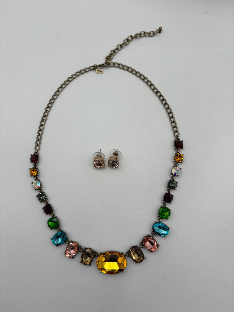3 sparkly rhinestone necklaces with matching rhinestone earrings. Silver tone chain necklace has bright rhinestones in various shapes with the largest gold one in the middle measuring about 1" across. Necklace measures 23' L with lobster claw clasp. Square pierced earrings continue the sparkly theme. From Logo. Necklace in pinkish-tone metal has more subdued stones - sparkly without being flashy. Measures 20" with a fold-over clasp.. Matching pierced earrings.in the same pinkish metal with stones on a smaller scale. No maker mark. Necklace on gold-tone chain has pendant cluster of red, green & purple rhinestones. Measures 16" L. Matching earrings with red & green rhinestones. No maker mark.