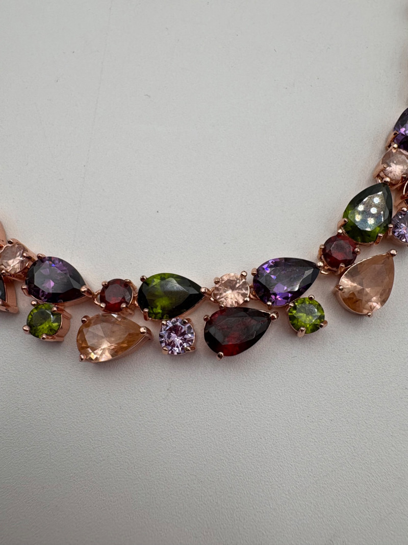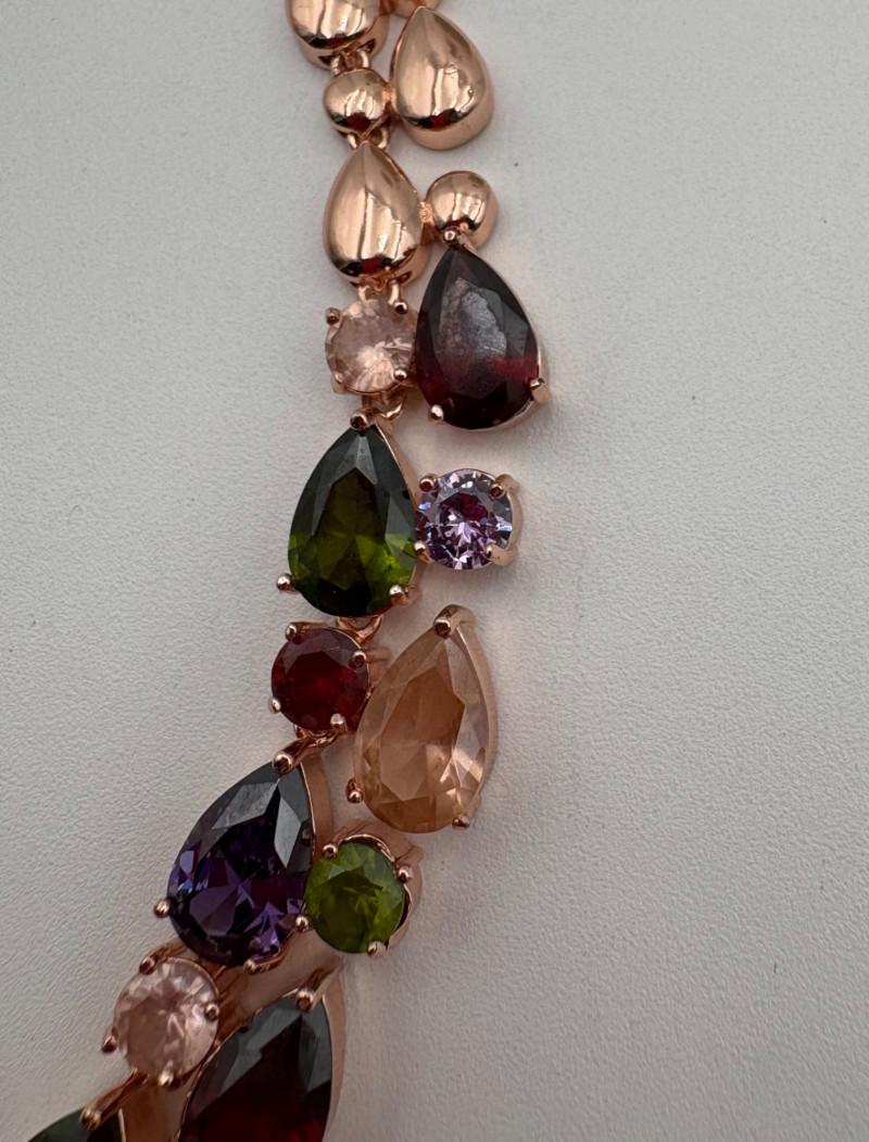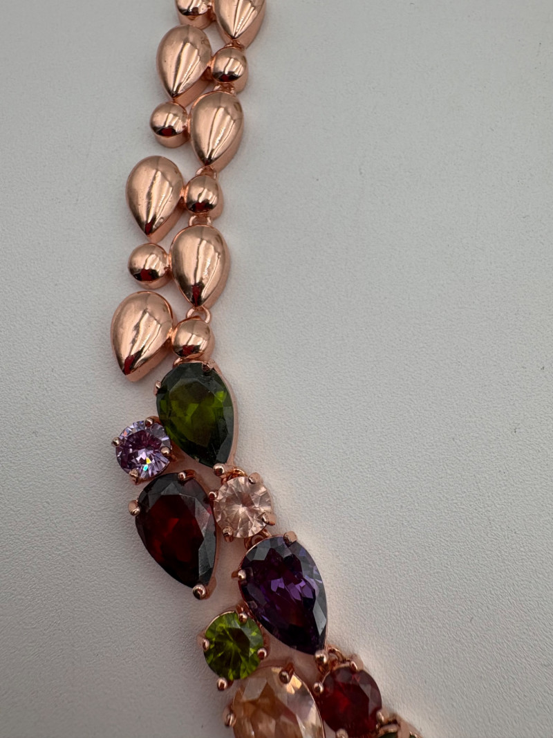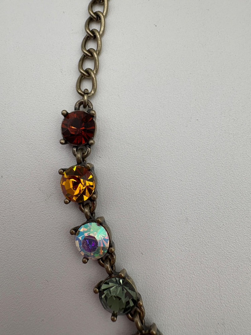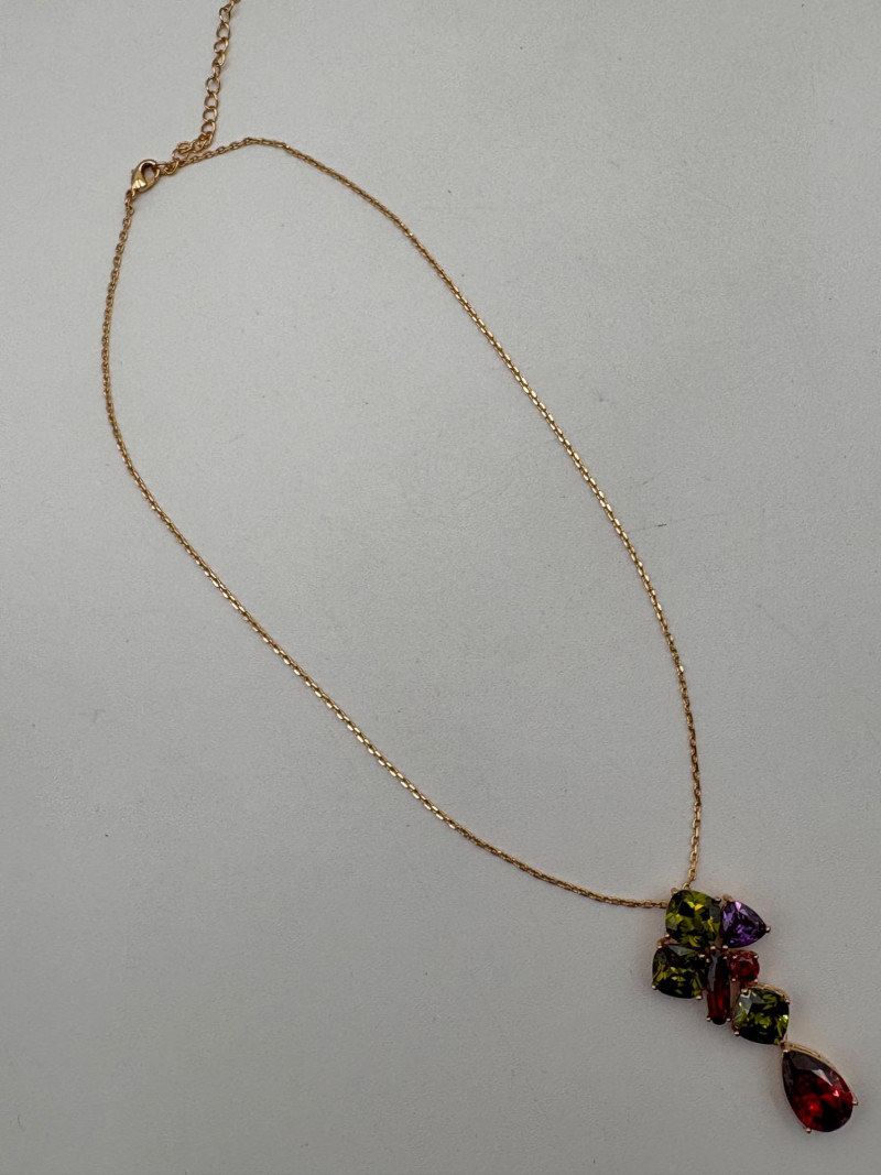 3 sparkly rhinestone necklaces with matching rhinestone earrings. Silver tone chain necklace has bright rhinestones in various shapes with the largest gold one in the middle measuring about 1" across. Necklace measures 23' L with lobster claw clasp. Square pierced earrings continue the sparkly theme. From Logo. Necklace in pinkish-tone metal has more subdued stones - sparkly without being flashy. Measures 20" with a fold-over clasp.. Matching pierced earrings.in the same pinkish metal with stones on a smaller scale. No maker mark. Necklace on gold-tone chain has pendant cluster of red, green & purple rhinestones. Measures 16" L. Matching earrings with red & green rhinestones. No maker mark.