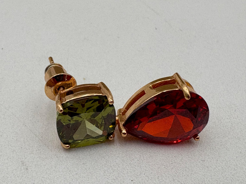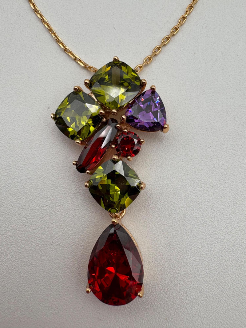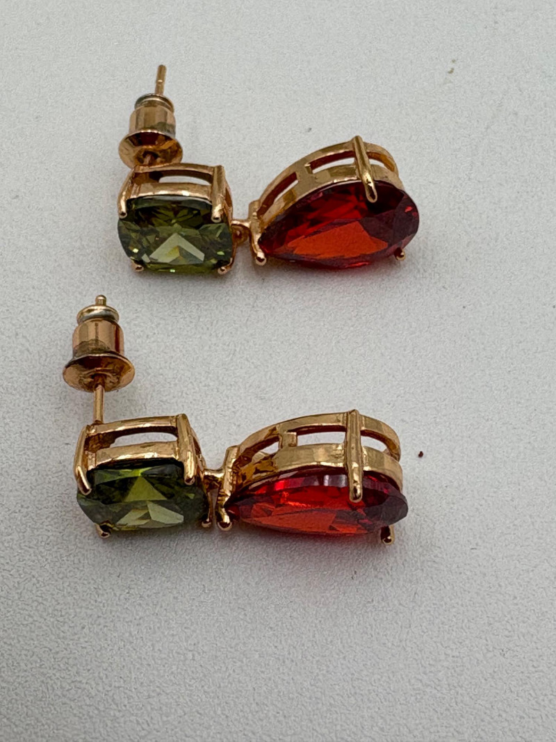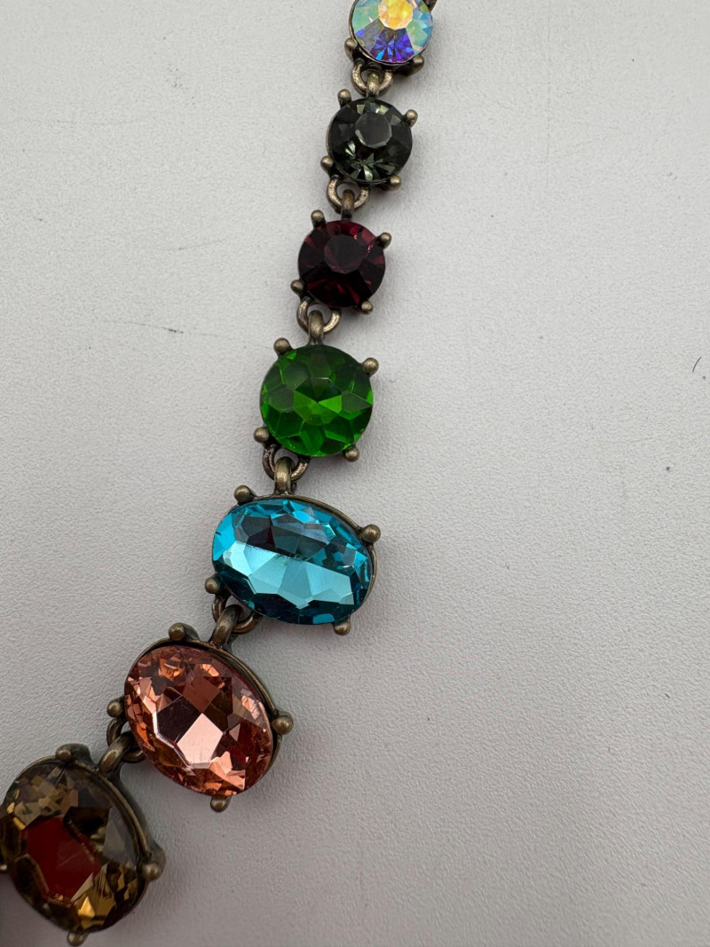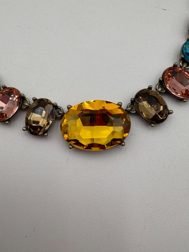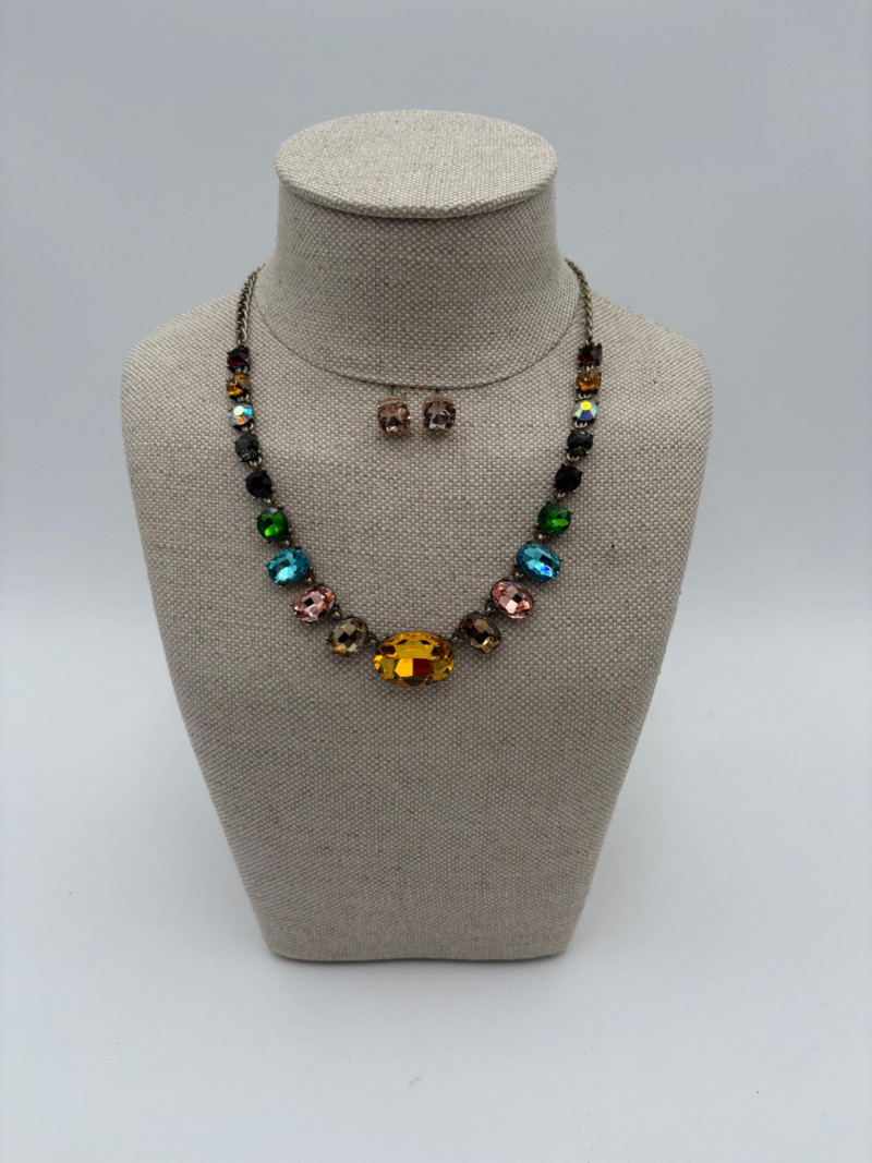 3 sparkly rhinestone necklaces with matching rhinestone earrings. Silver tone chain necklace has bright rhinestones in various shapes with the largest gold one in the middle measuring about 1" across. Necklace measures 23' L with lobster claw clasp. Square pierced earrings continue the sparkly theme. From Logo. Necklace in pinkish-tone metal has more subdued stones - sparkly without being flashy. Measures 20" with a fold-over clasp.. Matching pierced earrings.in the same pinkish metal with stones on a smaller scale. No maker mark. Necklace on gold-tone chain has pendant cluster of red, green & purple rhinestones. Measures 16" L. Matching earrings with red & green rhinestones. No maker mark.