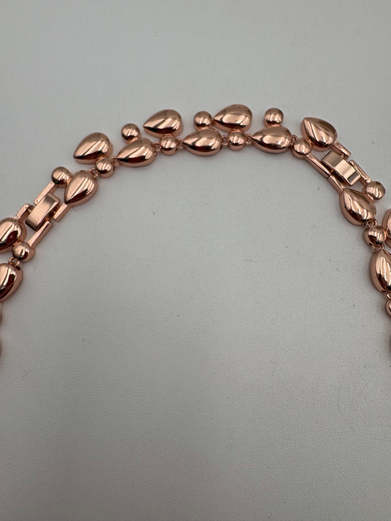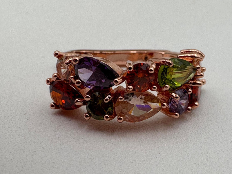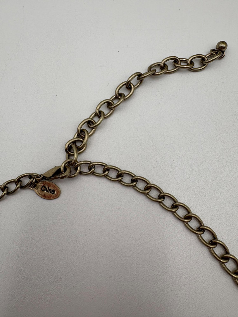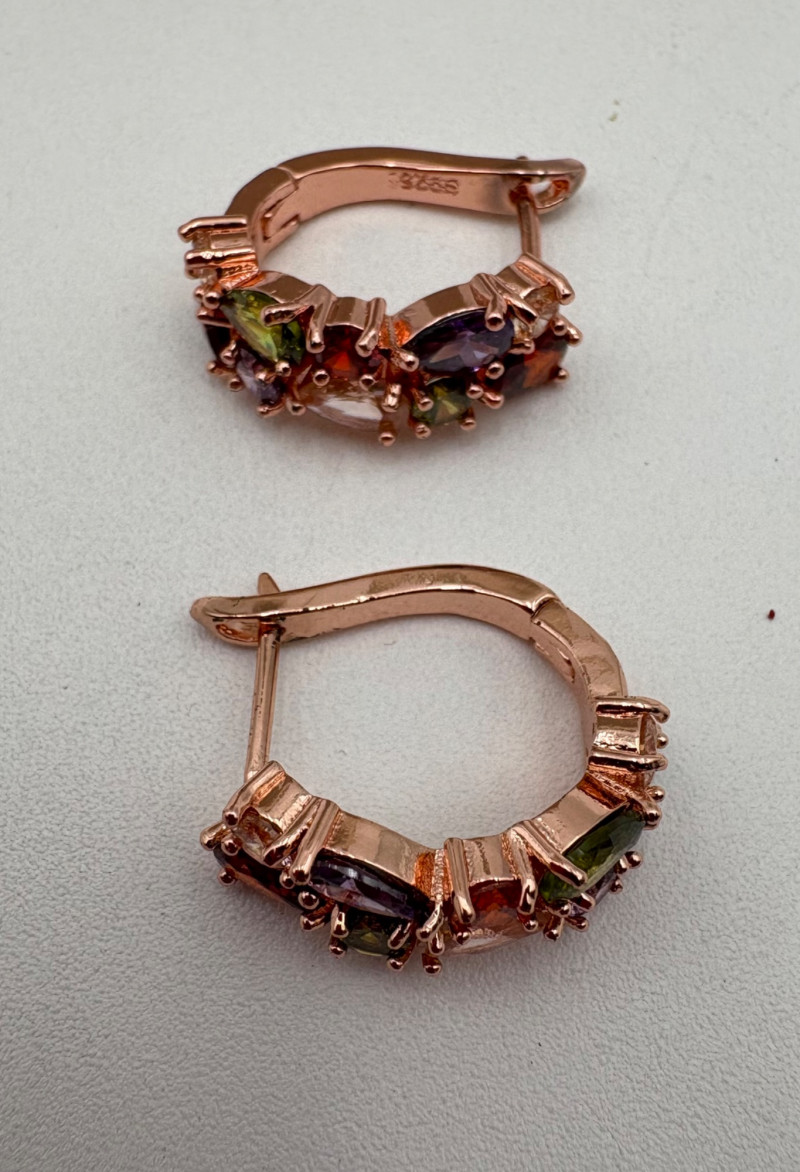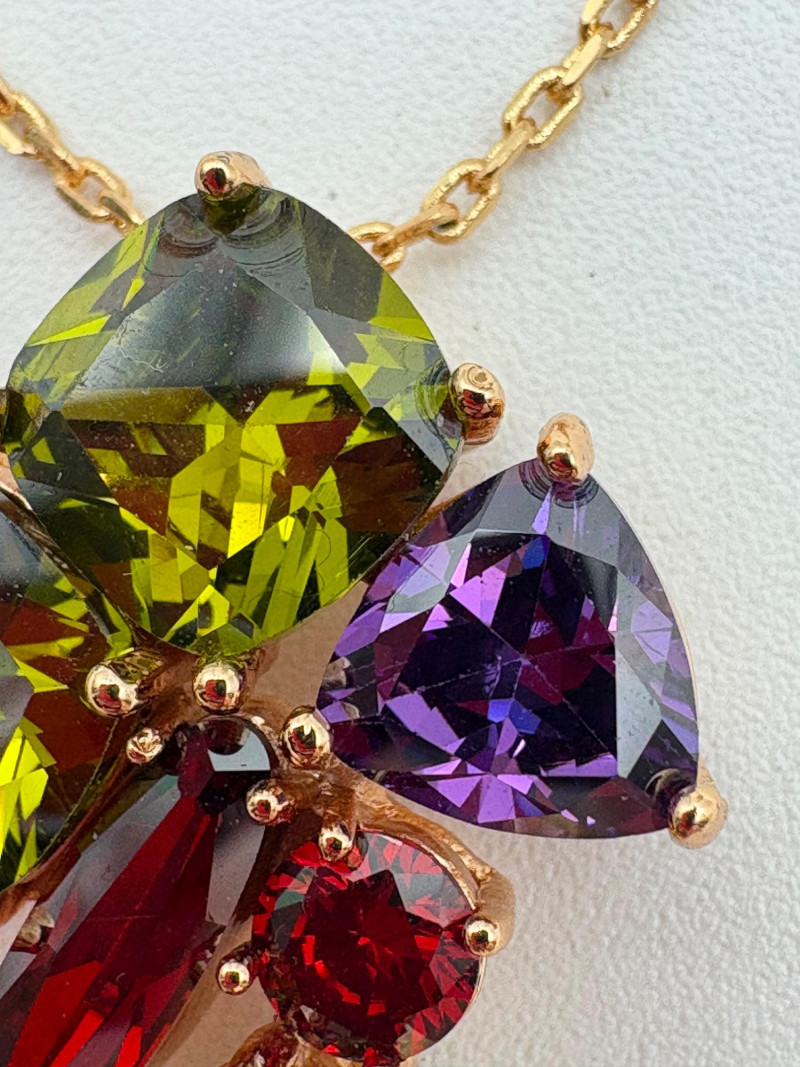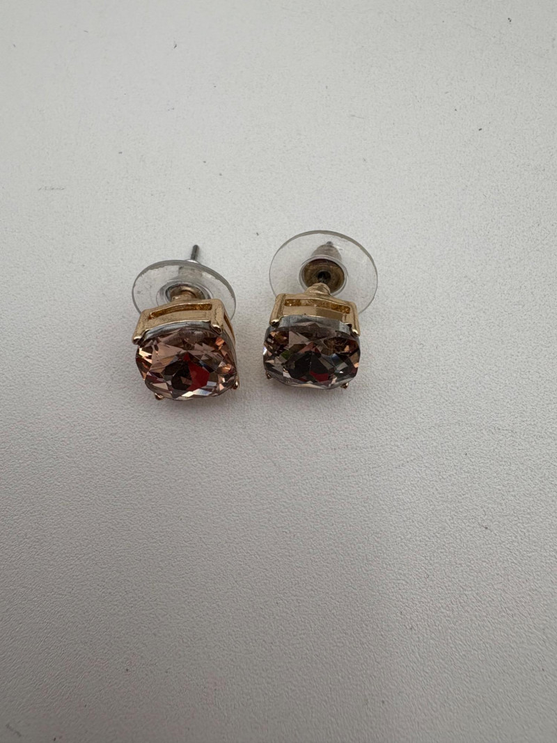 3 sparkly rhinestone necklaces with matching rhinestone earrings. Silver tone chain necklace has bright rhinestones in various shapes with the largest gold one in the middle measuring about 1" across. Necklace measures 23' L with lobster claw clasp. Square pierced earrings continue the sparkly theme. From Logo. Necklace in pinkish-tone metal has more subdued stones - sparkly without being flashy. Measures 20" with a fold-over clasp.. Matching pierced earrings.in the same pinkish metal with stones on a smaller scale. No maker mark. Necklace on gold-tone chain has pendant cluster of red, green & purple rhinestones. Measures 16" L. Matching earrings with red & green rhinestones. No maker mark.