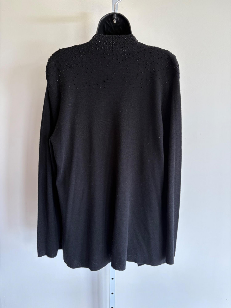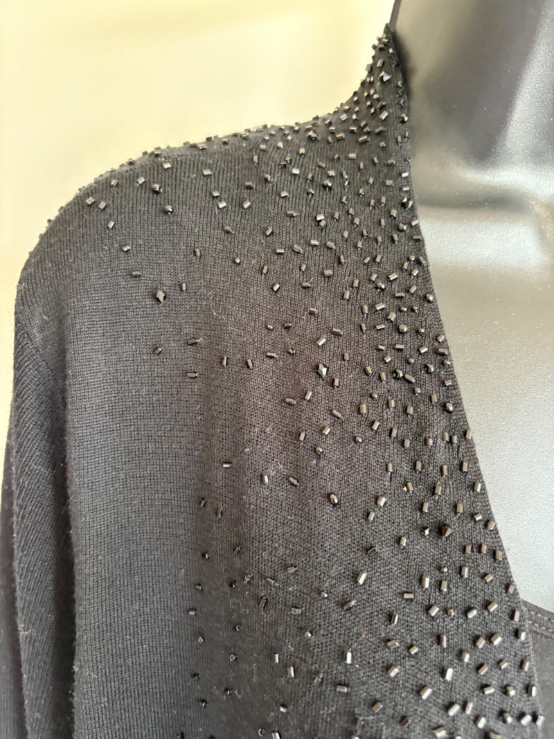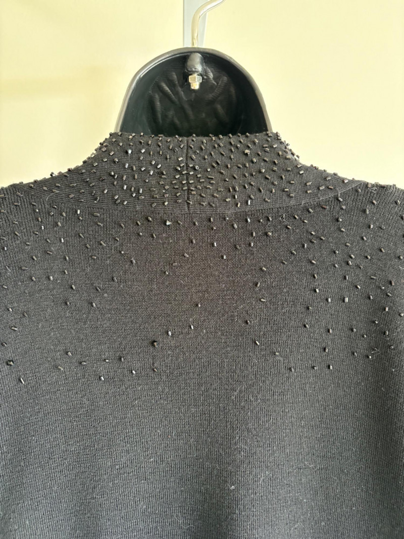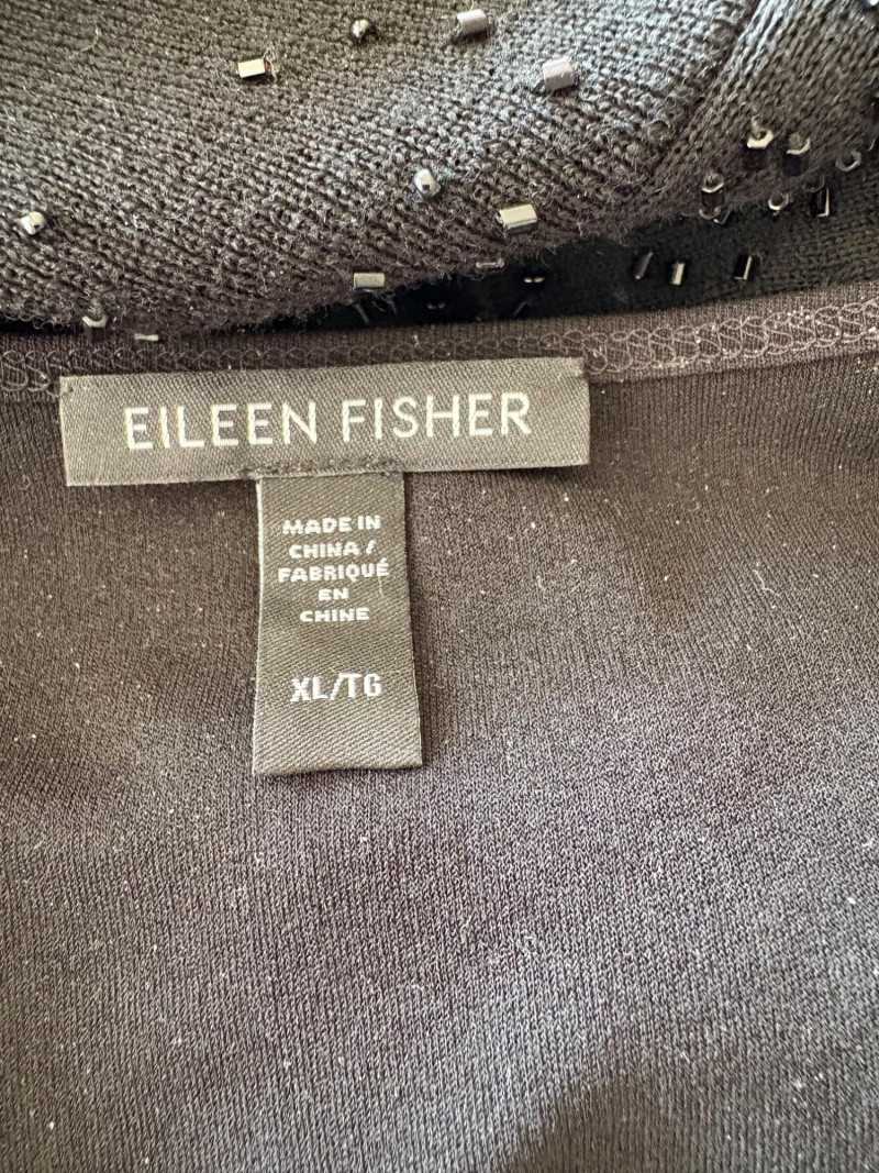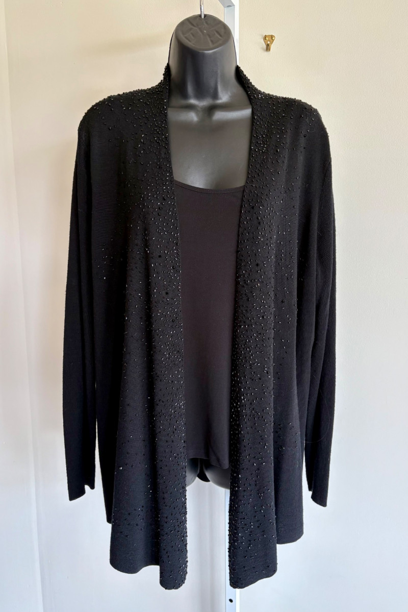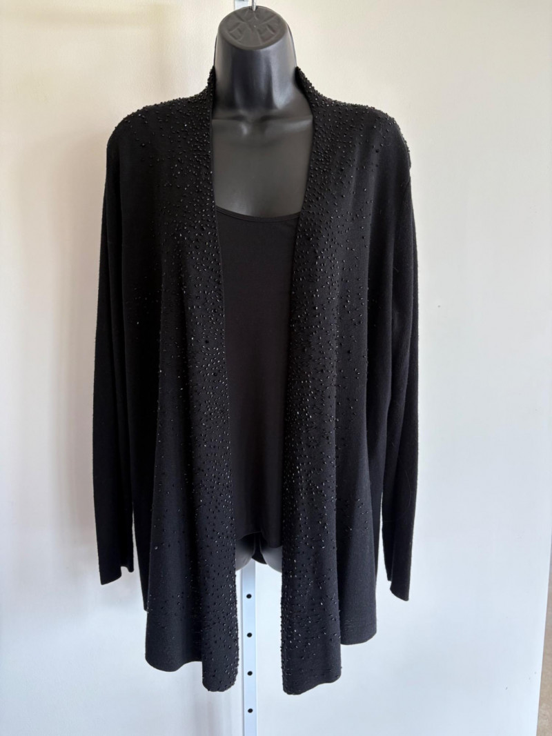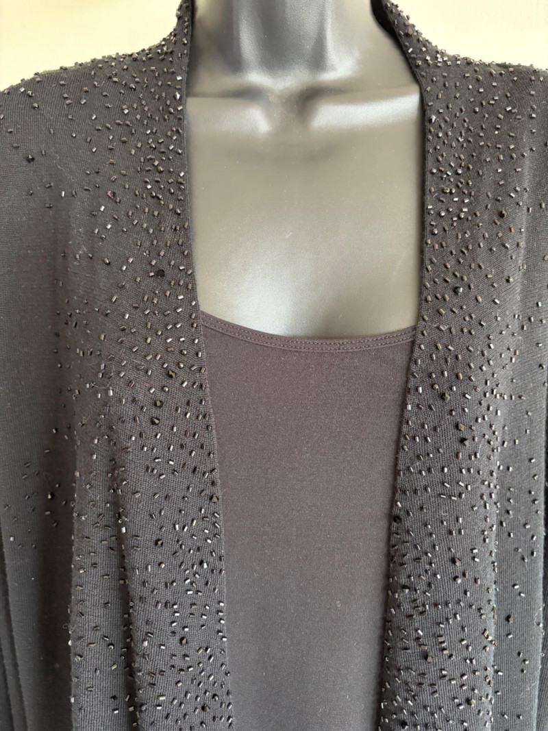 Great duo - black dressy cardigan and silk shell from Eileen Fisher for warmer evenings when you want to be covered but not stodgy! Cardigan is hand-beaded with small shaped beads down the front opening, over the shoulders, and onto the back to shoulder blade level. Lightweight smooth weave knit out of 100% merino wool. In excellent condition. Measures 23" pit to pit and 27.5" from back neckline to bottom hem. Size tag says XL. Black sleeveless shell in 100% silk with great fall to the fabric. In excellent condition. Measures 21" pit to pit and 23" from shoulder strap to bottom hem. Size tag says XL.