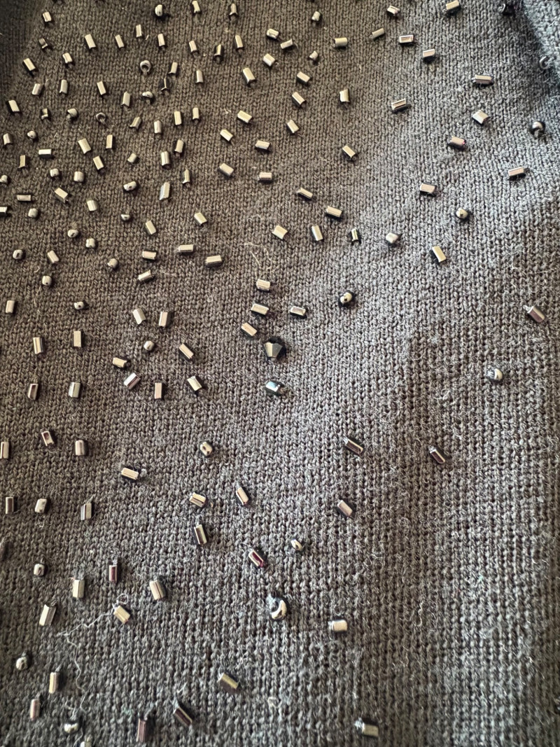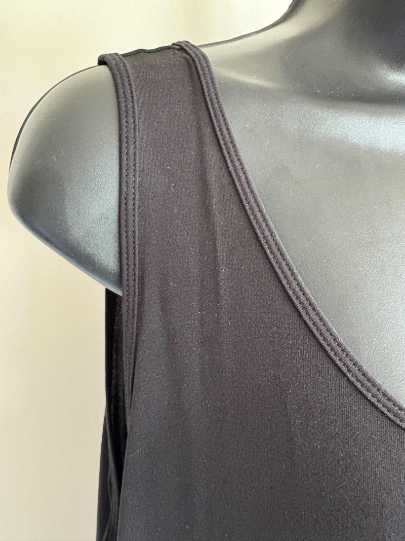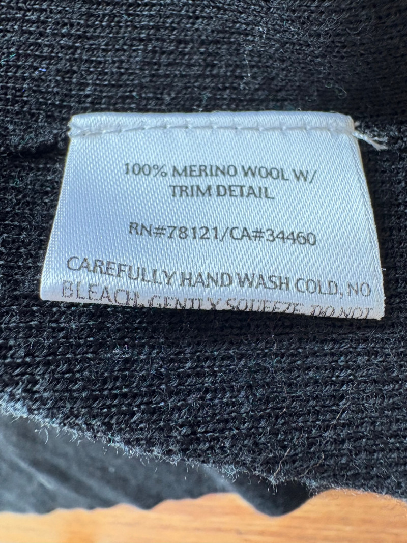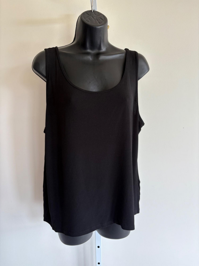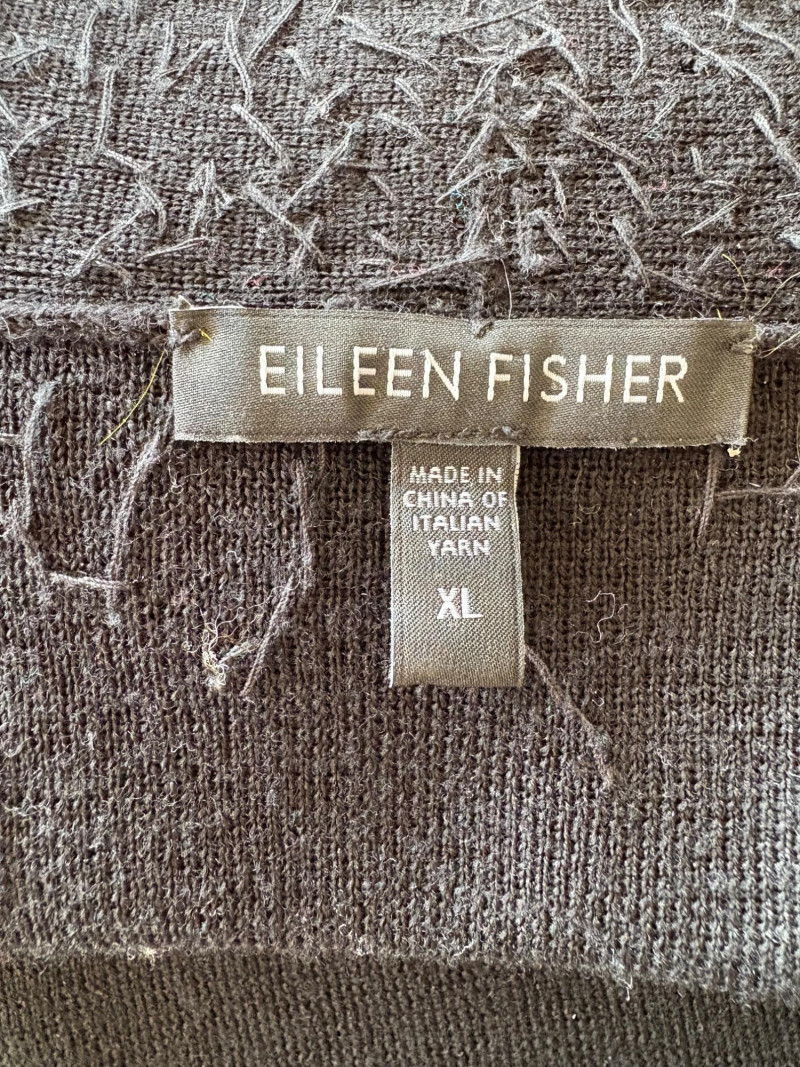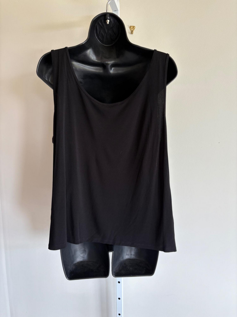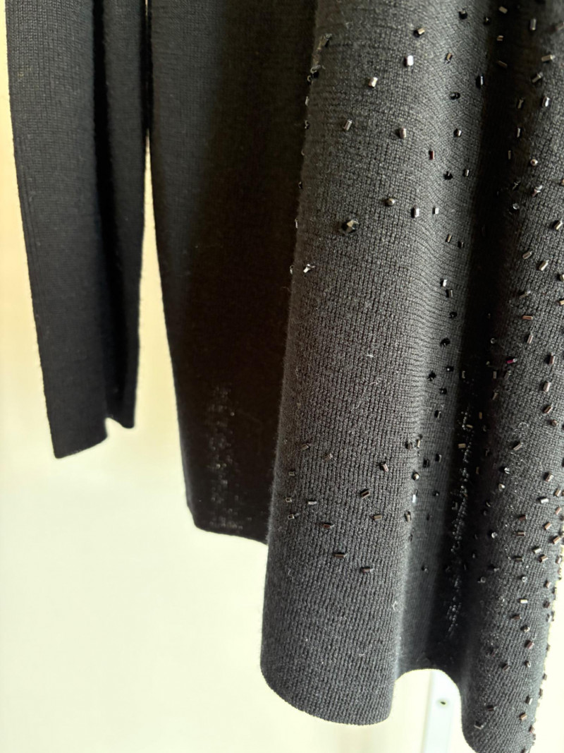 Great duo - black dressy cardigan and silk shell from Eileen Fisher for warmer evenings when you want to be covered but not stodgy! Cardigan is hand-beaded with small shaped beads down the front opening, over the shoulders, and onto the back to shoulder blade level. Lightweight smooth weave knit out of 100% merino wool. In excellent condition. Measures 23" pit to pit and 27.5" from back neckline to bottom hem. Size tag says XL. Black sleeveless shell in 100% silk with great fall to the fabric. In excellent condition. Measures 21" pit to pit and 23" from shoulder strap to bottom hem. Size tag says XL.