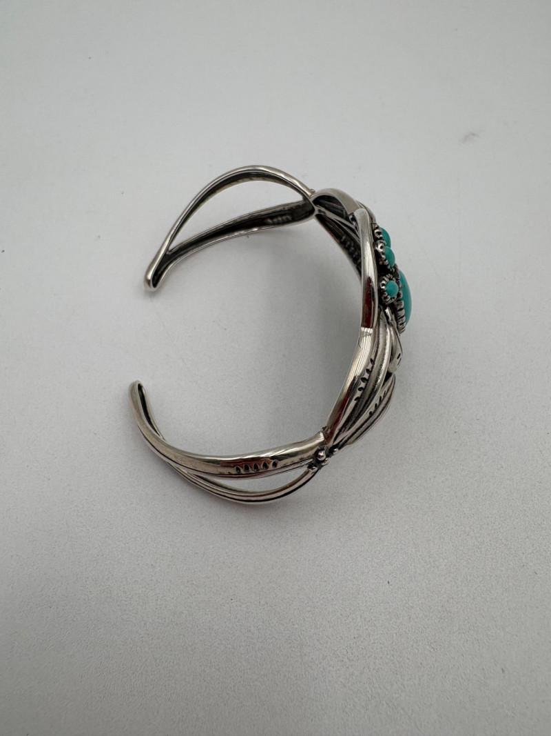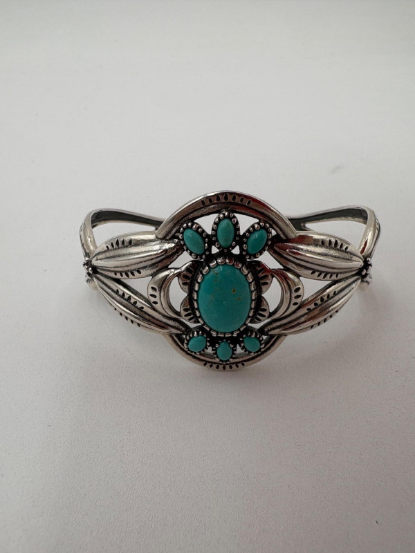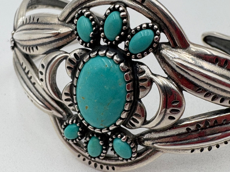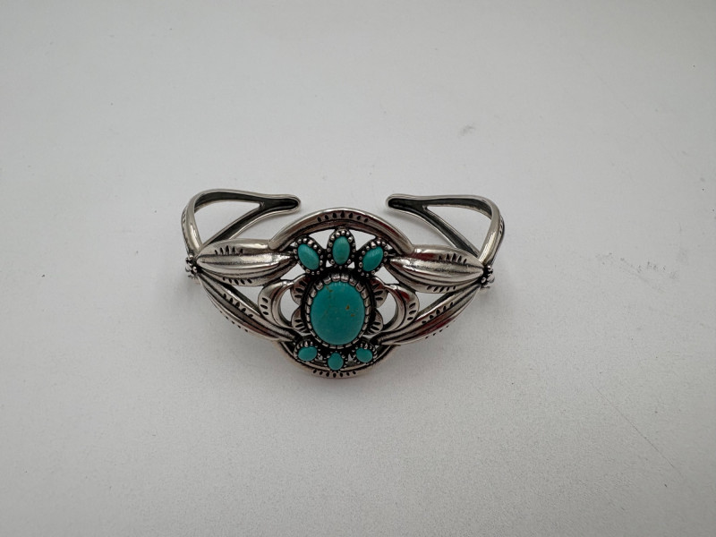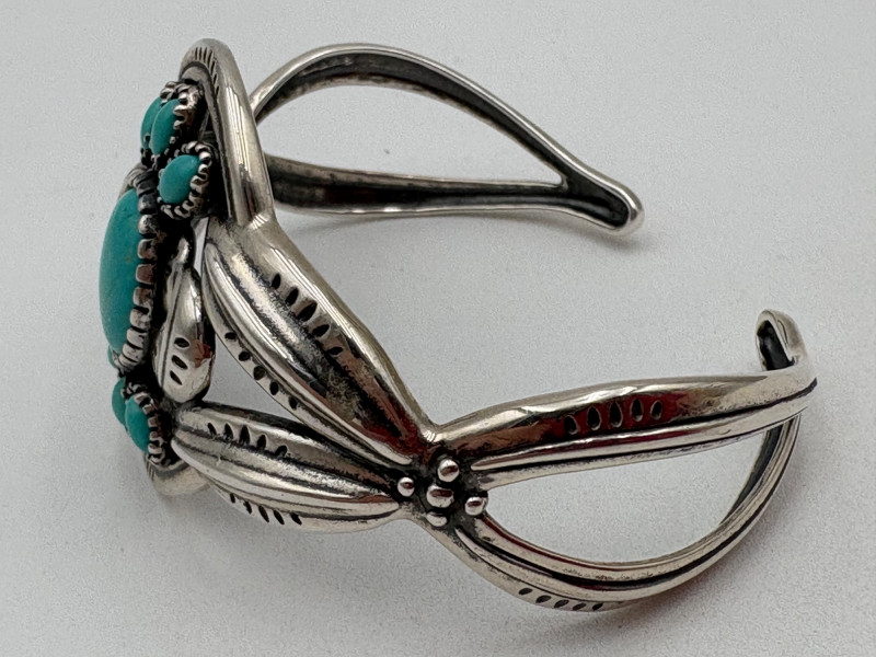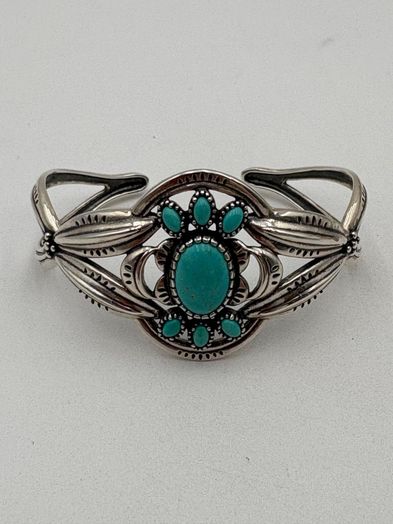 Southwestern style sterling silver (.925) cuff bracelet from the "Sleeping Beauty" series by New Mexico jeweler Carolyn Pollack. Center larger turquoise stone surrounded by 6 smaller stones with bezel setting. Medium size - should fit most wrists. Weighs 26 grams with stones.