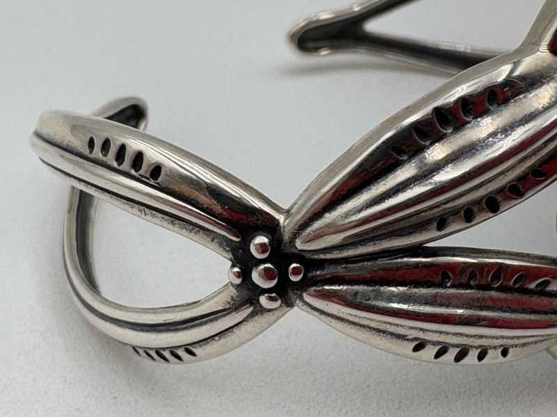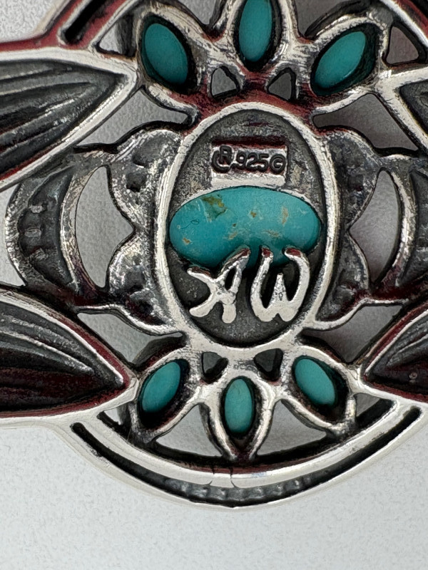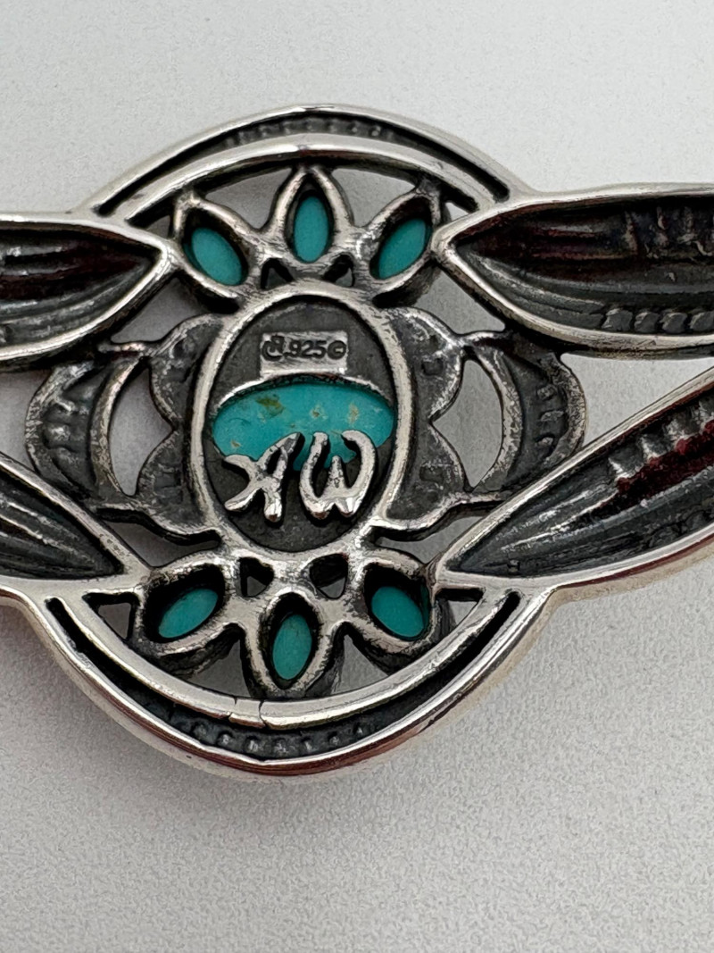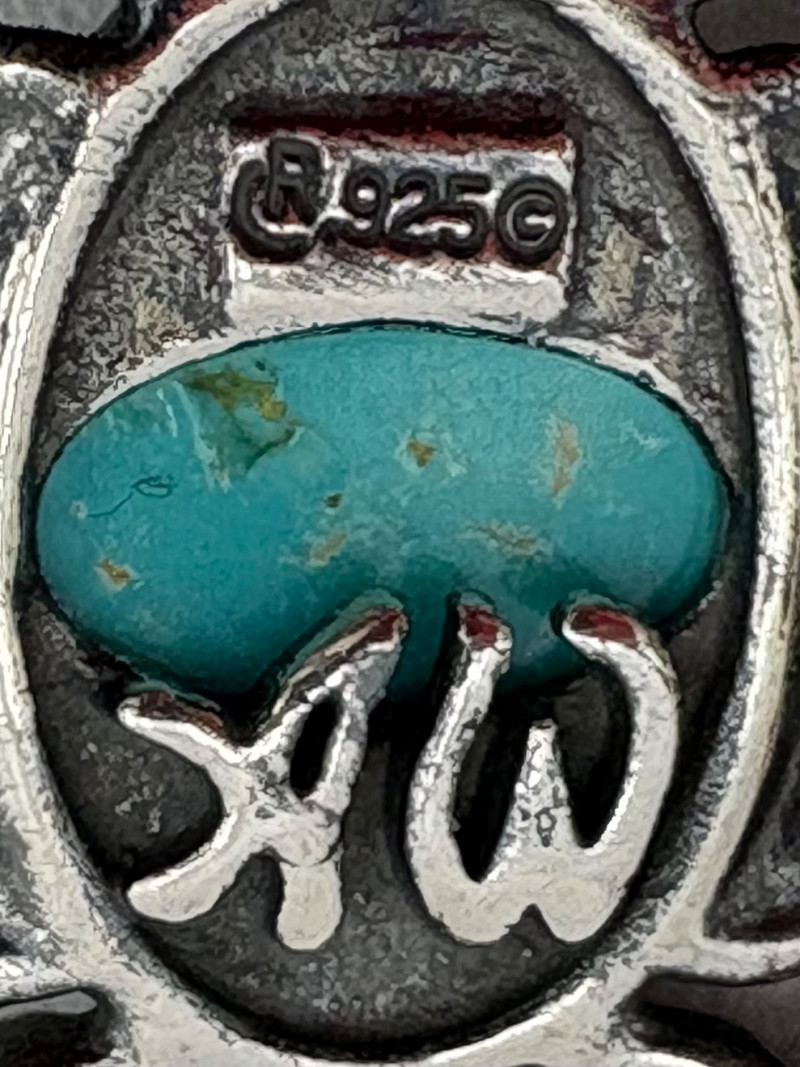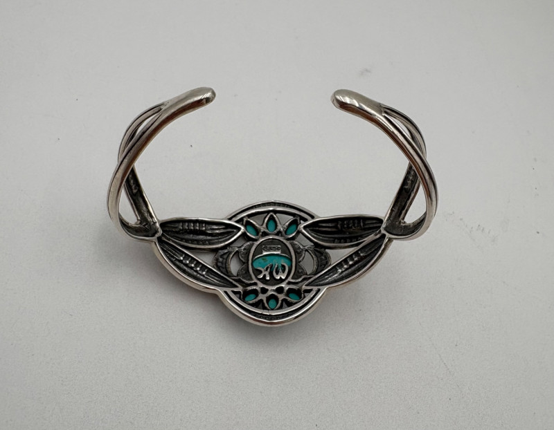 Southwestern style sterling silver (.925) cuff bracelet from the "Sleeping Beauty" series by New Mexico jeweler Carolyn Pollack. Center larger turquoise stone surrounded by 6 smaller stones with bezel setting. Medium size - should fit most wrists. Weighs 26 grams with stones.