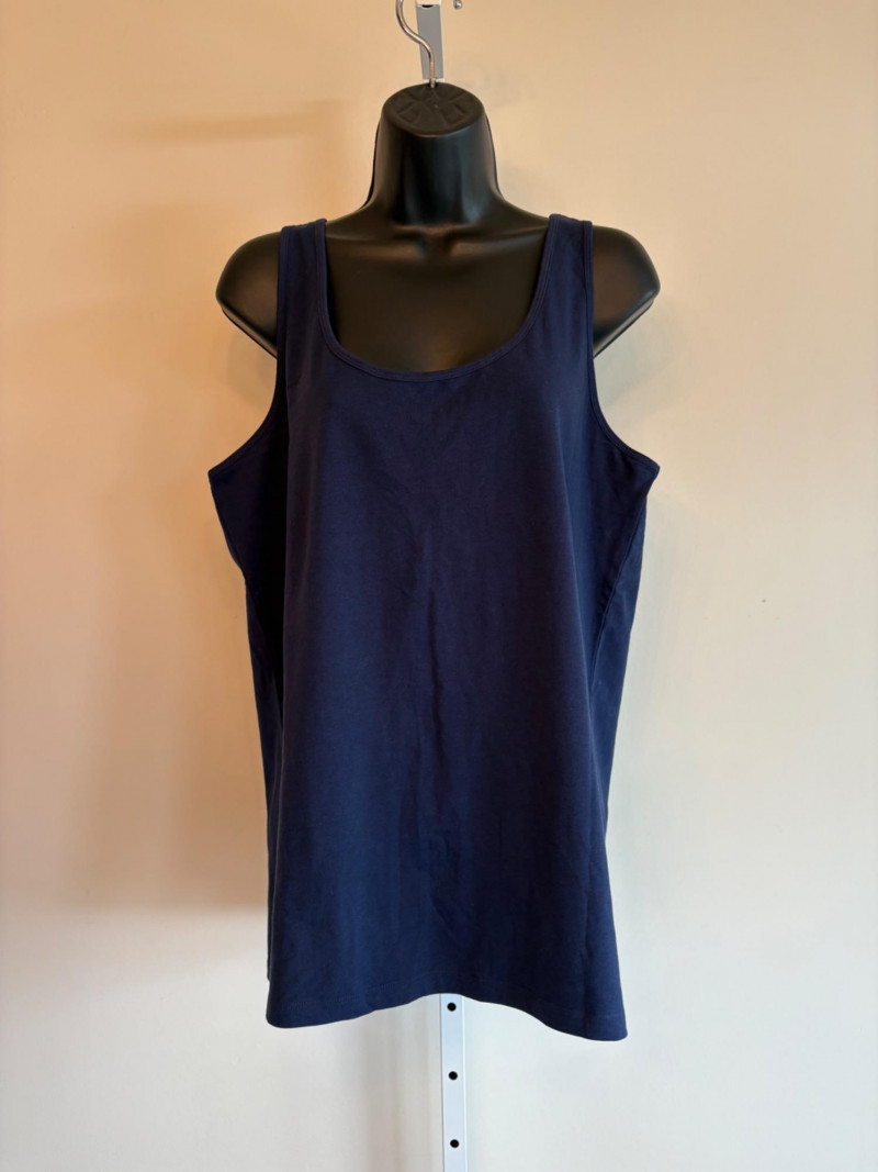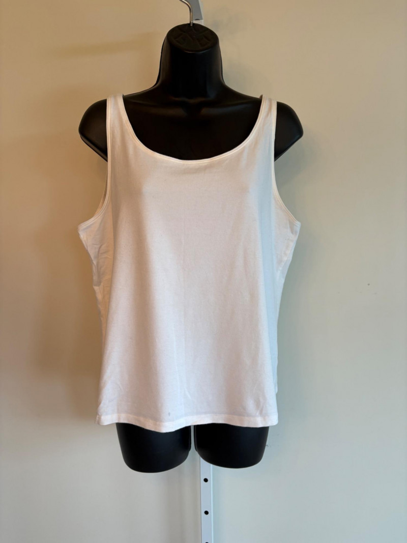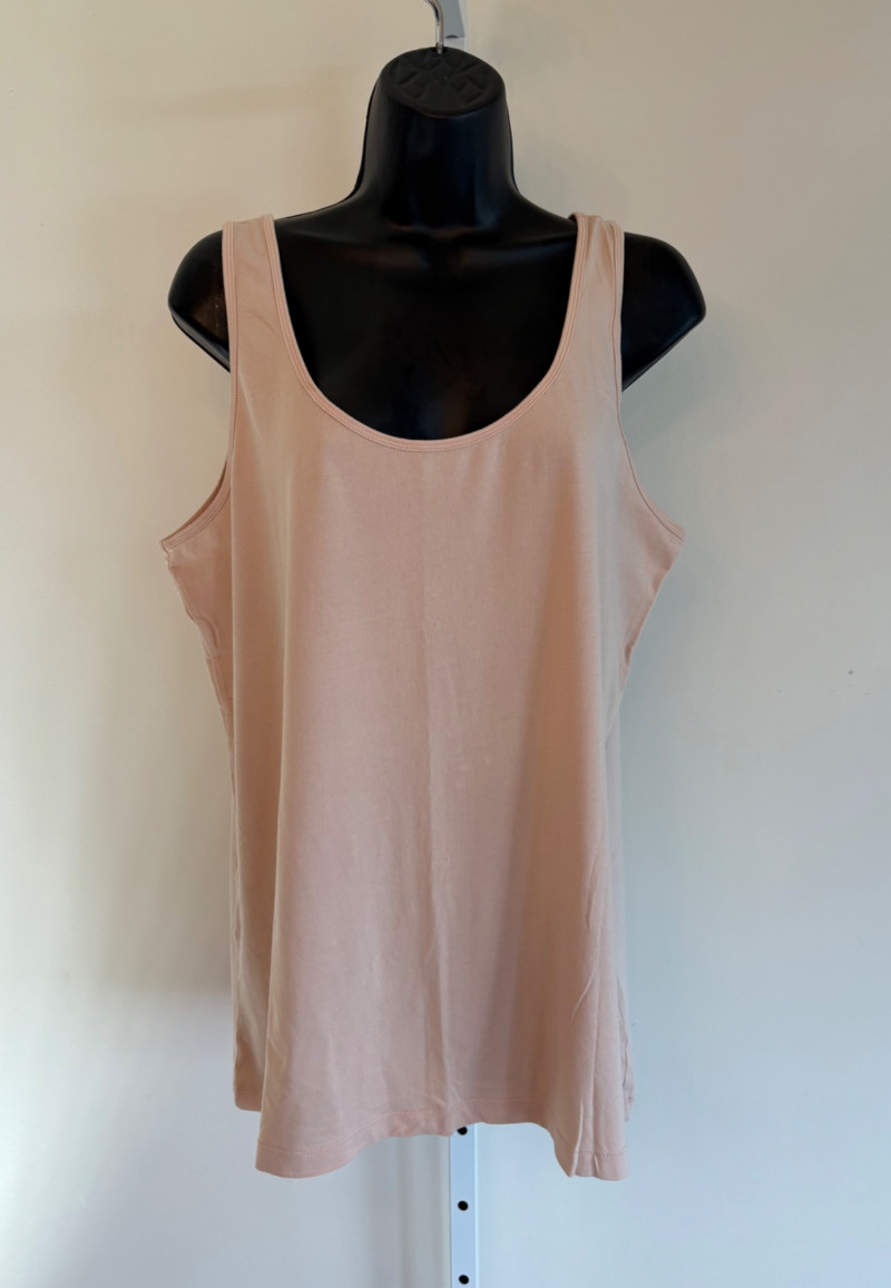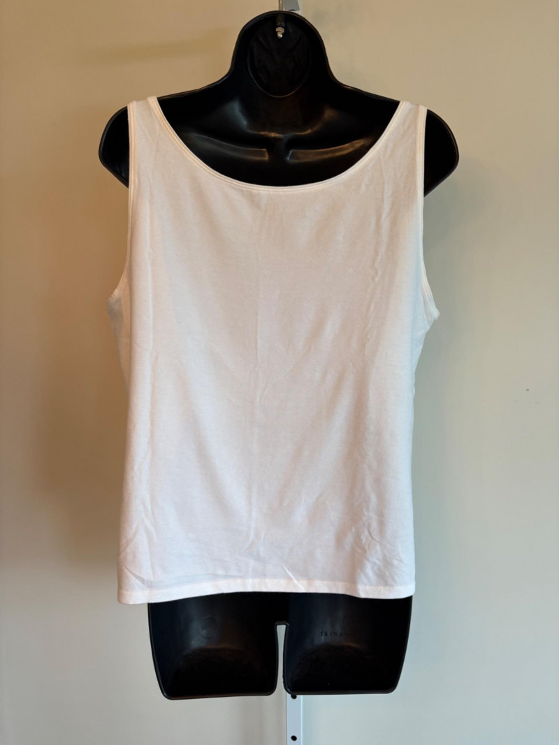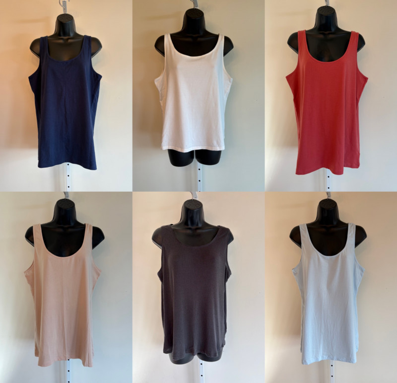 6 great tanks from Eileen Fisher and Old Navy (vintage Old Navy when the quality was still good!). All tanks measure 20" pit to pit with length that varies from 22.5" to 27" from the shoulder to the hem. All are in very good to excellent condition. White tank from Eileen Fisher is 90% organic cotton and 10% spandex. 22.5" L. Size tag says L. Grey tank from Eileen Fisher is 70% silk with 30% cotton. 23" L. Size tag says XL. Pinkish-beige, pale blue, pink-puce, and blue tanks from Old Navy are 95% cotton with 5% spandex. All measure 27" L. Sze tags say XL.