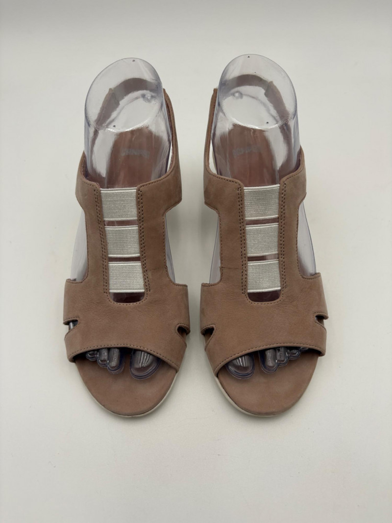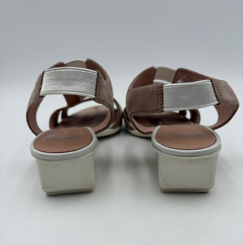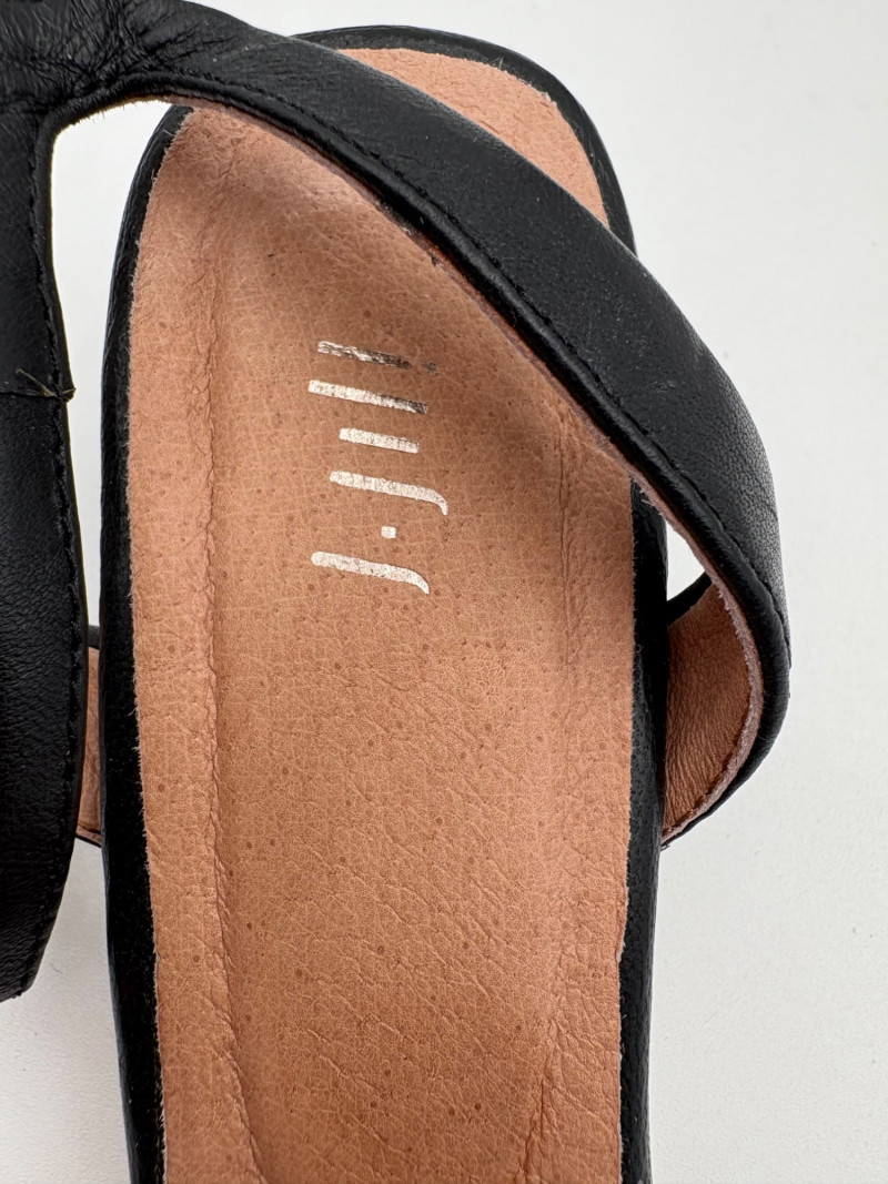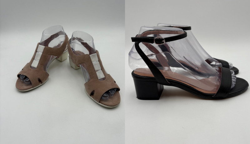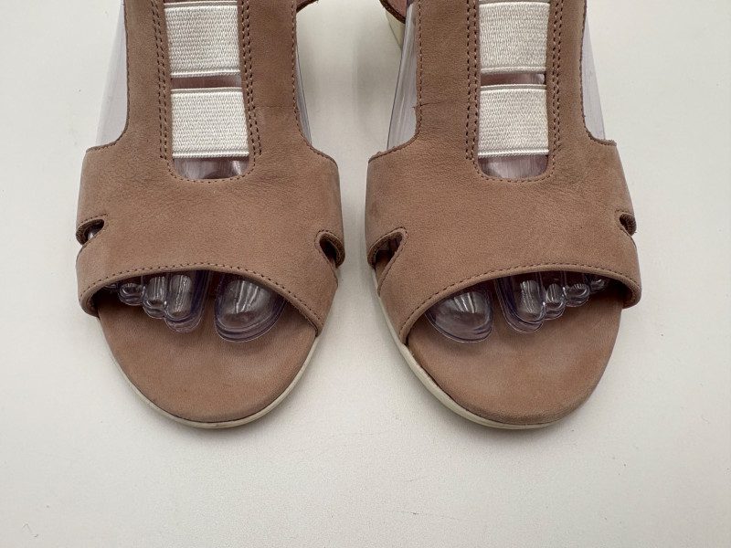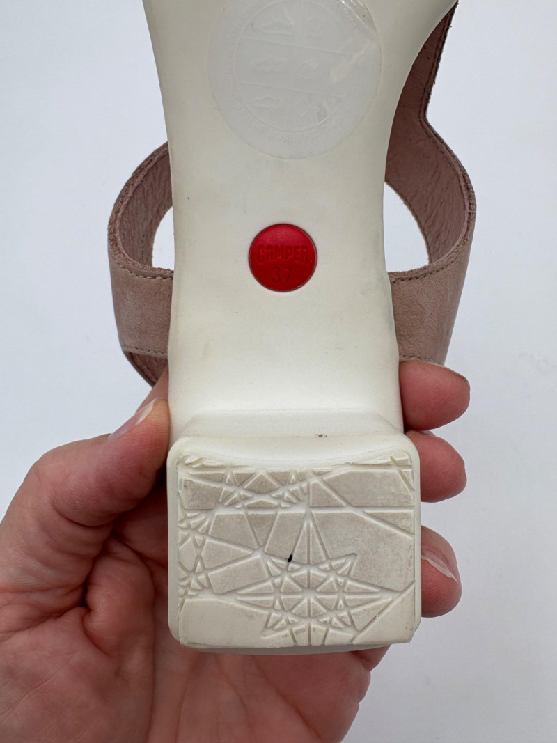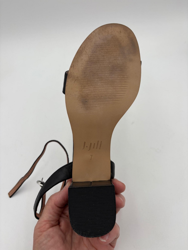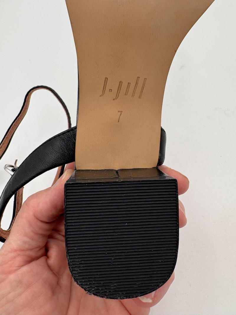 Two pairs of comfortable low heel sandals for casual summer dresses or skirts. Beige & white sandals from French maker Camper have white sole, white elasticated strips over the top of the foot & back of heel, and a white 1.75" heel on a rubber sole. Uppers are beige nubuck leather. In excellent condition, although there is slight residue on ball of foot from client's cushion inserts. Should come off with rubbing alcohol or Goop Off. Size 37 Black J. Jill sandals have a strap across the ball of the foot and delicate slender angled straps that wrap around the heel with buckle above the ankle. 2" heel and soft self-covered leather heel. In excellent condition. Size 7.