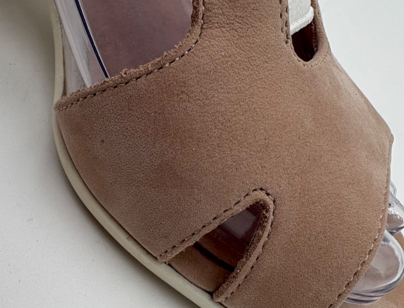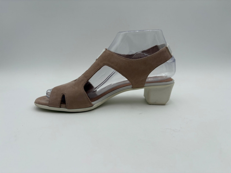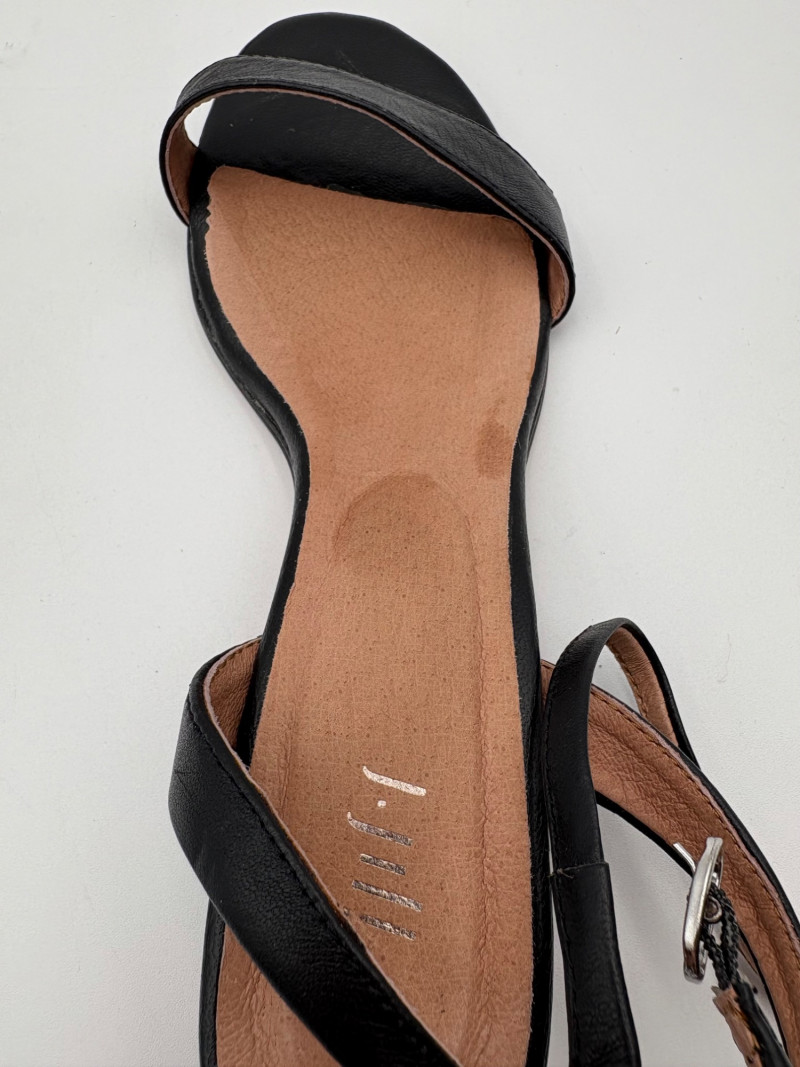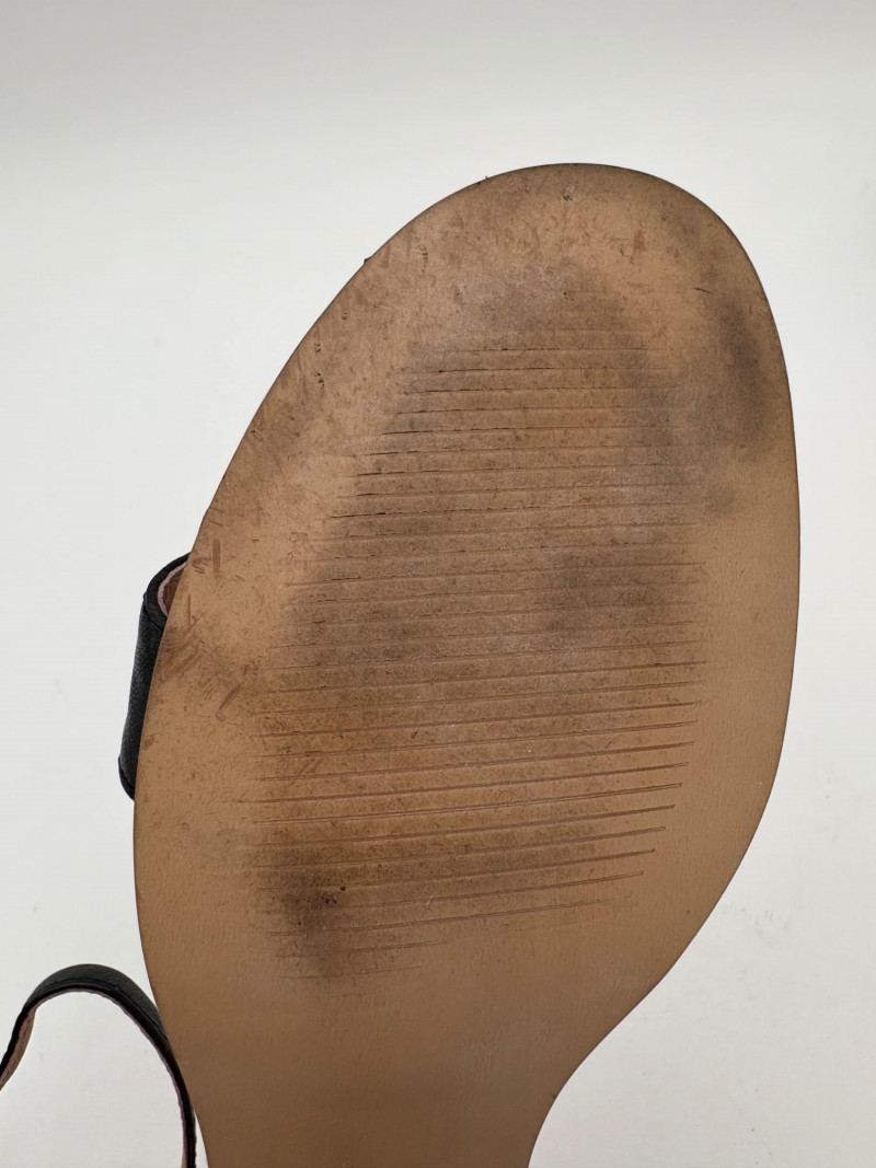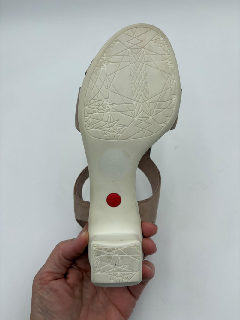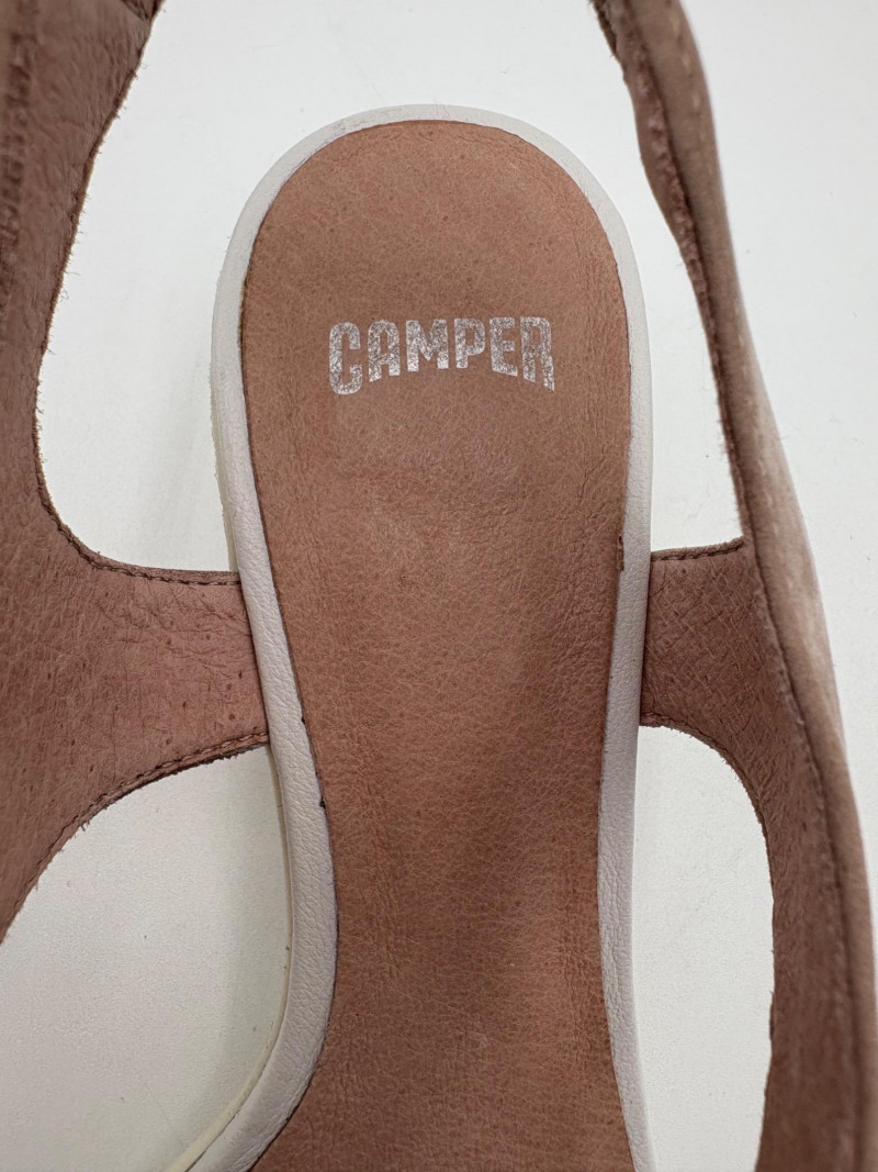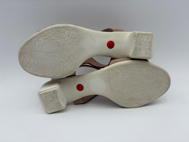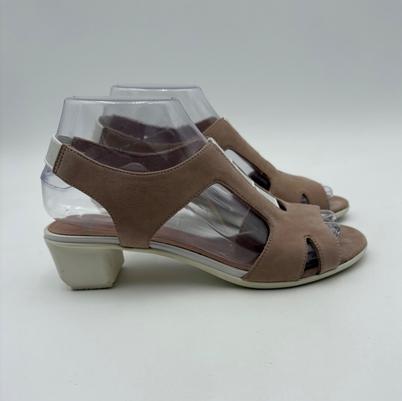 Two pairs of comfortable low heel sandals for casual summer dresses or skirts. Beige & white sandals from French maker Camper have white sole, white elasticated strips over the top of the foot & back of heel, and a white 1.75" heel on a rubber sole. Uppers are beige nubuck leather. In excellent condition, although there is slight residue on ball of foot from client's cushion inserts. Should come off with rubbing alcohol or Goop Off. Size 37 Black J. Jill sandals have a strap across the ball of the foot and delicate slender angled straps that wrap around the heel with buckle above the ankle. 2" heel and soft self-covered leather heel. In excellent condition. Size 7.