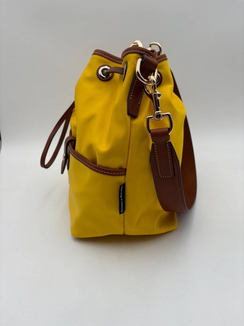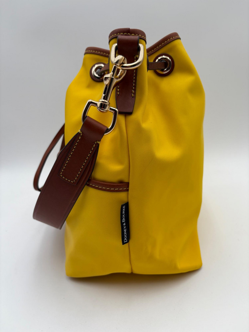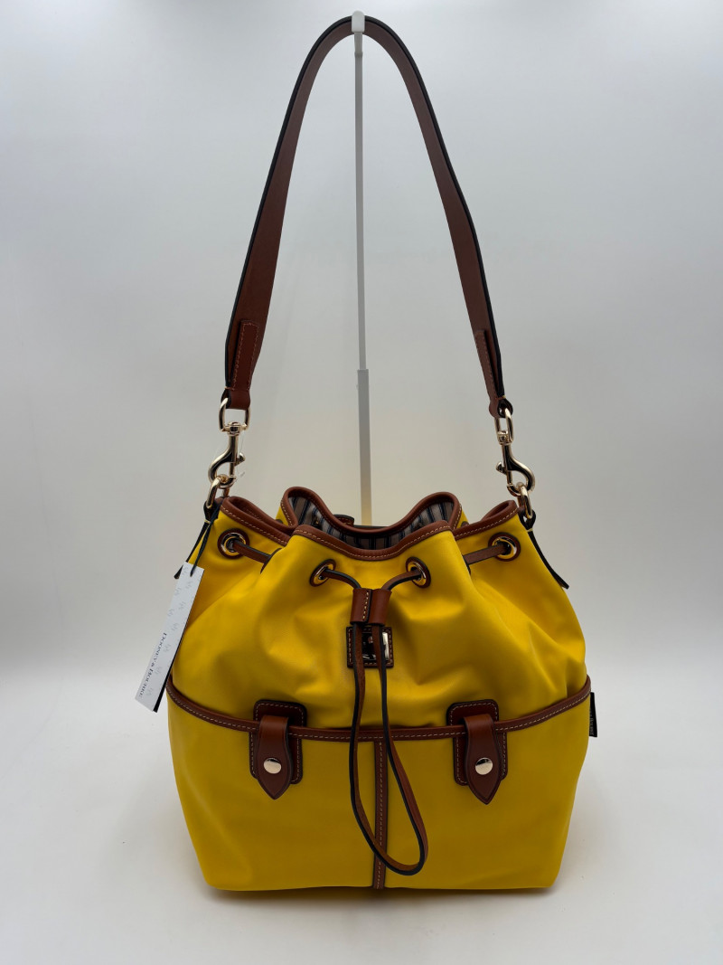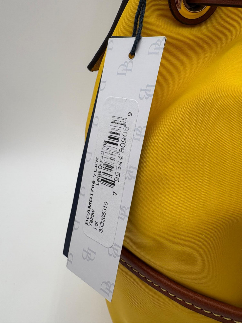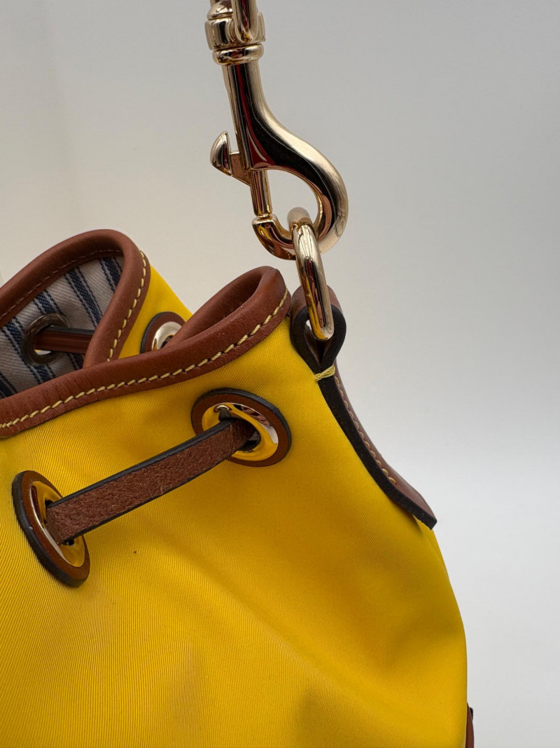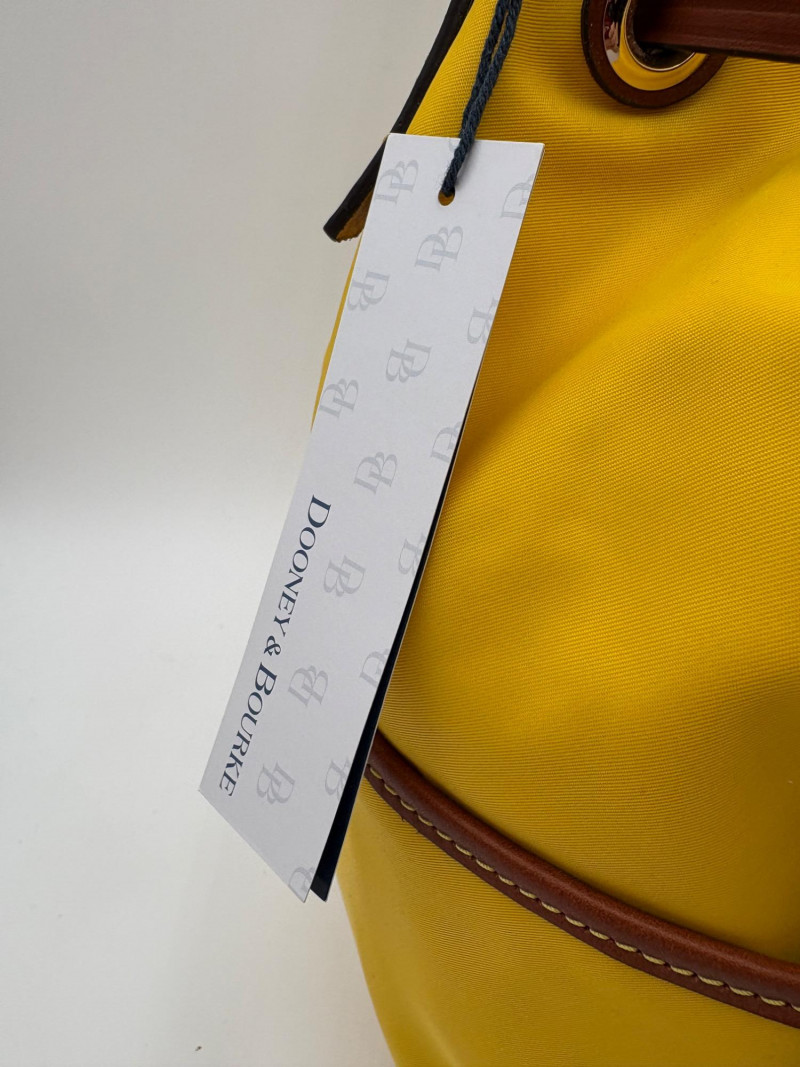Vividly yellow summer purse from Dooney & Bourke. Bright nylon exterior with brown leather trim and drawstring. Double front slide pockets with snap closures and leather strip/knobbed base. Gold hardware throughout with swivel handle strap attachment as well as the D&B logo plate on the front. Interior is lined in ticking style cotton with 3 slide pockets, one zip-close pocket, and a leather key fob attachment. New with tags - the registration card is still present. Measures 10" W x 12" H with a 6" W flat base. Drop from top of the handle to the top of the purse is 13".