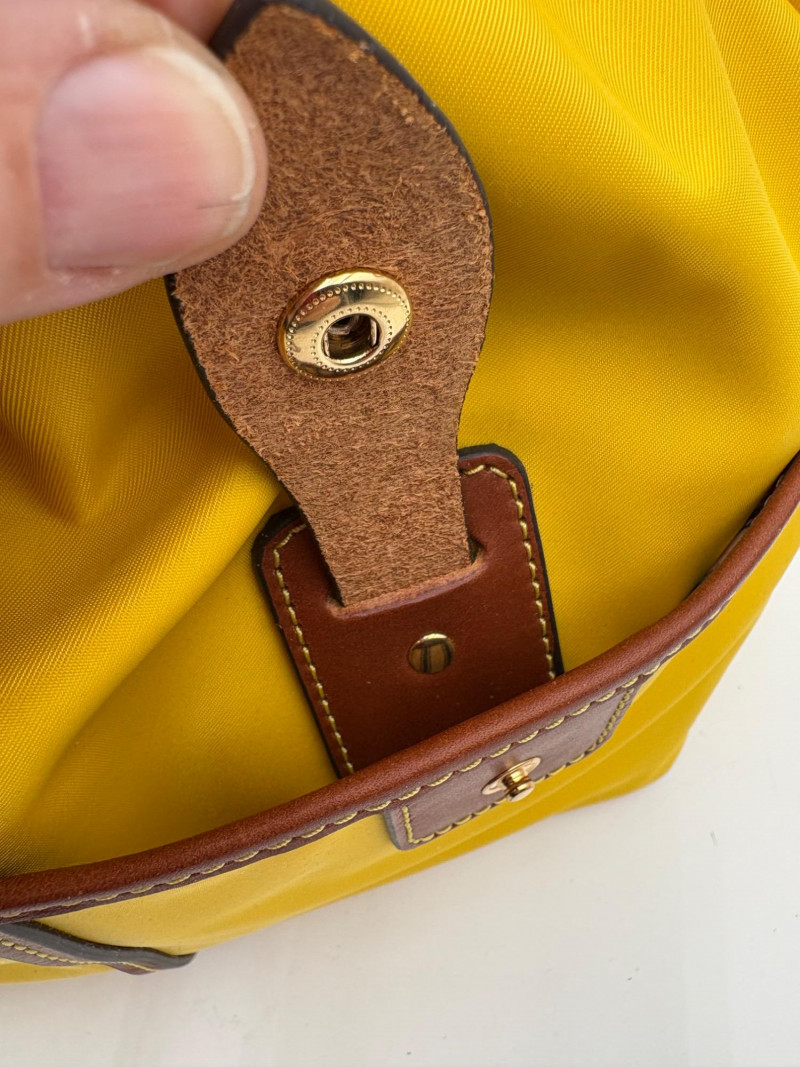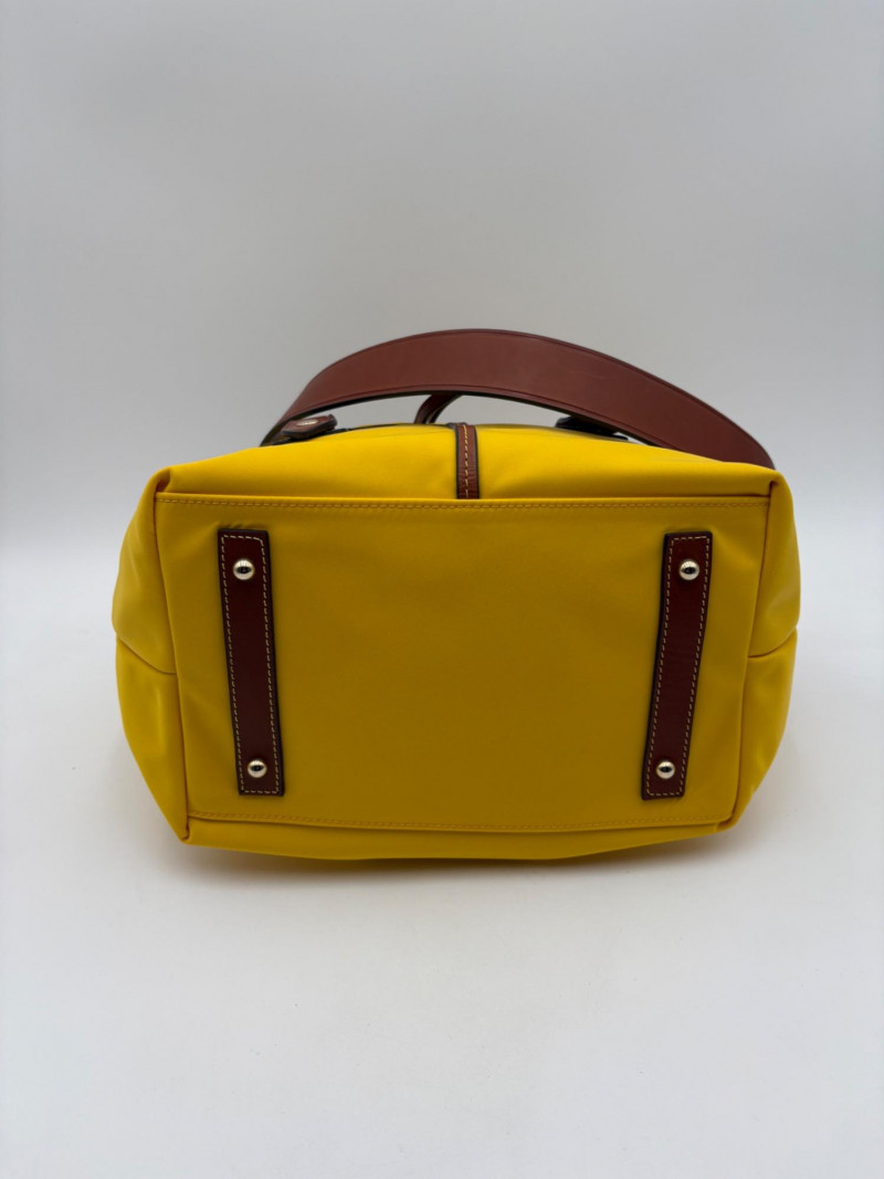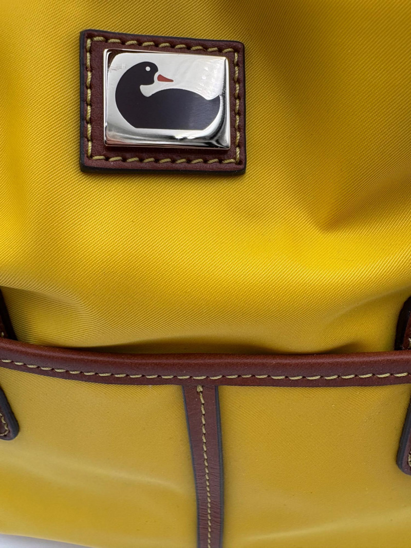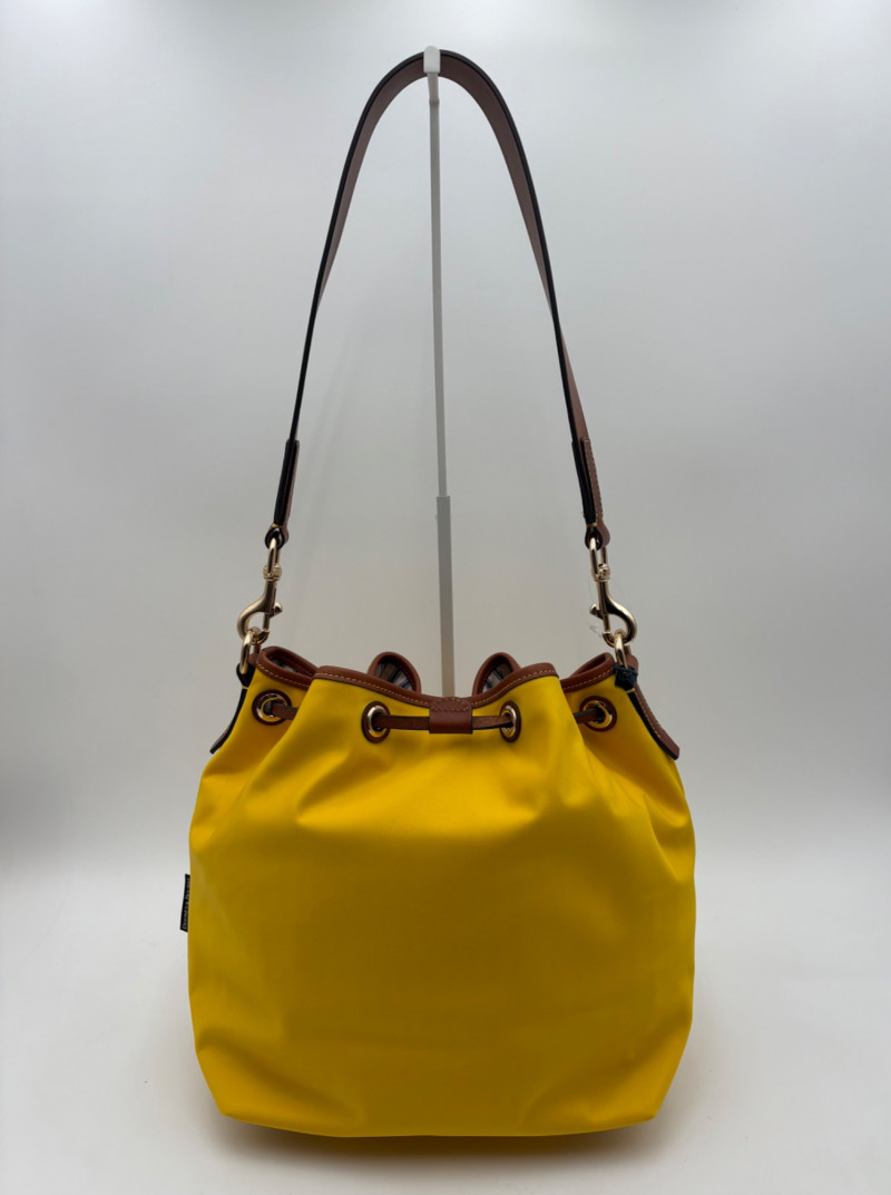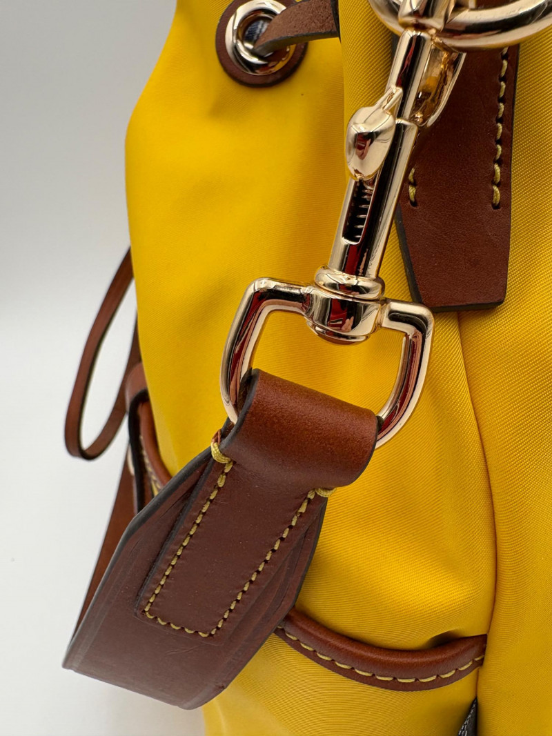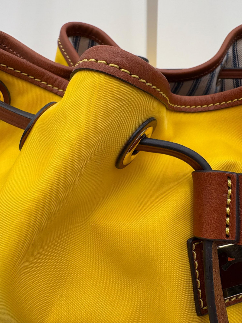 Vividly yellow summer purse from Dooney & Bourke. Bright nylon exterior with brown leather trim and drawstring. Double front slide pockets with snap closures and leather strip/knobbed base. Gold hardware throughout with swivel handle strap attachment as well as the D&B logo plate on the front. Interior is lined in ticking style cotton with 3 slide pockets, one zip-close pocket, and a leather key fob attachment. New with tags - the registration card is still present. Measures 10" W x 12" H with a 6" W flat base. Drop from top of the handle to the top of the purse is 13".