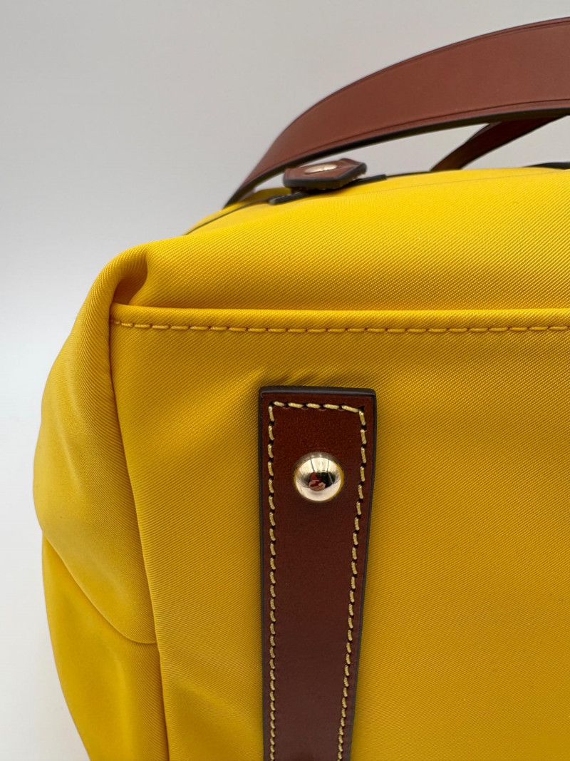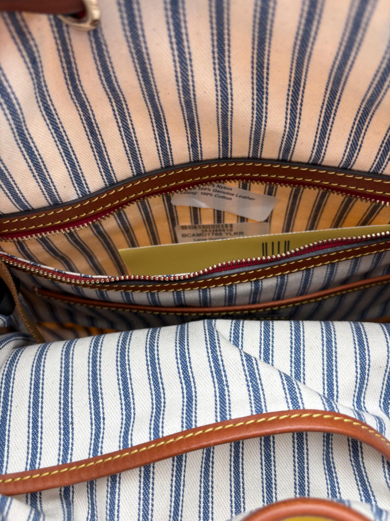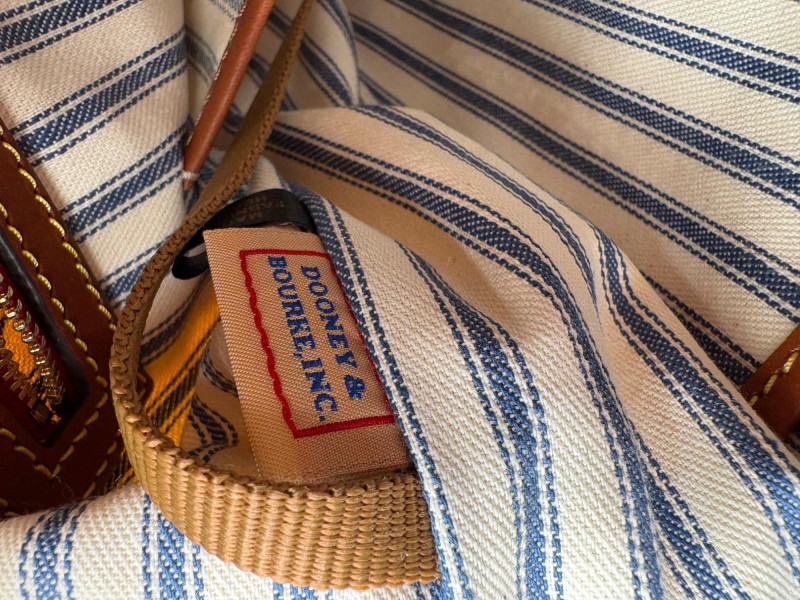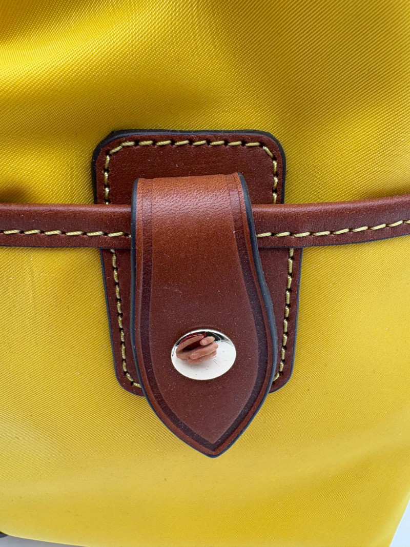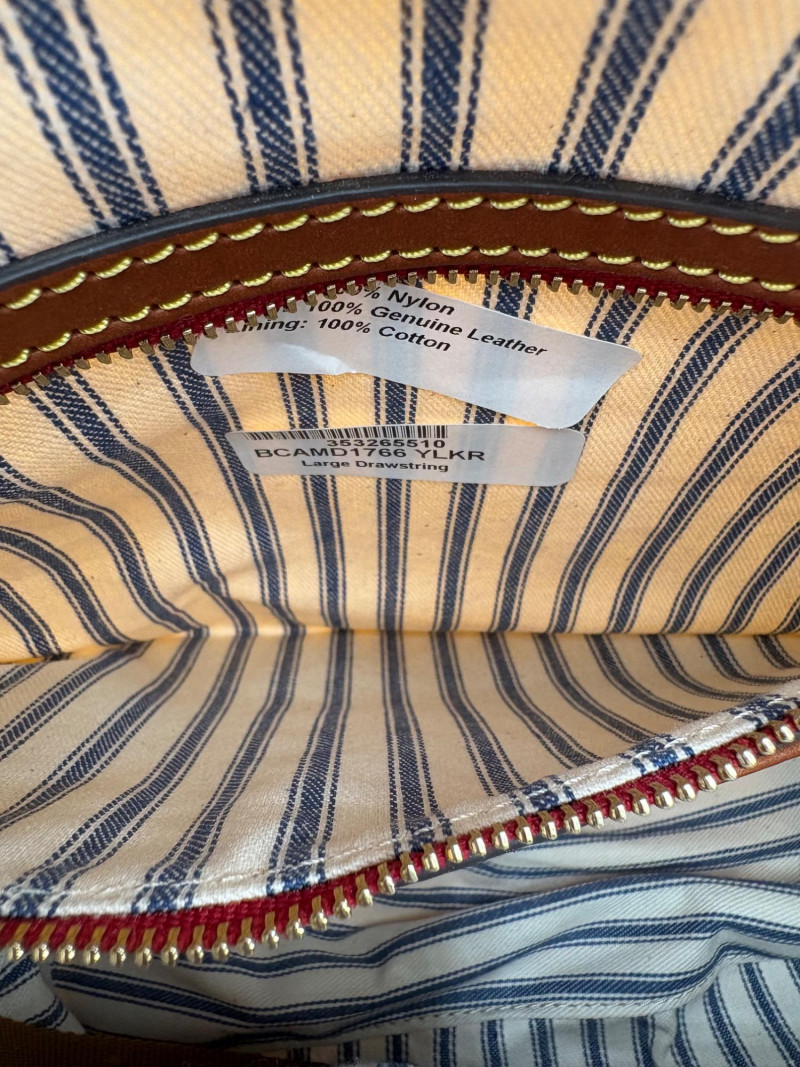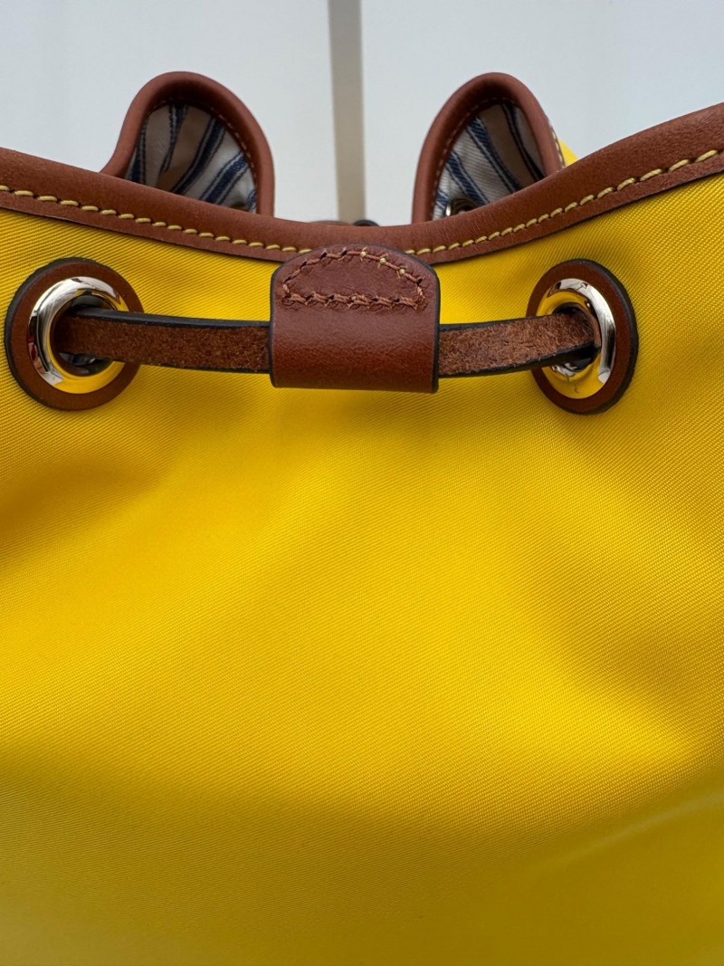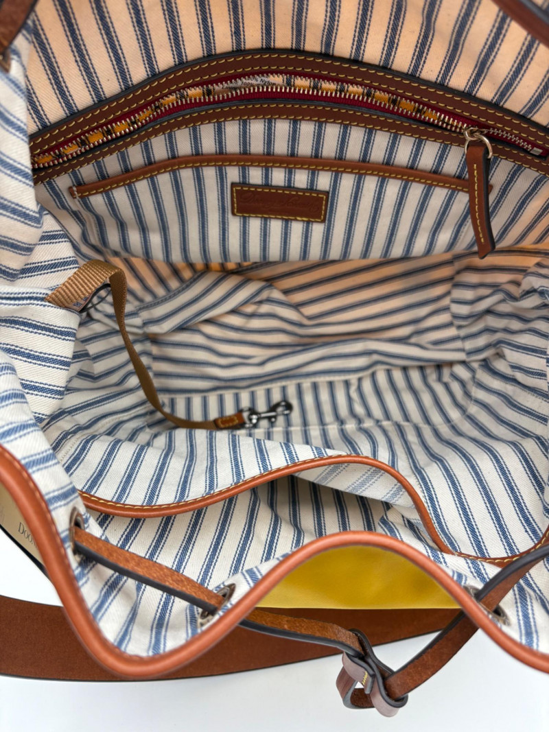 Vividly yellow summer purse from Dooney & Bourke. Bright nylon exterior with brown leather trim and drawstring. Double front slide pockets with snap closures and leather strip/knobbed base. Gold hardware throughout with swivel handle strap attachment as well as the D&B logo plate on the front. Interior is lined in ticking style cotton with 3 slide pockets, one zip-close pocket, and a leather key fob attachment. New with tags - the registration card is still present. Measures 10" W x 12" H with a 6" W flat base. Drop from top of the handle to the top of the purse is 13".