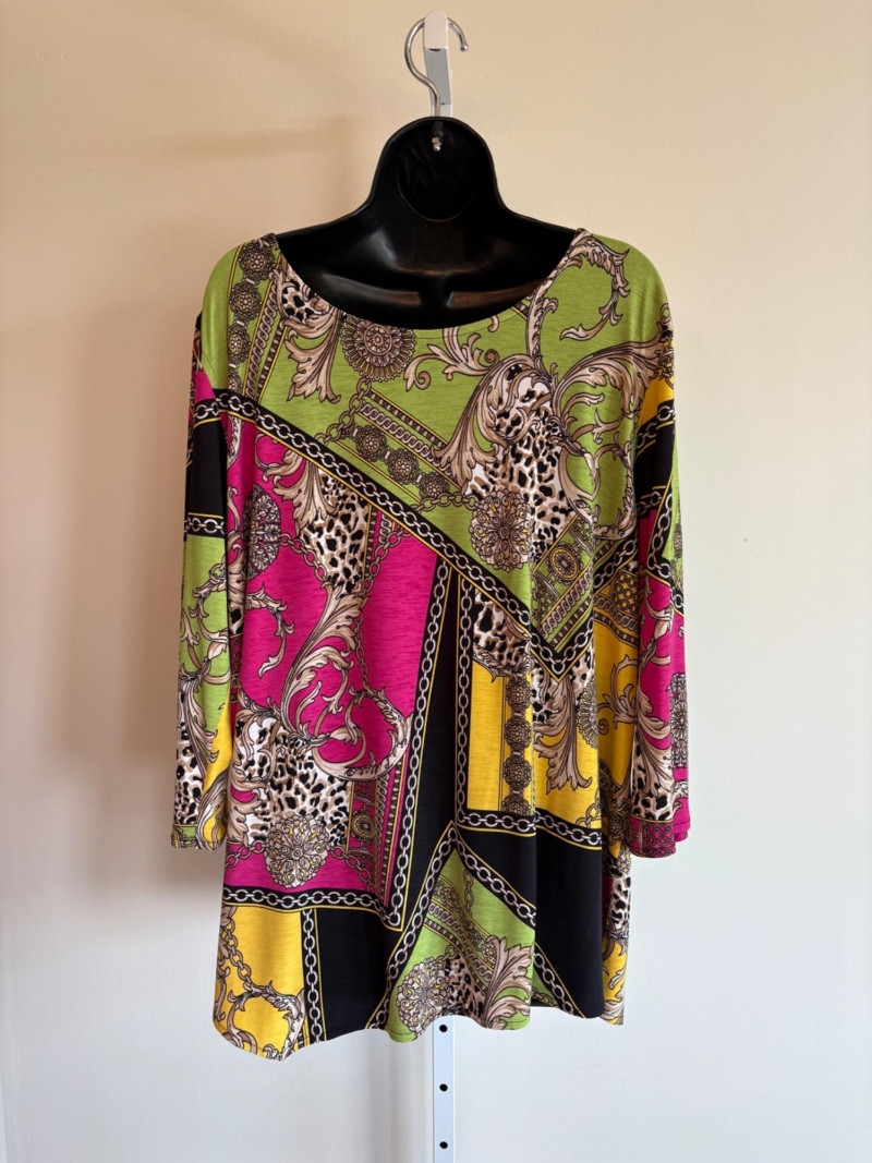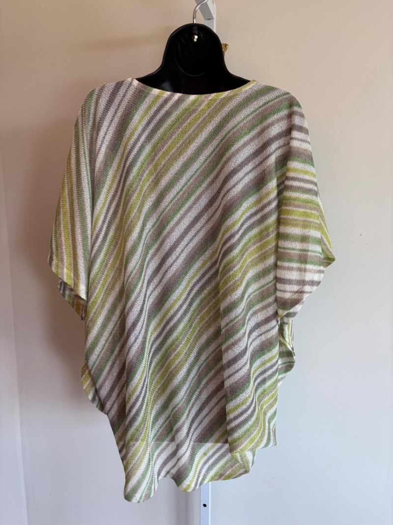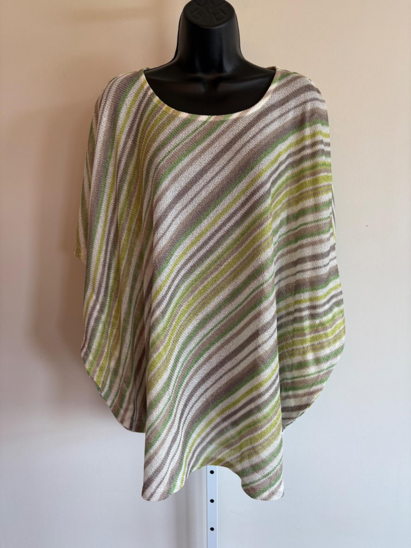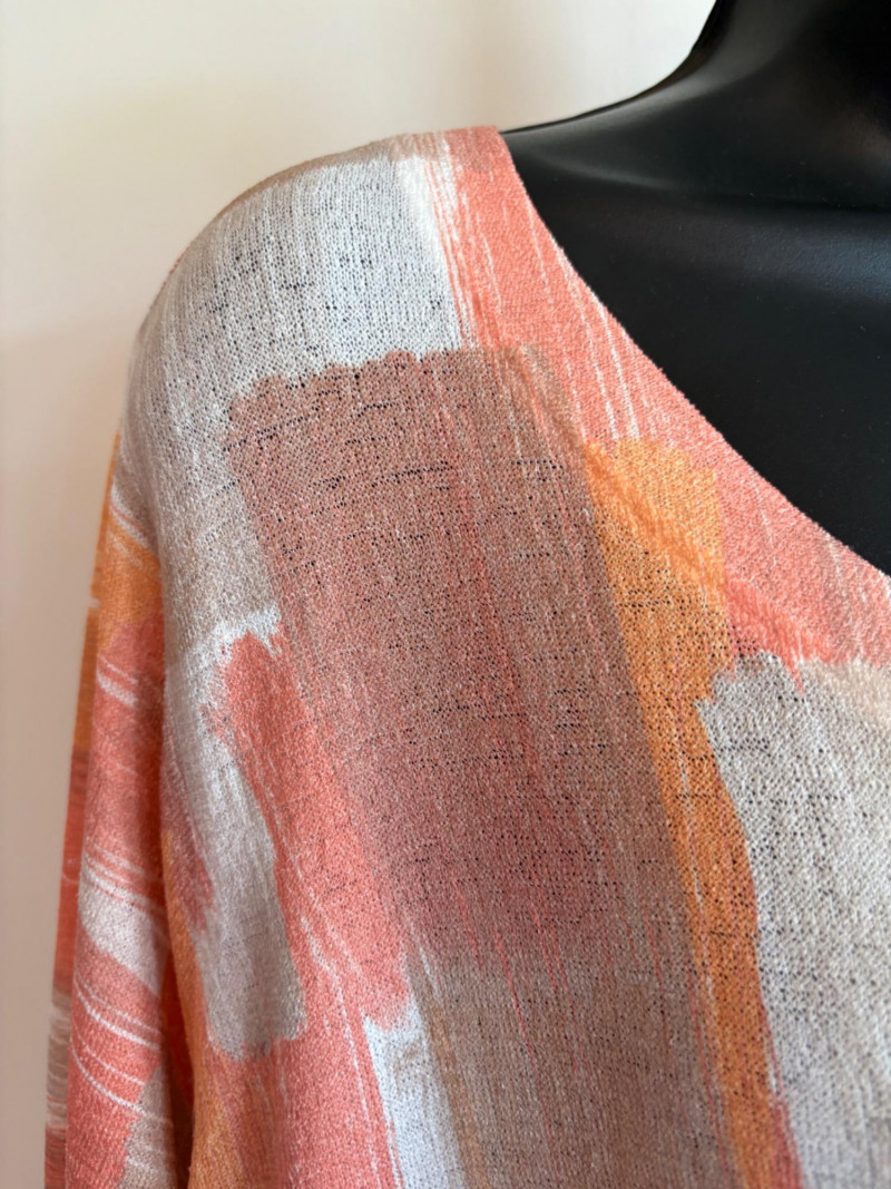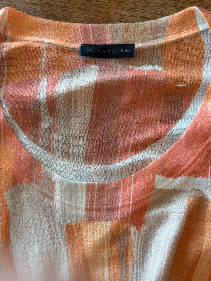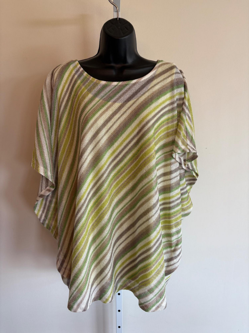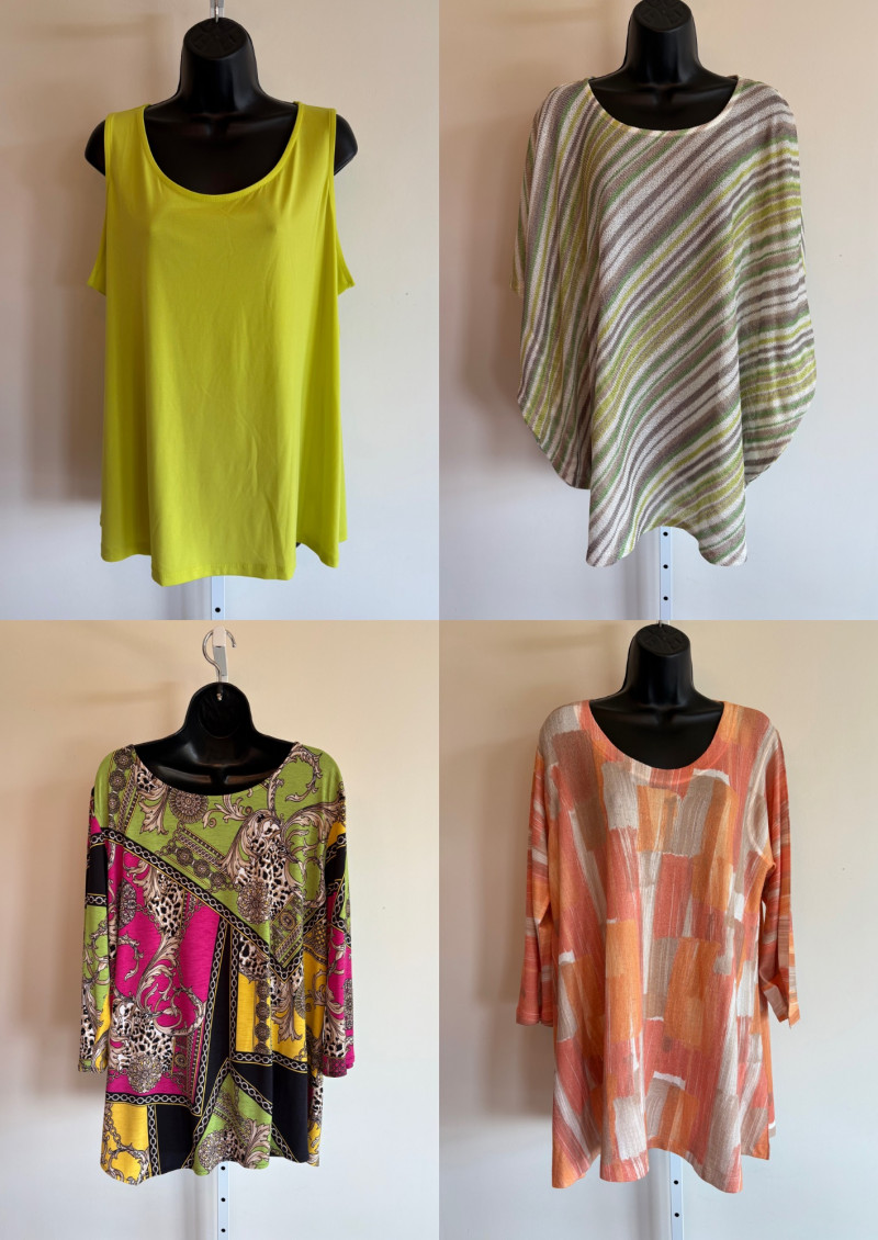 Group of great printed knit tops in summery colors and fabrics from Caroline Rose, Nelly & Millie, and Susan Graver. Green set from Susan Graver has diagonally striped poncho-like overshirt with acid green shell underneath - they are not attached and could be worn as separates. Both pieces are in excellent condition. Shell is 95% polyester with 5% spandex and measures 23" pit to pit and 28" from shoulder strap to bottom hem. Overshirt is 100% polyester and measures "free size" like a poncho dropping 29" from shoulder to hem. Size tags on both say XL. Wild multi-colored top from Caroline Rose has long sleeves, round neck, split hem, and slightly lower curved back hem. Really stretchy with great hang. In excellent condition. 93% polyester with 7% spandex. Measures 23" pit to pit and 28" from back neckline to hem. Size tag says L. Nelly & Millie top in oranges, taupe, and cream has long sleeves and a deeply scooped neckline. Note that while this is a sublimation print, it doesn't appear to have the flaws sublimation printing often produces. In excellent condition. 98% polyester with 2% spandex. Measures 22" pit to pit and 31" from back neckline to hem. Size tag says XL.