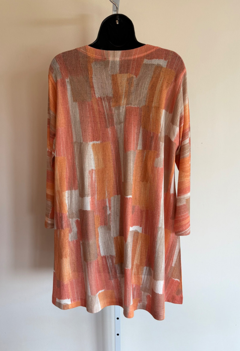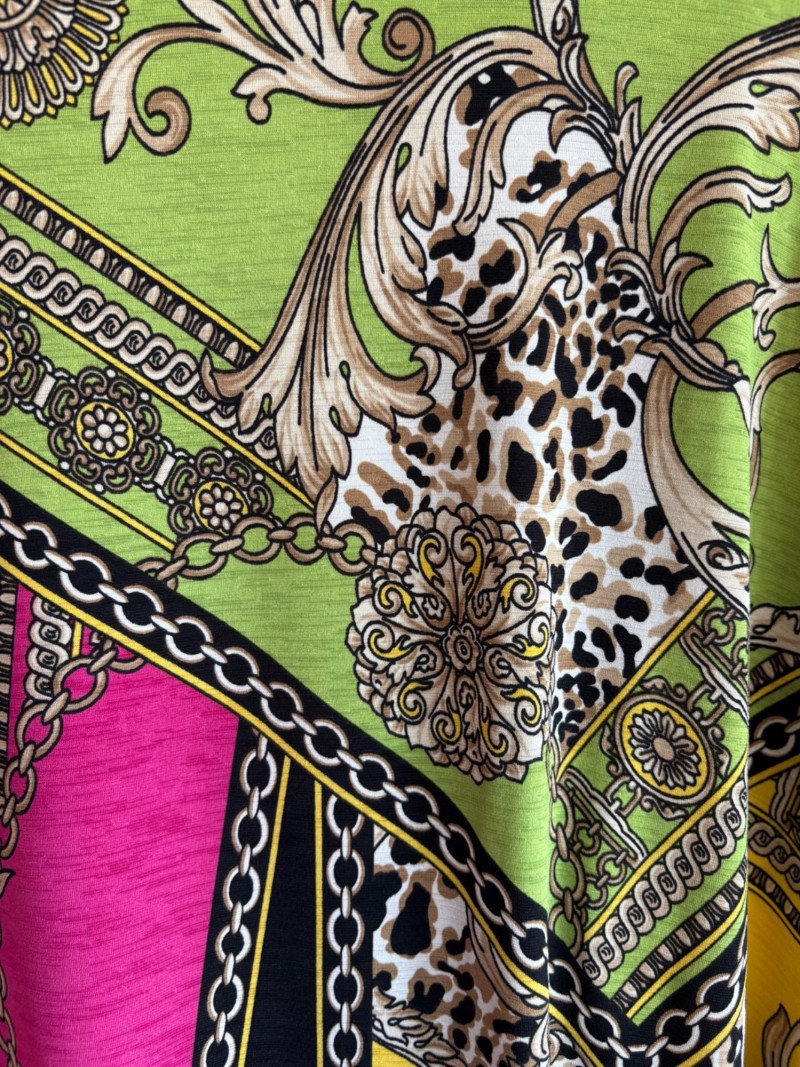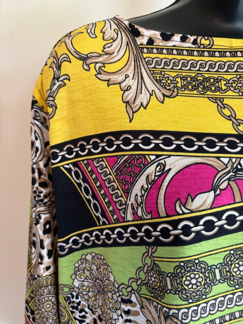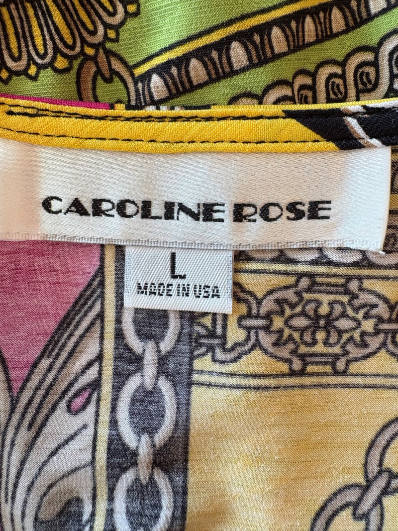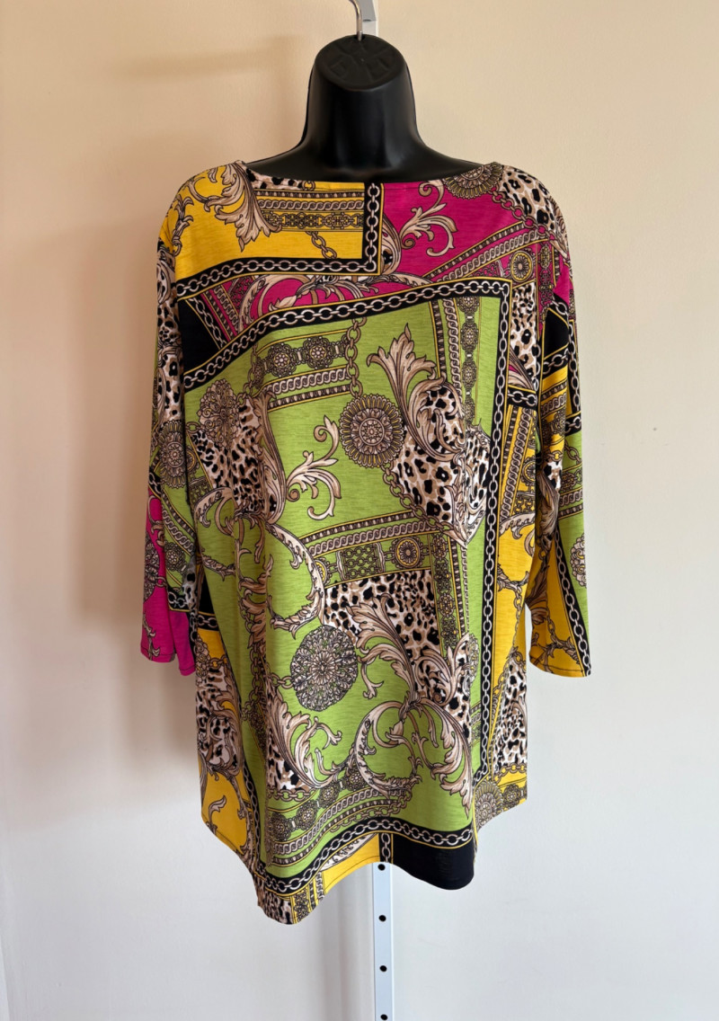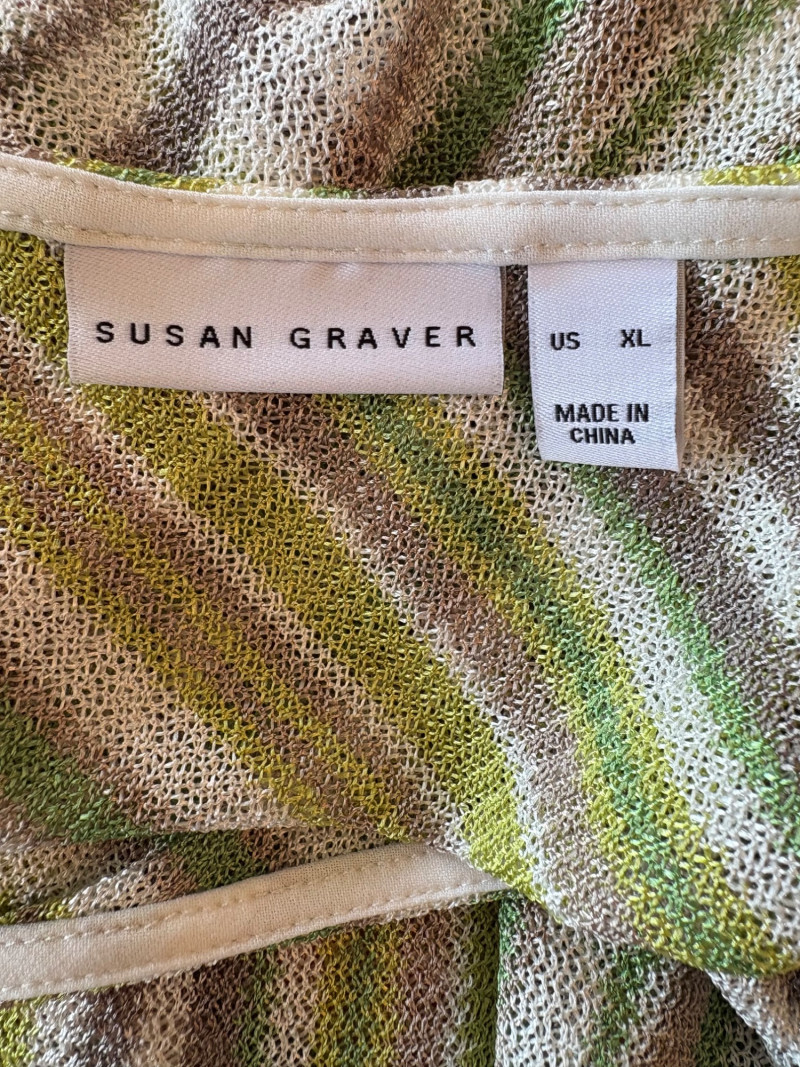 Group of great printed knit tops in summery colors and fabrics from Caroline Rose, Nelly & Millie, and Susan Graver. Green set from Susan Graver has diagonally striped poncho-like overshirt with acid green shell underneath - they are not attached and could be worn as separates. Both pieces are in excellent condition. Shell is 95% polyester with 5% spandex and measures 23" pit to pit and 28" from shoulder strap to bottom hem. Overshirt is 100% polyester and measures "free size" like a poncho dropping 29" from shoulder to hem. Size tags on both say XL. Wild multi-colored top from Caroline Rose has long sleeves, round neck, split hem, and slightly lower curved back hem. Really stretchy with great hang. In excellent condition. 93% polyester with 7% spandex. Measures 23" pit to pit and 28" from back neckline to hem. Size tag says L. Nelly & Millie top in oranges, taupe, and cream has long sleeves and a deeply scooped neckline. Note that while this is a sublimation print, it doesn't appear to have the flaws sublimation printing often produces. In excellent condition. 98% polyester with 2% spandex. Measures 22" pit to pit and 31" from back neckline to hem. Size tag says XL.