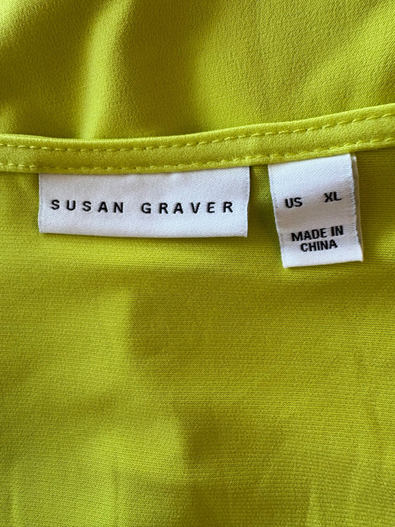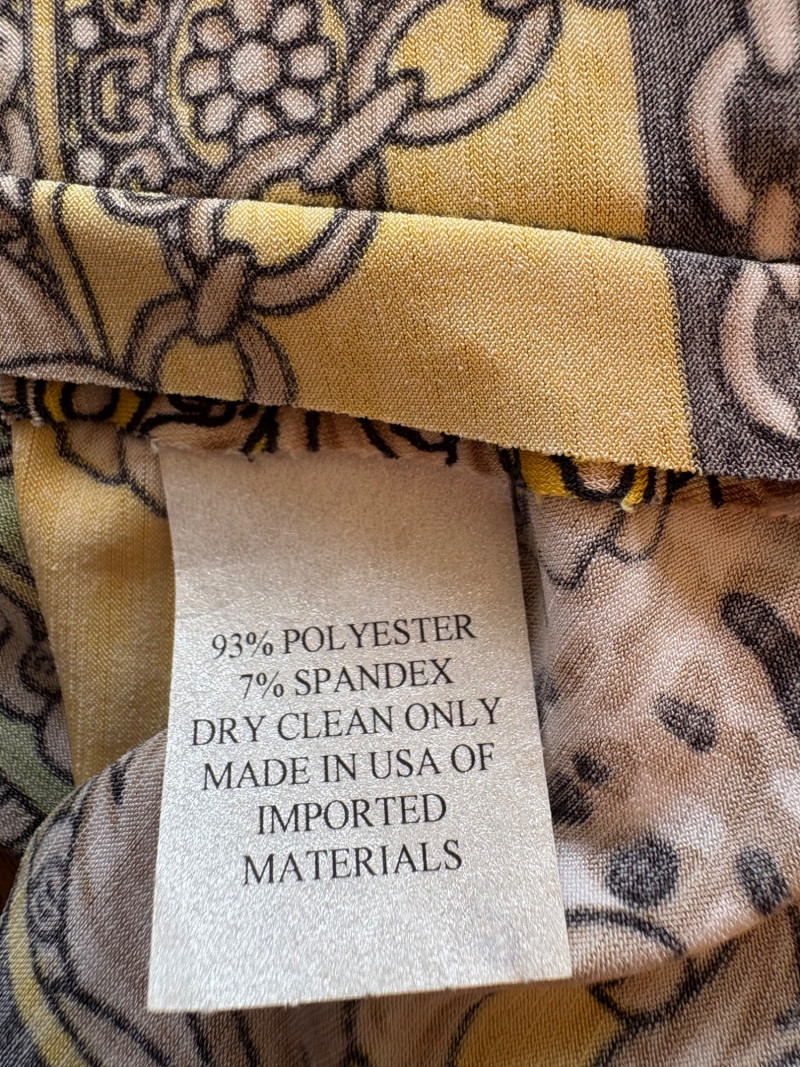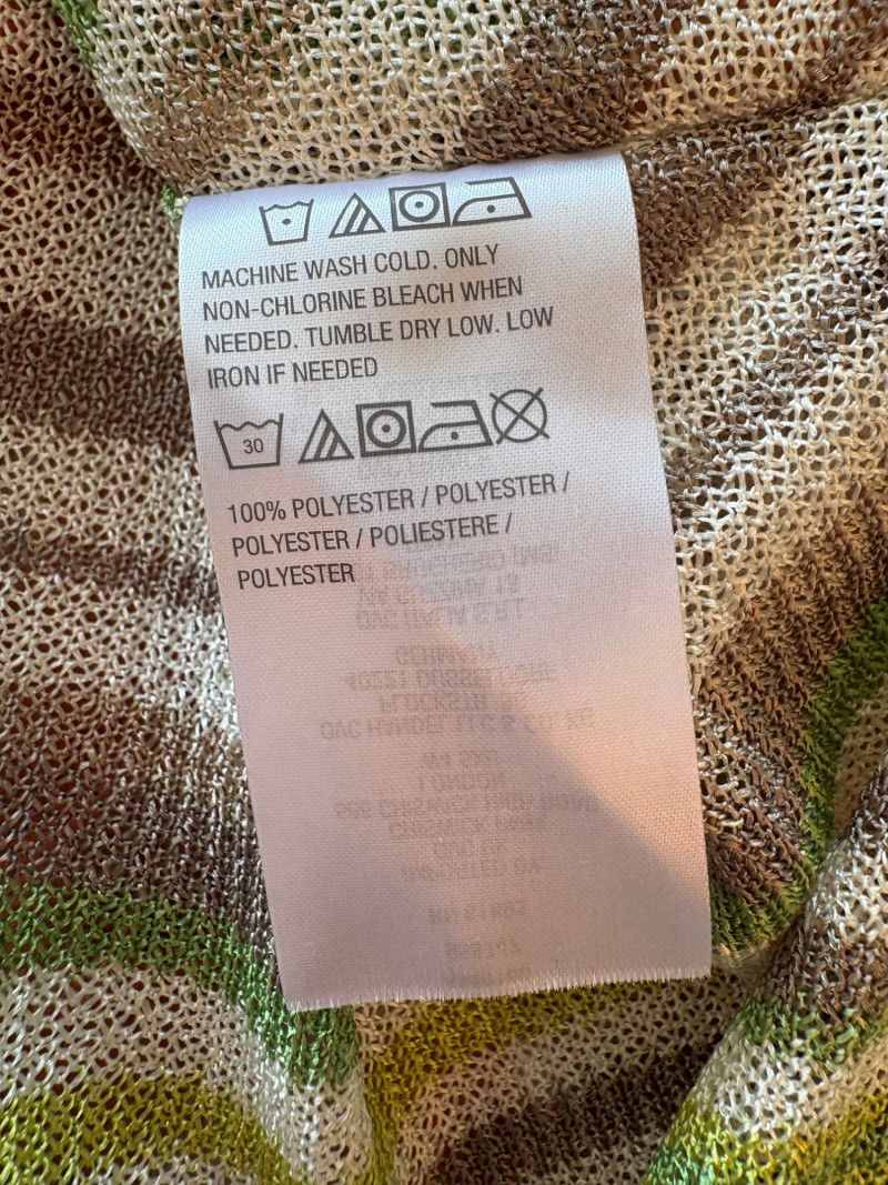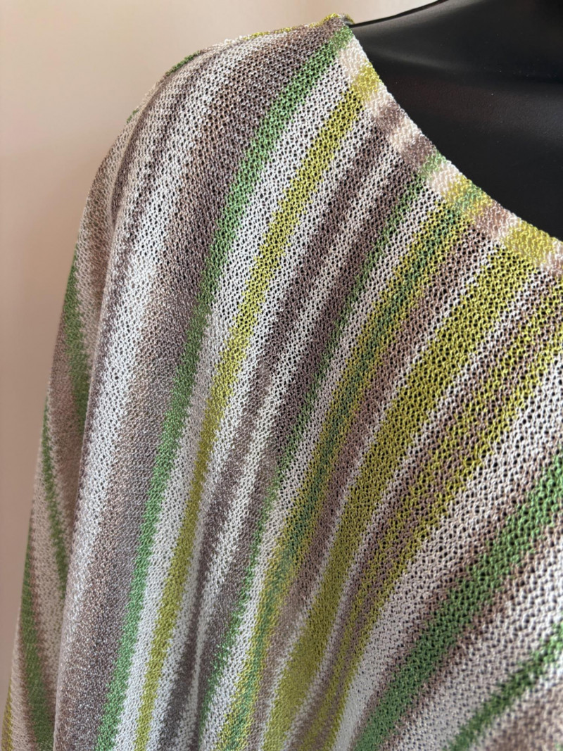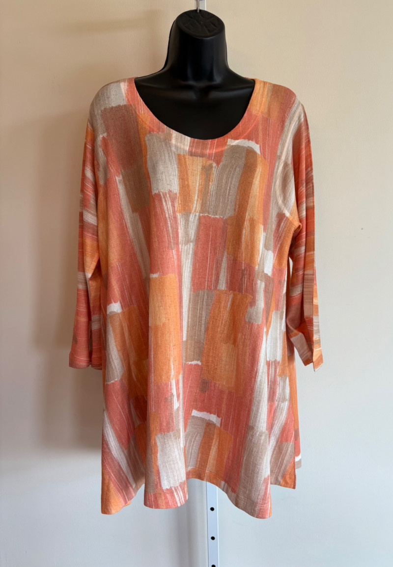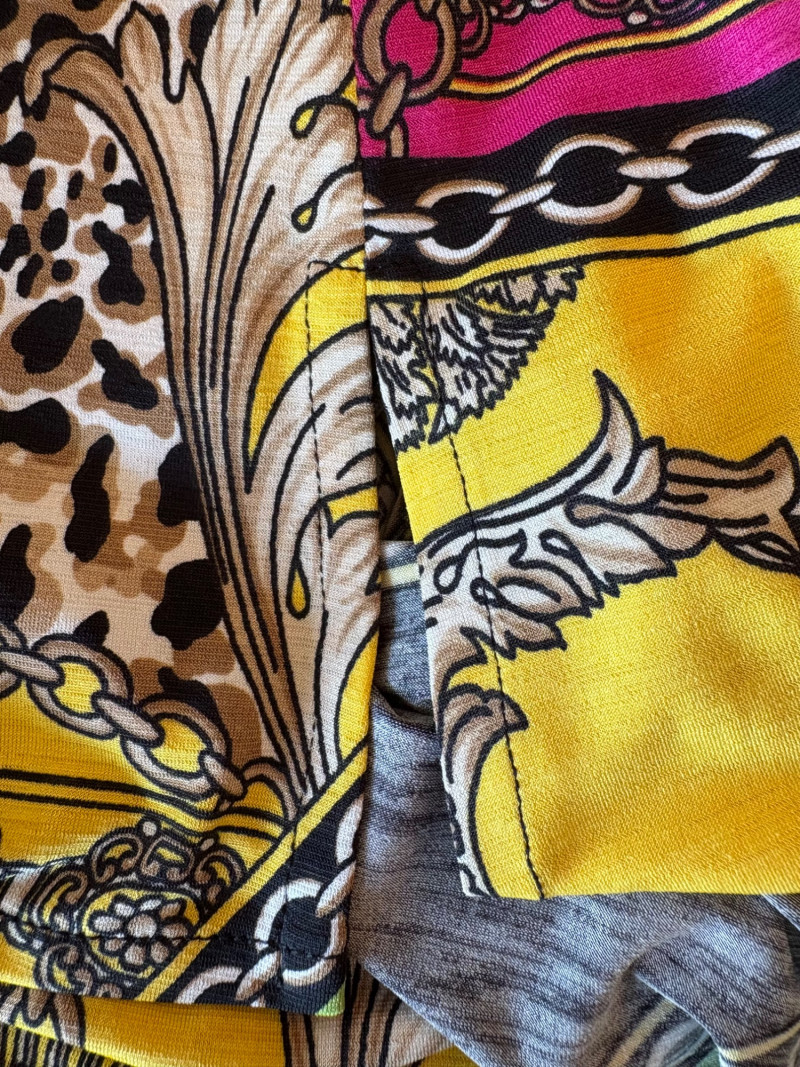 Group of great printed knit tops in summery colors and fabrics from Caroline Rose, Nelly & Millie, and Susan Graver. Green set from Susan Graver has diagonally striped poncho-like overshirt with acid green shell underneath - they are not attached and could be worn as separates. Both pieces are in excellent condition. Shell is 95% polyester with 5% spandex and measures 23" pit to pit and 28" from shoulder strap to bottom hem. Overshirt is 100% polyester and measures "free size" like a poncho dropping 29" from shoulder to hem. Size tags on both say XL. Wild multi-colored top from Caroline Rose has long sleeves, round neck, split hem, and slightly lower curved back hem. Really stretchy with great hang. In excellent condition. 93% polyester with 7% spandex. Measures 23" pit to pit and 28" from back neckline to hem. Size tag says L. Nelly & Millie top in oranges, taupe, and cream has long sleeves and a deeply scooped neckline. Note that while this is a sublimation print, it doesn't appear to have the flaws sublimation printing often produces. In excellent condition. 98% polyester with 2% spandex. Measures 22" pit to pit and 31" from back neckline to hem. Size tag says XL.