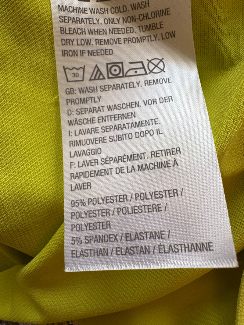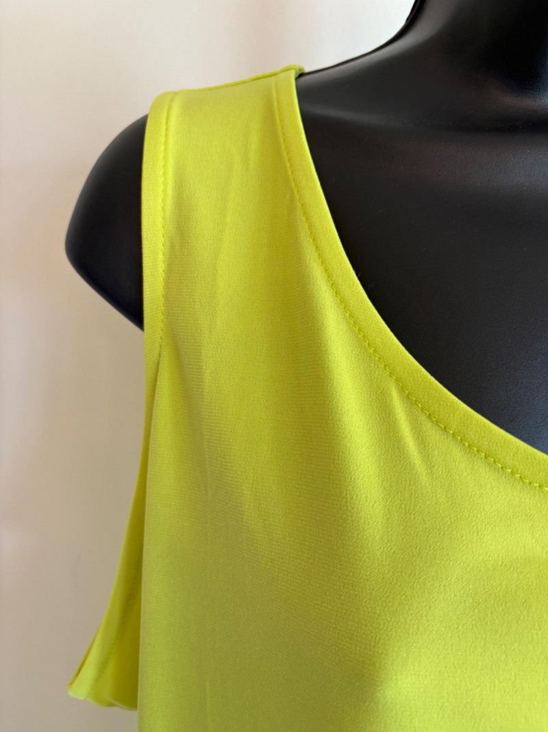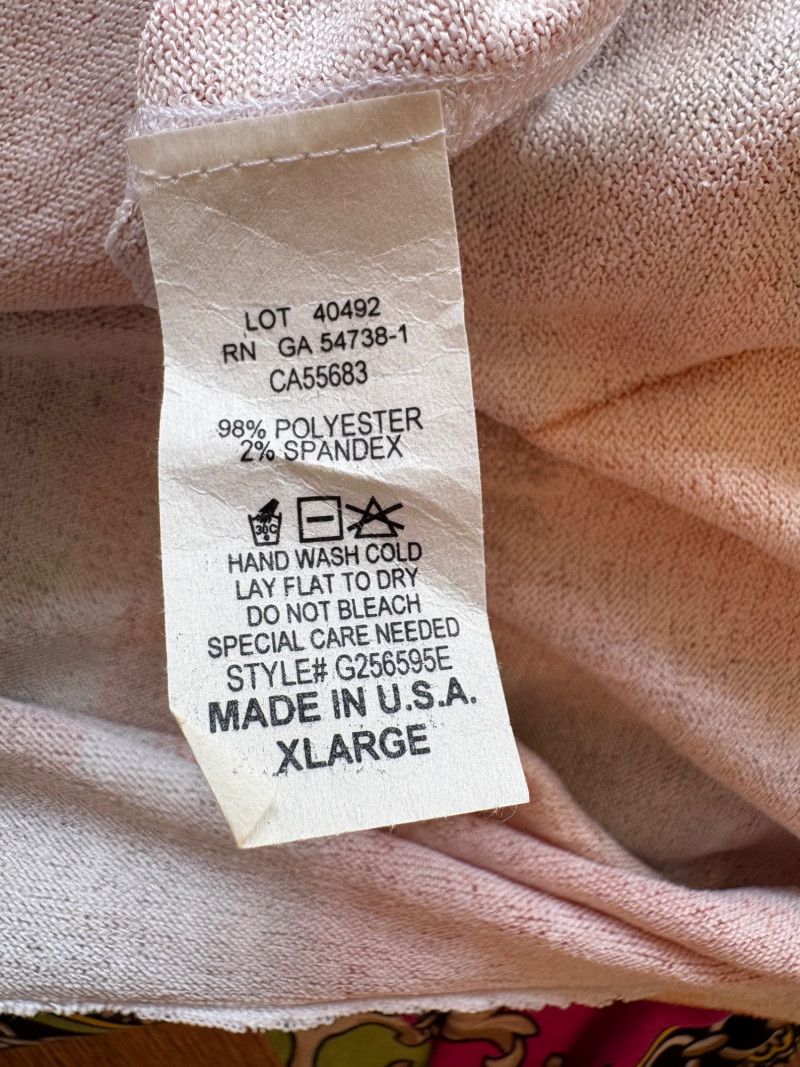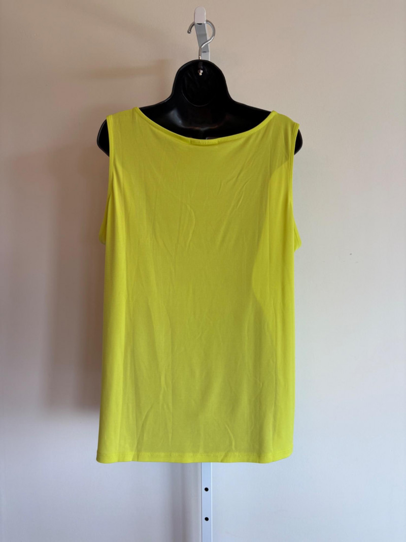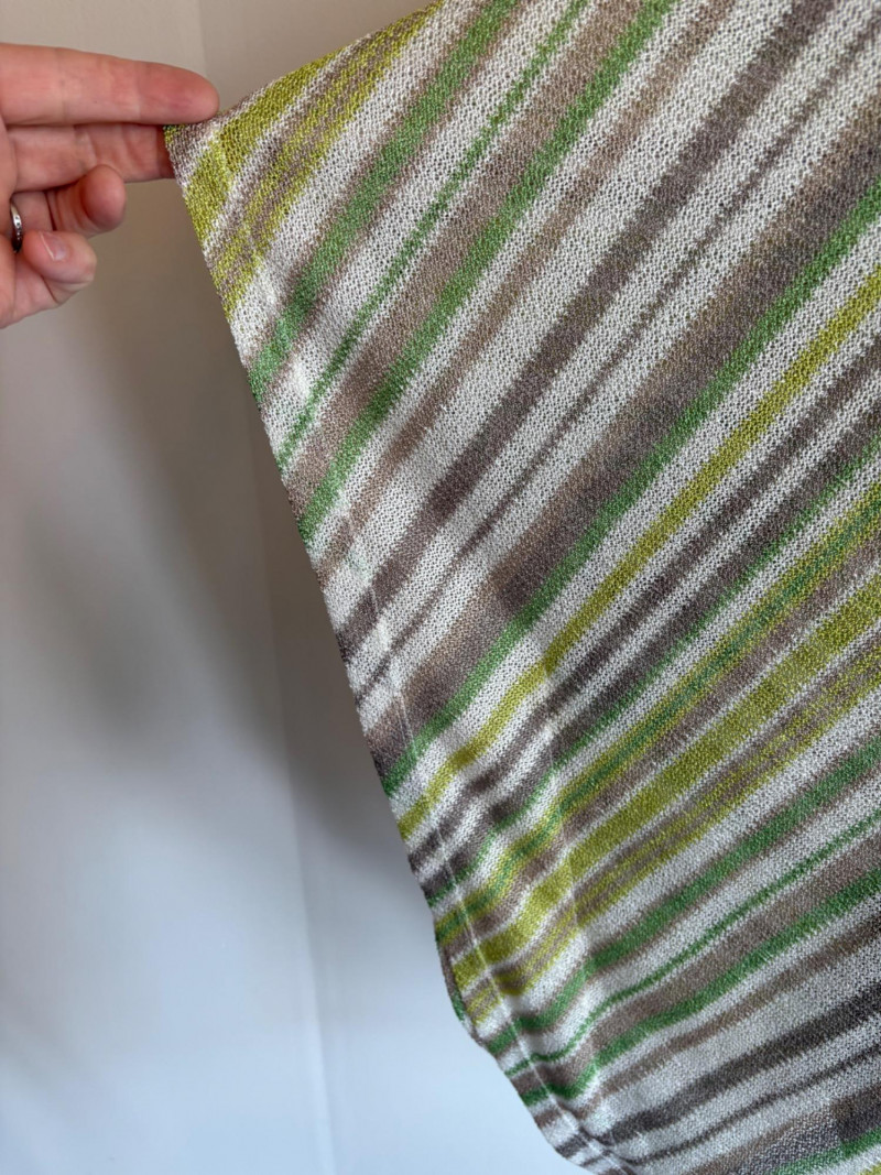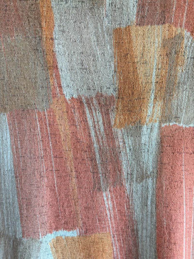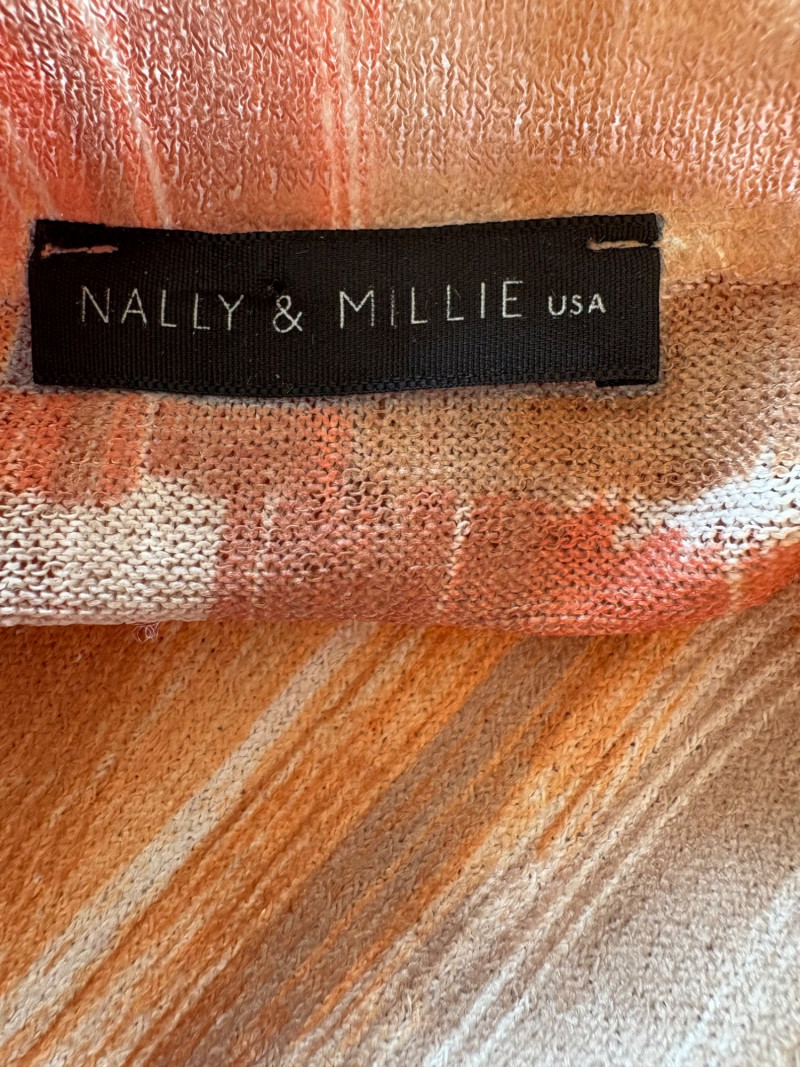 Group of great printed knit tops in summery colors and fabrics from Caroline Rose, Nelly & Millie, and Susan Graver. Green set from Susan Graver has diagonally striped poncho-like overshirt with acid green shell underneath - they are not attached and could be worn as separates. Both pieces are in excellent condition. Shell is 95% polyester with 5% spandex and measures 23" pit to pit and 28" from shoulder strap to bottom hem. Overshirt is 100% polyester and measures "free size" like a poncho dropping 29" from shoulder to hem. Size tags on both say XL. Wild multi-colored top from Caroline Rose has long sleeves, round neck, split hem, and slightly lower curved back hem. Really stretchy with great hang. In excellent condition. 93% polyester with 7% spandex. Measures 23" pit to pit and 28" from back neckline to hem. Size tag says L. Nelly & Millie top in oranges, taupe, and cream has long sleeves and a deeply scooped neckline. Note that while this is a sublimation print, it doesn't appear to have the flaws sublimation printing often produces. In excellent condition. 98% polyester with 2% spandex. Measures 22" pit to pit and 31" from back neckline to hem. Size tag says XL.