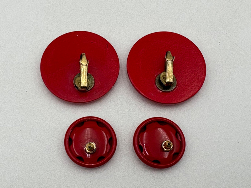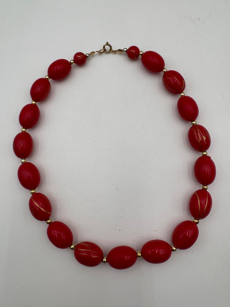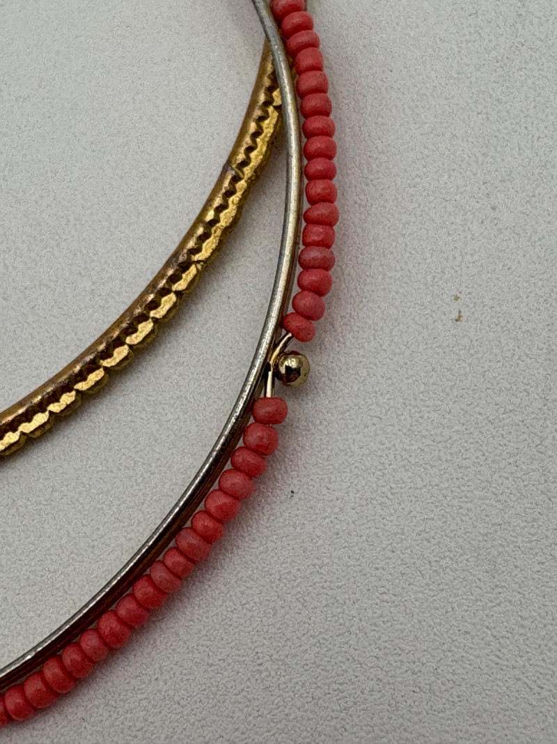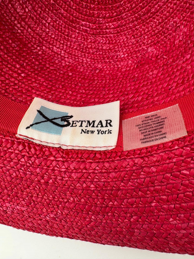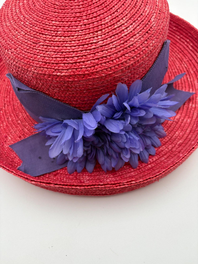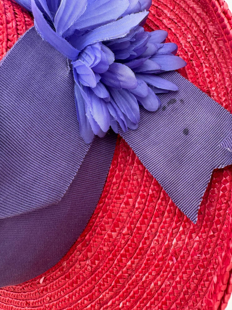Red theme here - summer straw hat, LOTS of shiny red & gold bangles, a necklace, and 2 pairs of earrings! Classic red 100% straw hat with medium width brim & turned up edges. Purple bow and ribbon. From Betmar of NYC. Hat itself is in great condition, but the purple ribbon has some stains - not sure if they could be removed - see last photo.. No size tag, but fit everyone we had try it. Red & gold beaded necklace with spring ring clasp. Measures 16" L. No maker mark. 2 pairs of round red earrings - the larger is clip-on, the smaller pierced. No maker mark. 15 assorted gold & red bangle bracelets. No maker marks.