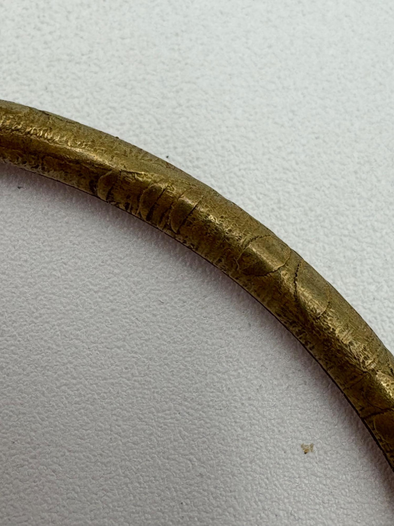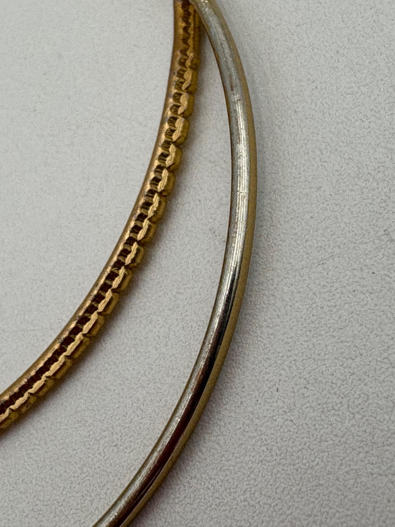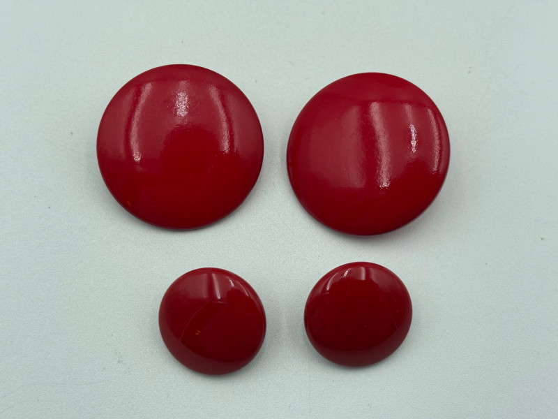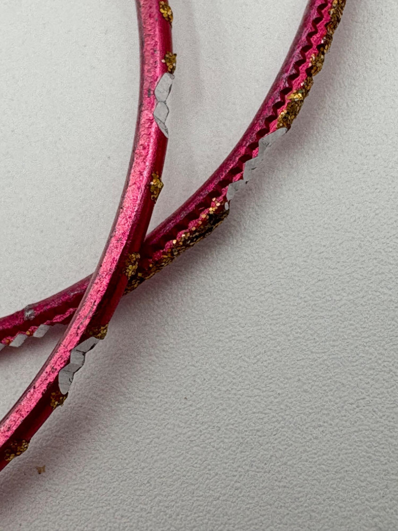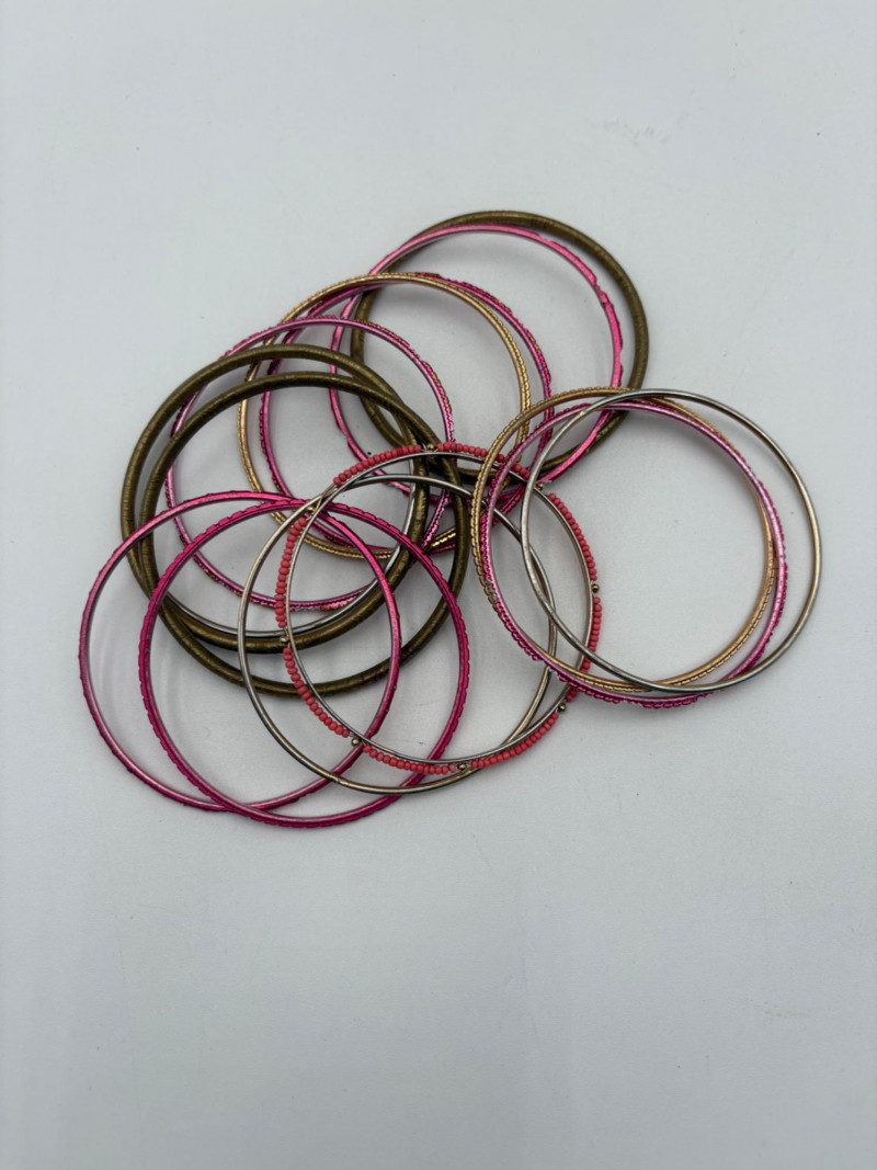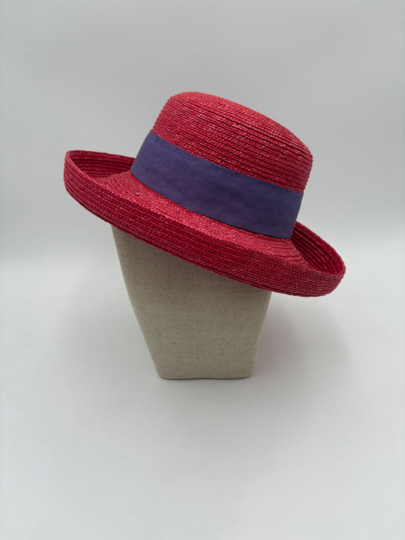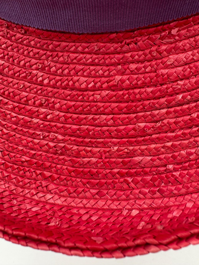 Red theme here - summer straw hat, LOTS of shiny red & gold bangles, a necklace, and 2 pairs of earrings! Classic red 100% straw hat with medium width brim & turned up edges. Purple bow and ribbon. From Betmar of NYC. Hat itself is in great condition, but the purple ribbon has some stains - not sure if they could be removed - see last photo.. No size tag, but fit everyone we had try it. Red & gold beaded necklace with spring ring clasp. Measures 16" L. No maker mark. 2 pairs of round red earrings - the larger is clip-on, the smaller pierced. No maker mark. 15 assorted gold & red bangle bracelets. No maker marks.