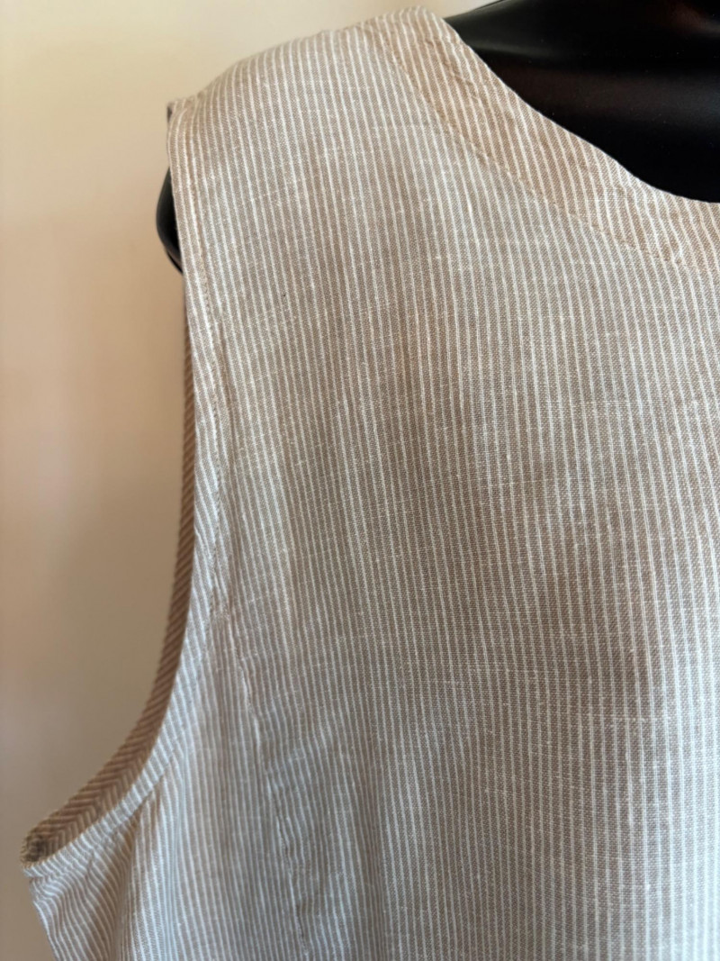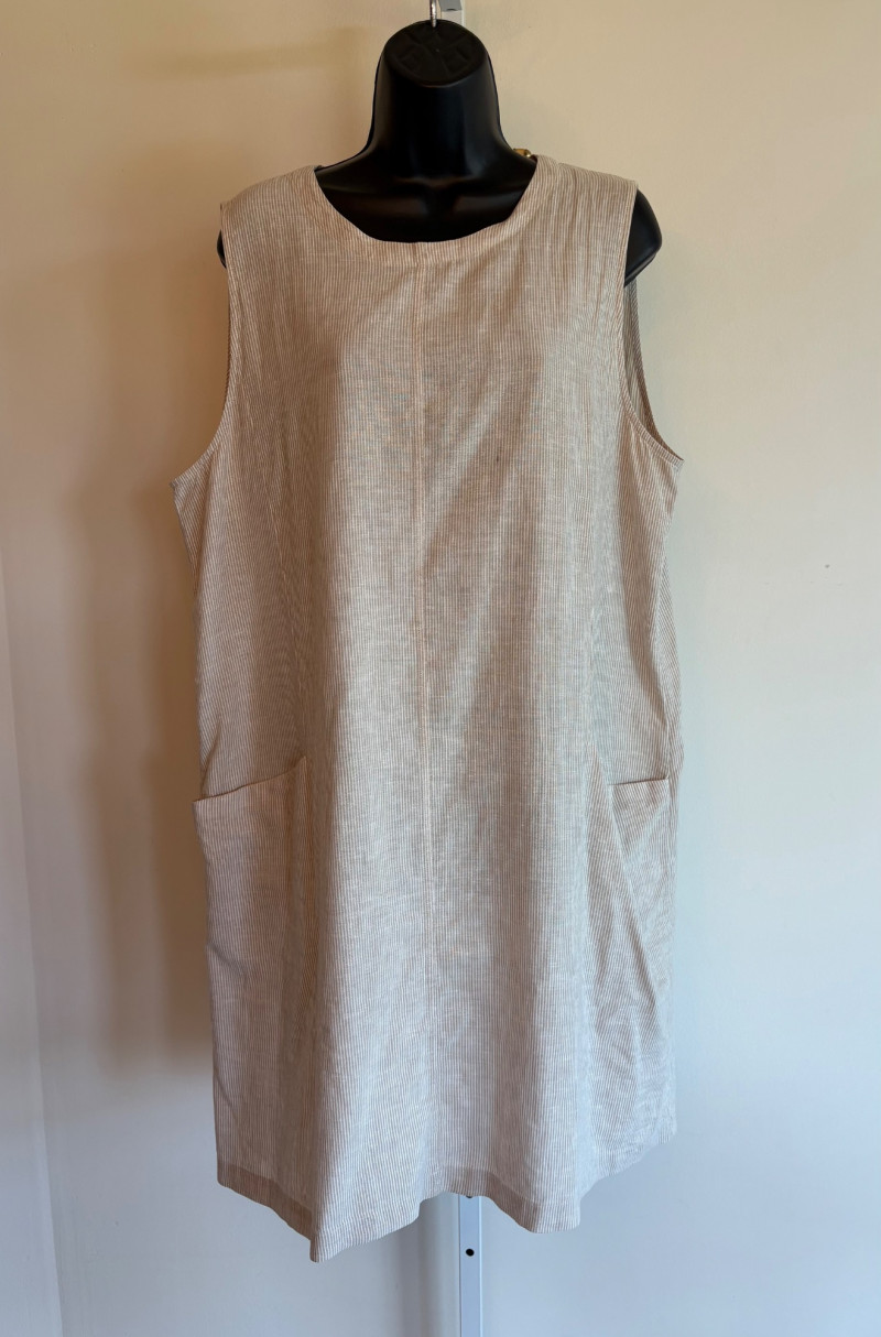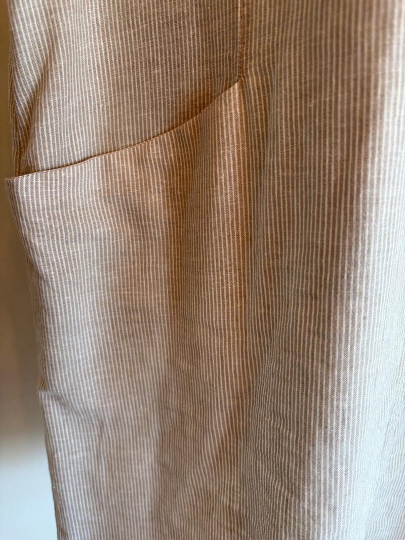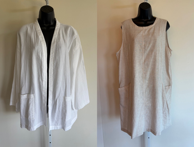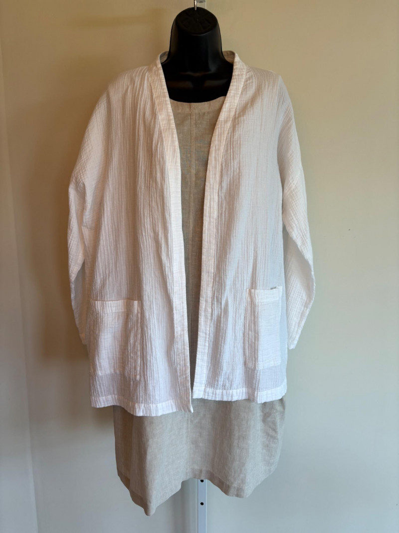 Wonderfully light yet opaque summer dress and jacket duo from Eileen Fisher. With vertical pinstripes in white on tan, this dress has a rounded neckline with single button back closure. Princess seaming gives it a little bit of shaping and there are roomy front patch pockets. In excellent condition. 55% hemp with 45% organic cotton. Measures 23" pit to pit and 36.5" from back neckline to bottom hem. Size tag says XL. Light white cotton gauze jacket has open front, dropped shoulder seams, and front patch pockets. In excellent condition except for a tiny red pen dot on the left sleeve that may launder out - see last photo. 100% organic cotton. Measures 25" pit to pit and 29" from back neckline to bottom hem. Size tag says L/G.