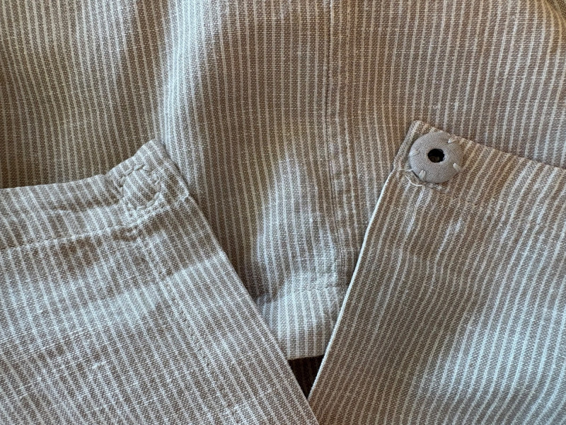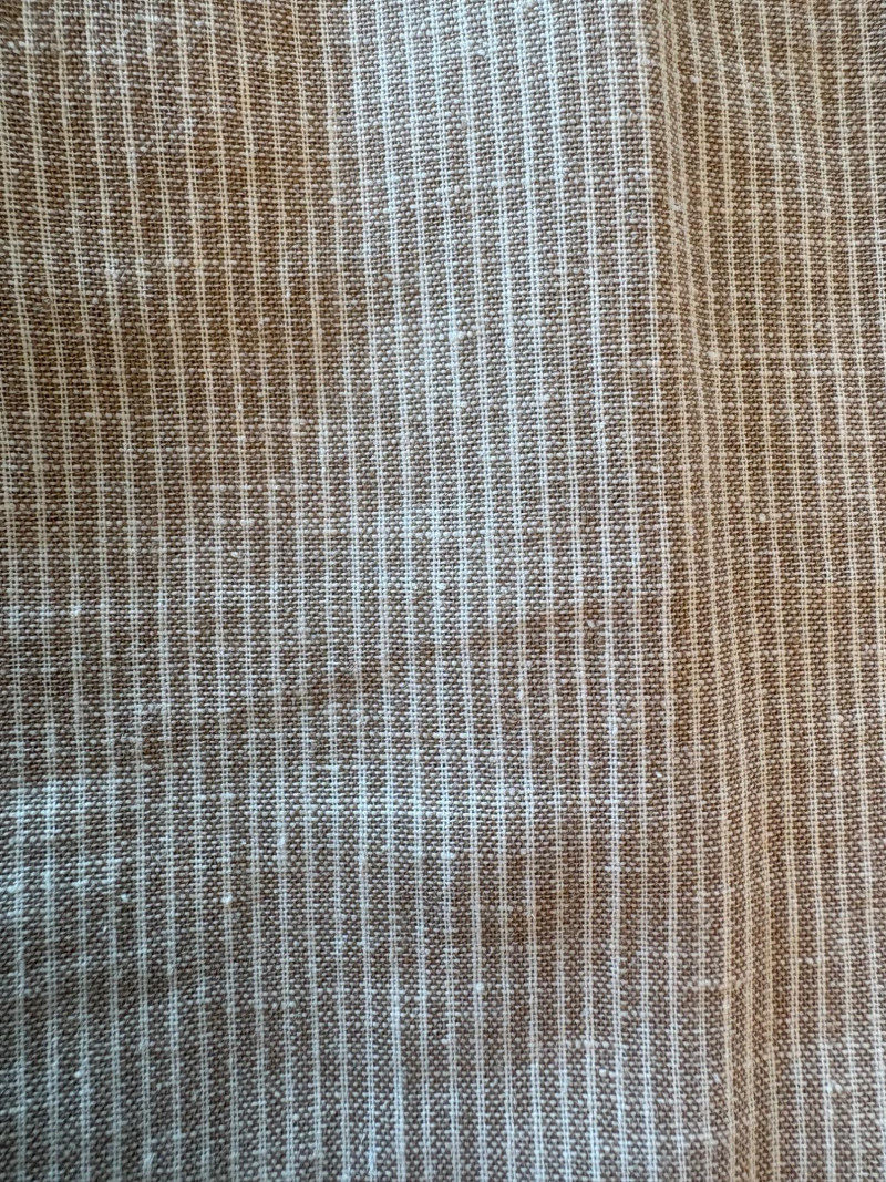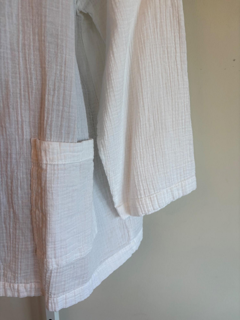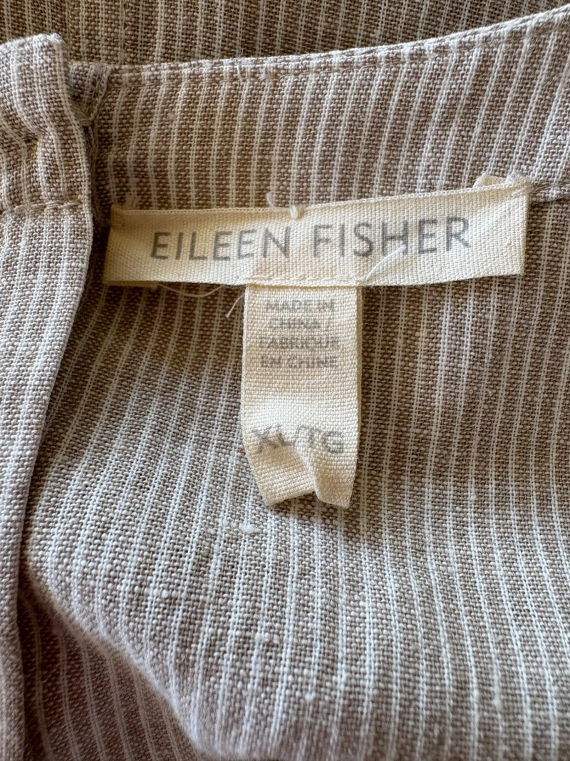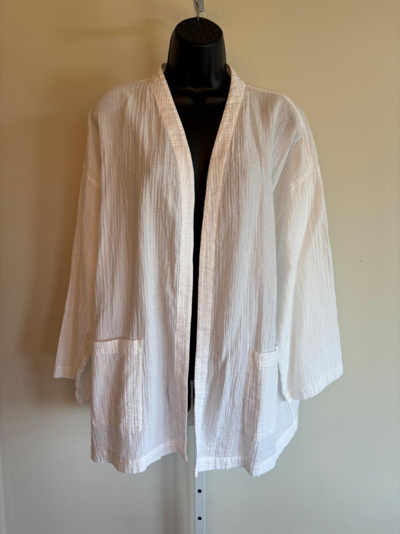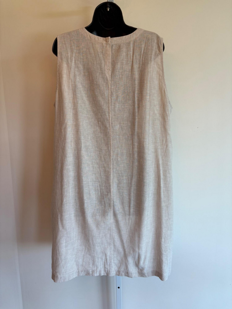 Wonderfully light yet opaque summer dress and jacket duo from Eileen Fisher. With vertical pinstripes in white on tan, this dress has a rounded neckline with single button back closure. Princess seaming gives it a little bit of shaping and there are roomy front patch pockets. In excellent condition. 55% hemp with 45% organic cotton. Measures 23" pit to pit and 36.5" from back neckline to bottom hem. Size tag says XL. Light white cotton gauze jacket has open front, dropped shoulder seams, and front patch pockets. In excellent condition except for a tiny red pen dot on the left sleeve that may launder out - see last photo. 100% organic cotton. Measures 25" pit to pit and 29" from back neckline to bottom hem. Size tag says L/G.