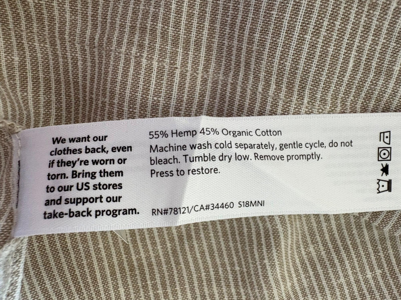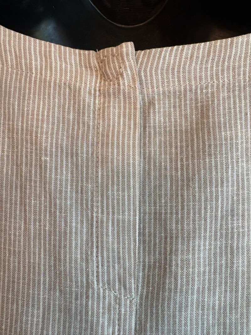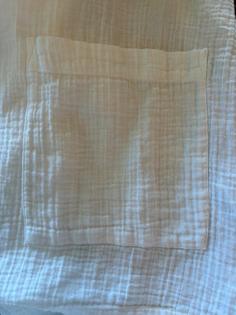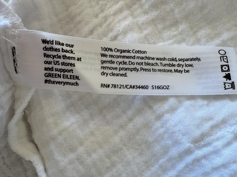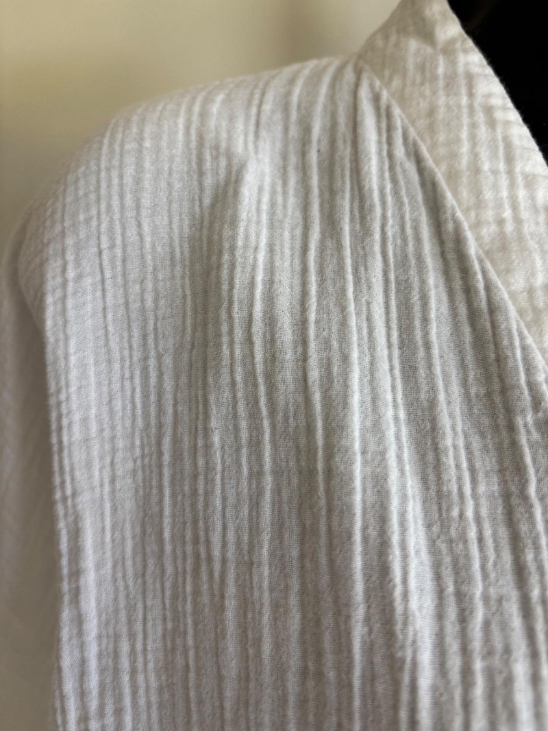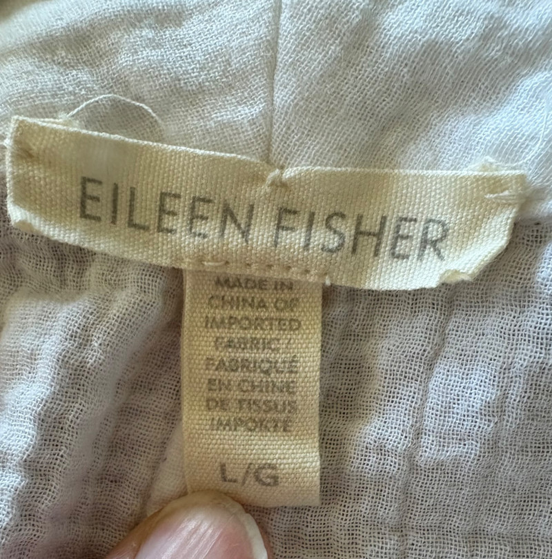 Wonderfully light yet opaque summer dress and jacket duo from Eileen Fisher. With vertical pinstripes in white on tan, this dress has a rounded neckline with single button back closure. Princess seaming gives it a little bit of shaping and there are roomy front patch pockets. In excellent condition. 55% hemp with 45% organic cotton. Measures 23" pit to pit and 36.5" from back neckline to bottom hem. Size tag says XL. Light white cotton gauze jacket has open front, dropped shoulder seams, and front patch pockets. In excellent condition except for a tiny red pen dot on the left sleeve that may launder out - see last photo. 100% organic cotton. Measures 25" pit to pit and 29" from back neckline to bottom hem. Size tag says L/G.