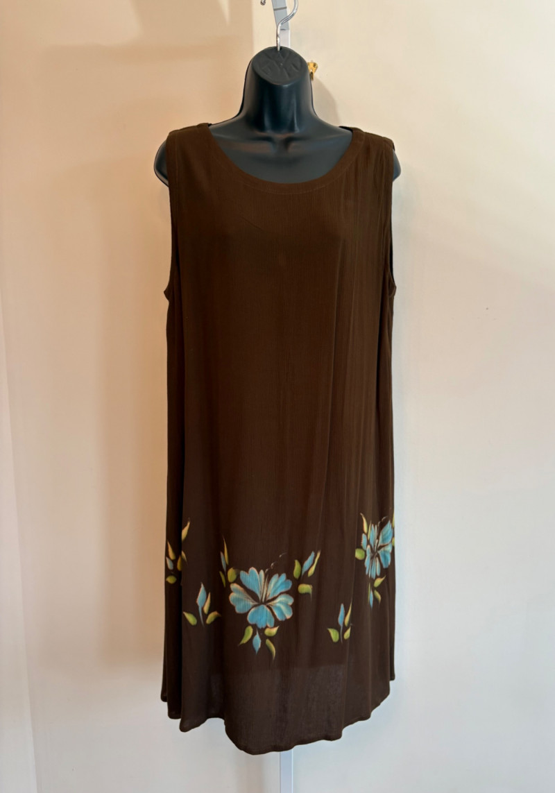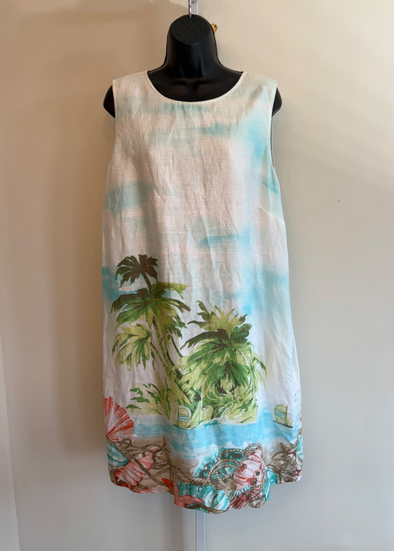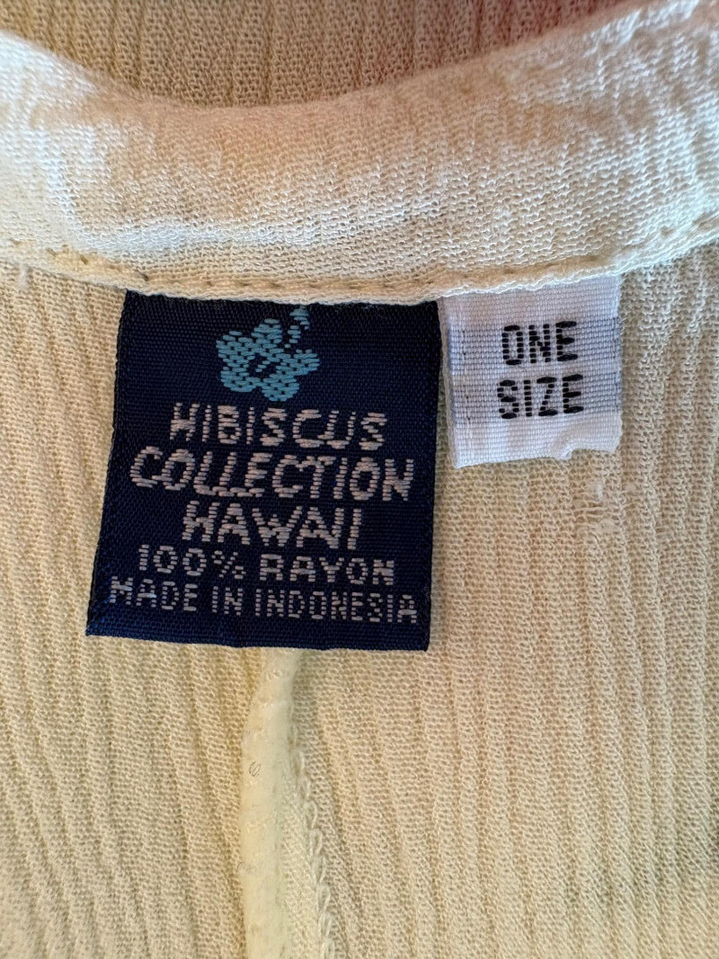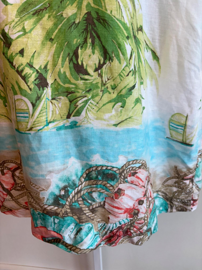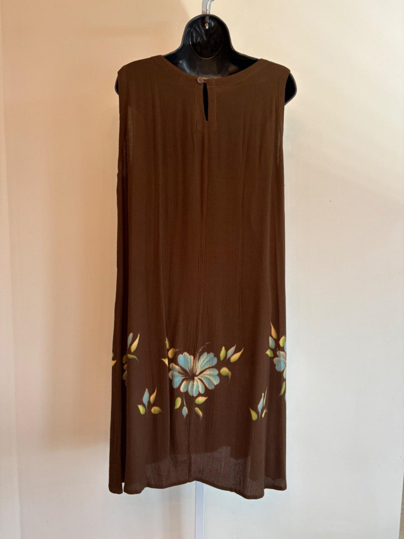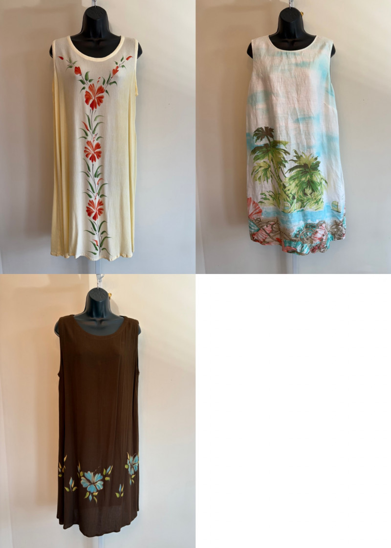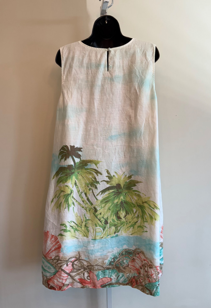 Three sleeveless dresses perfect for those warmer days from J. Jill and Hibiscus Collection Hawaii. (We think the Hibiscus Collection Hawaii ones are vintage.) Ivory gauzy dress from Hibiscus Collection Hawaii has orange & green floral motifs along the center front/back and neckline. In excellent condition. Great fall to the fabric. 100% rayon. Measures 22" pit to pit and 37" from back neckline to hem. Size tag says OSFA. Brown gauzy dress from Hibiscus Collection Hawaii has blue-green & yellow floral motifs along the hemline & single button back closure. In excellent condition. Great fall to the fabric. 100% rayon. Measures 22.5" pit to pit and 41" from back neckline to hem. Size tag says OSFA. Surfside scene dress from J. Jill has a wide variety of colors with palm trees and beach items along the lower area of the dress. Side in-seam pockets, bust darts, single button back closure, and fully lined. In great condition except for a faint discoloration on the upper left armhole we noticed while doing close-ups. We think it might launder out, but even if not, it isn't noticeable unless you know it's there - see last photo. 100% linen. Measures 23" pit to pit and 38" from back neckline to hem. Size tag says XL.