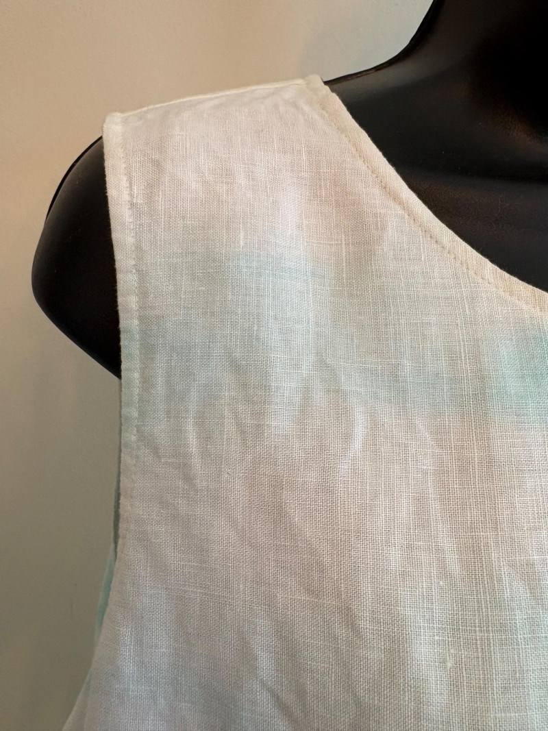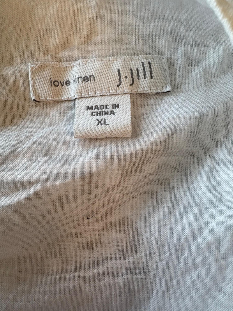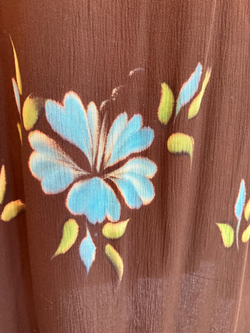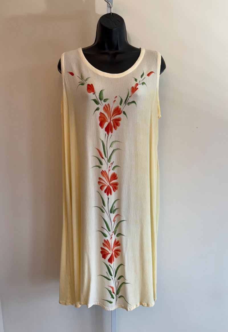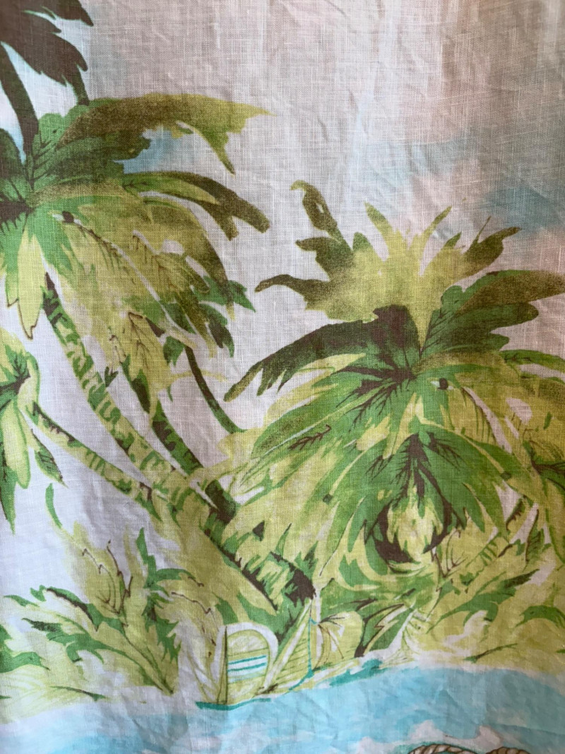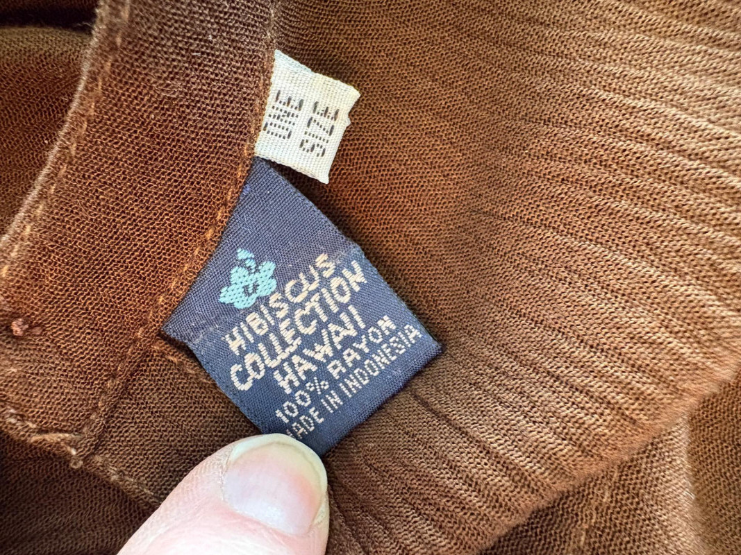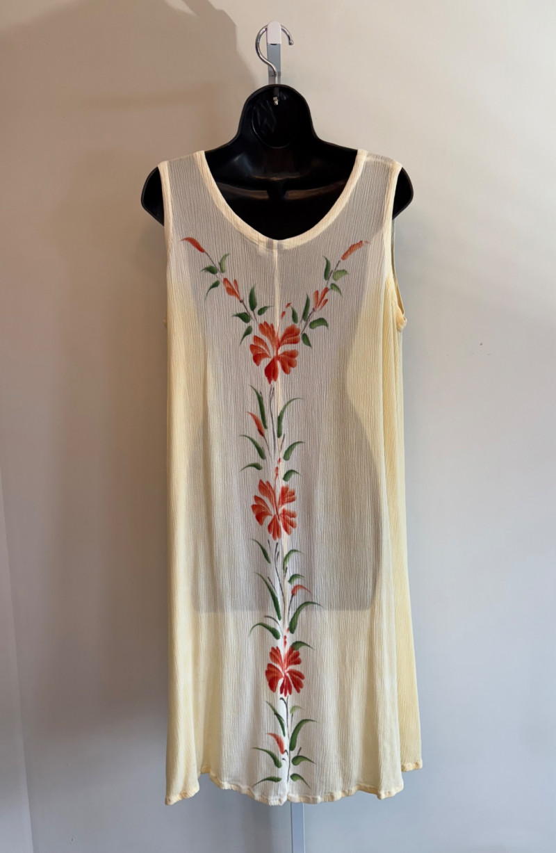 Three sleeveless dresses perfect for those warmer days from J. Jill and Hibiscus Collection Hawaii. (We think the Hibiscus Collection Hawaii ones are vintage.) Ivory gauzy dress from Hibiscus Collection Hawaii has orange & green floral motifs along the center front/back and neckline. In excellent condition. Great fall to the fabric. 100% rayon. Measures 22" pit to pit and 37" from back neckline to hem. Size tag says OSFA. Brown gauzy dress from Hibiscus Collection Hawaii has blue-green & yellow floral motifs along the hemline & single button back closure. In excellent condition. Great fall to the fabric. 100% rayon. Measures 22.5" pit to pit and 41" from back neckline to hem. Size tag says OSFA. Surfside scene dress from J. Jill has a wide variety of colors with palm trees and beach items along the lower area of the dress. Side in-seam pockets, bust darts, single button back closure, and fully lined. In great condition except for a faint discoloration on the upper left armhole we noticed while doing close-ups. We think it might launder out, but even if not, it isn't noticeable unless you know it's there - see last photo. 100% linen. Measures 23" pit to pit and 38" from back neckline to hem. Size tag says XL.