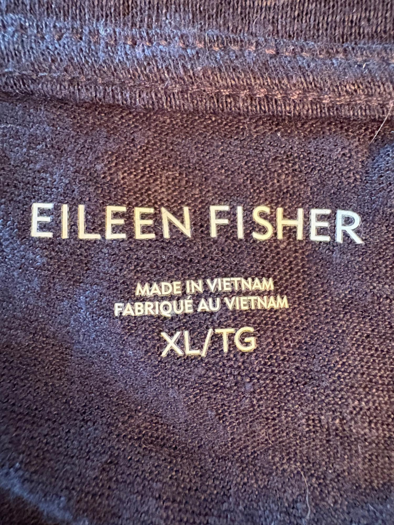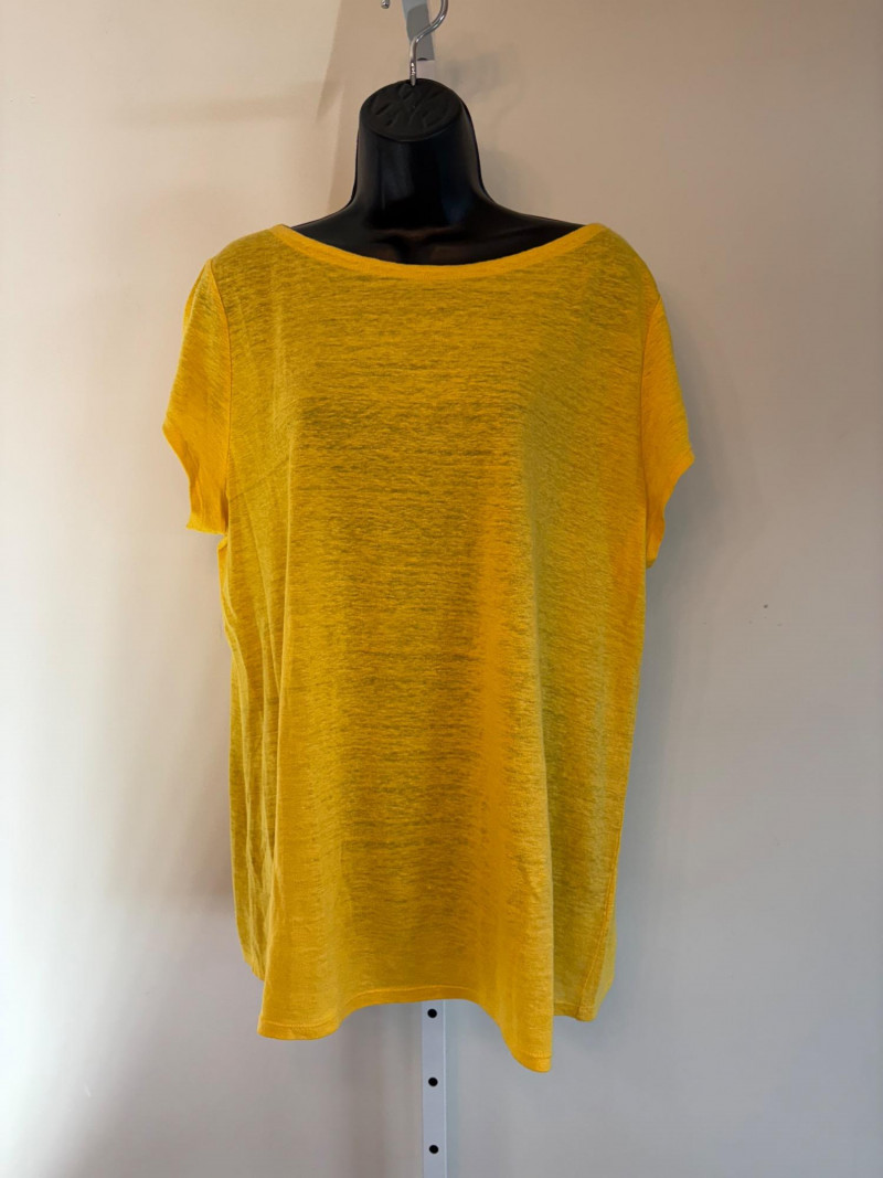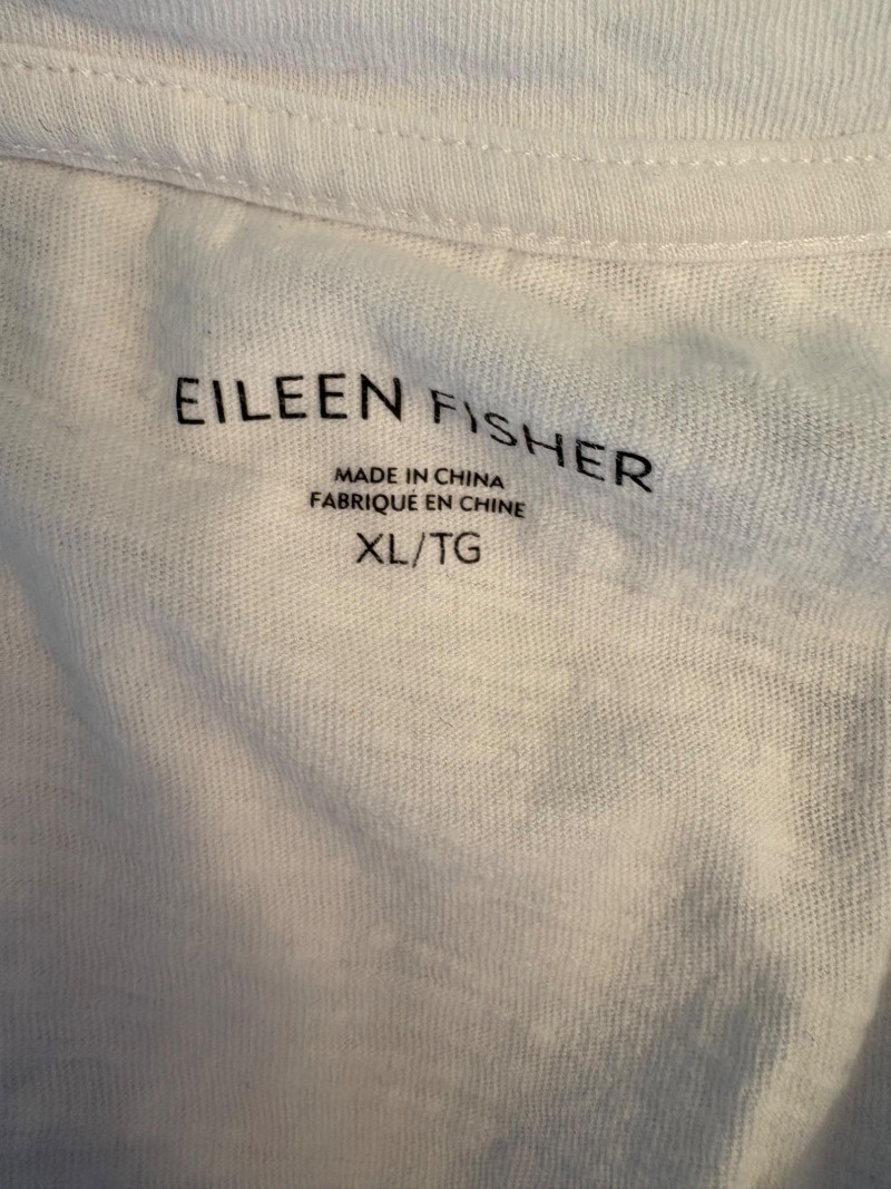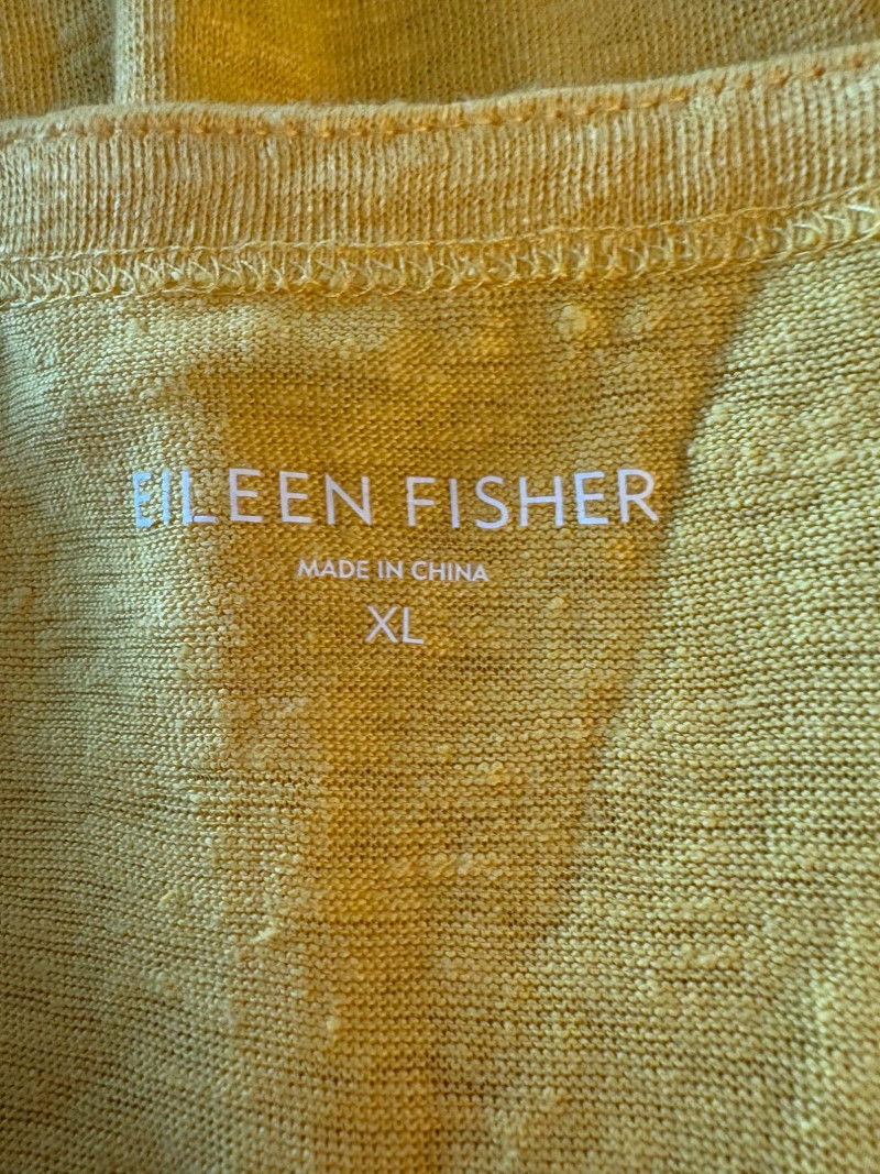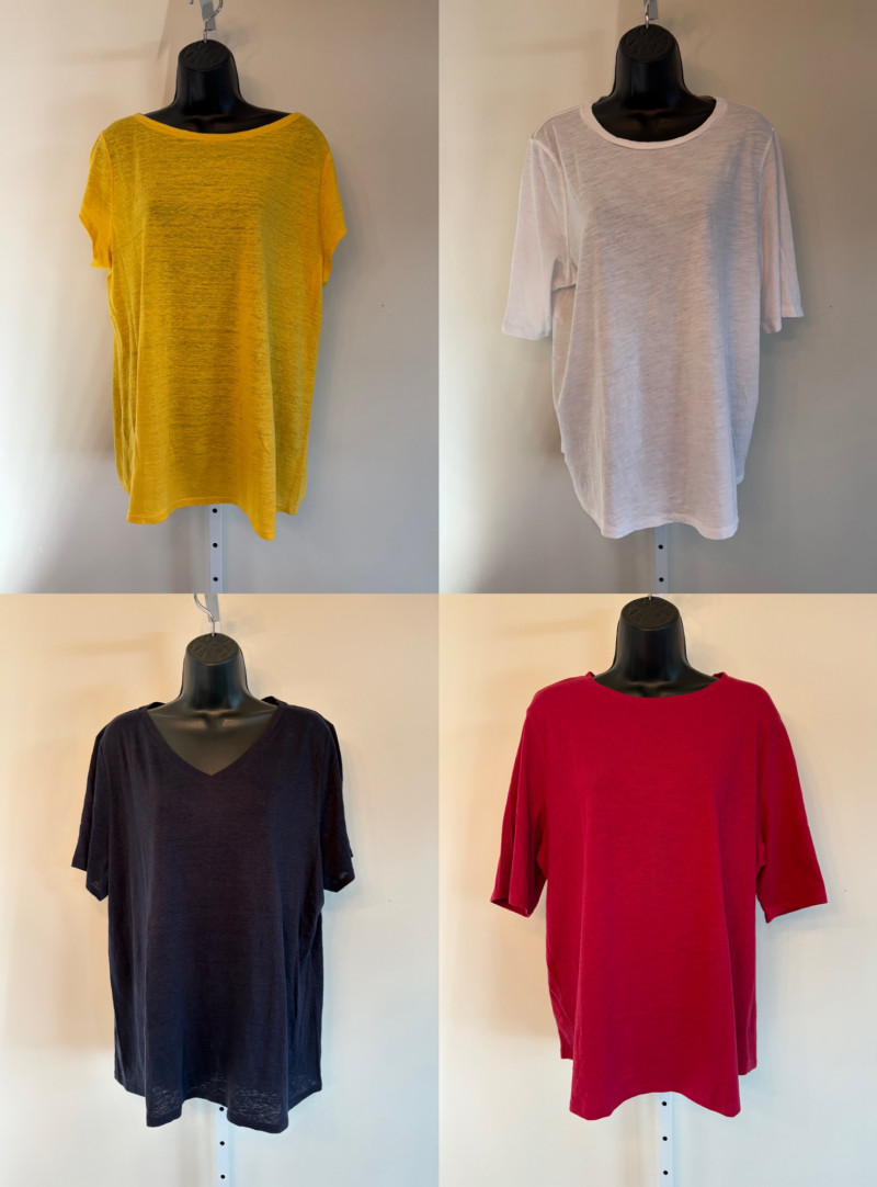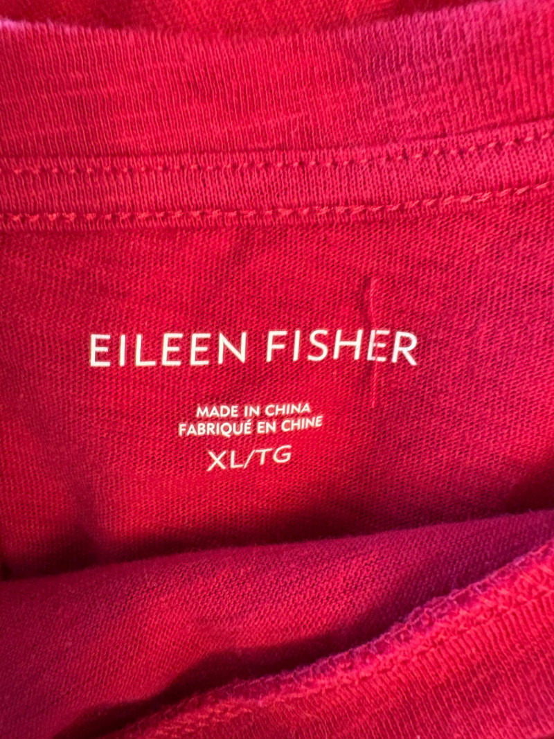 4 great t-shirts in yellow, white, red, and black from Eileen Fisher. All in excellent condition. All measure 23" pit to pit and 26" in length with size tags saying XL. Yellow shirt is 100% organic linen. White shirt is 100% organic cotton. Black V-neck t-shirt is 100% organic linen. Red shirt is 100% organic cotton.