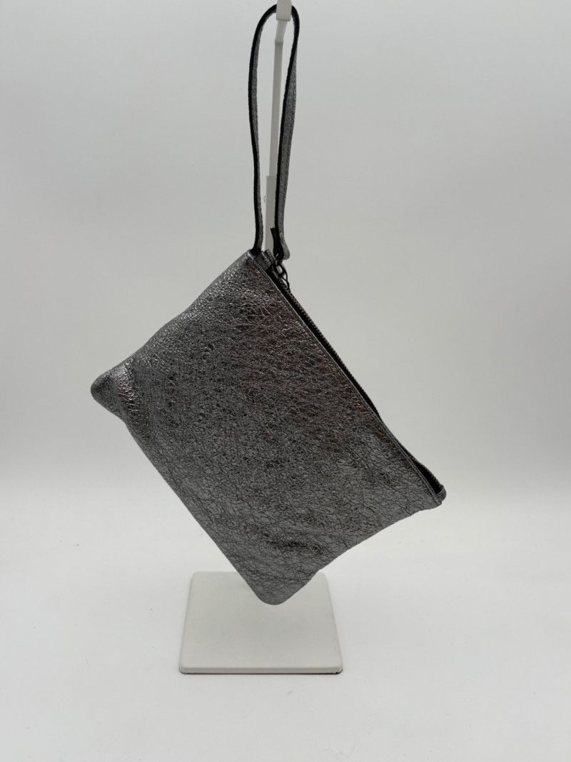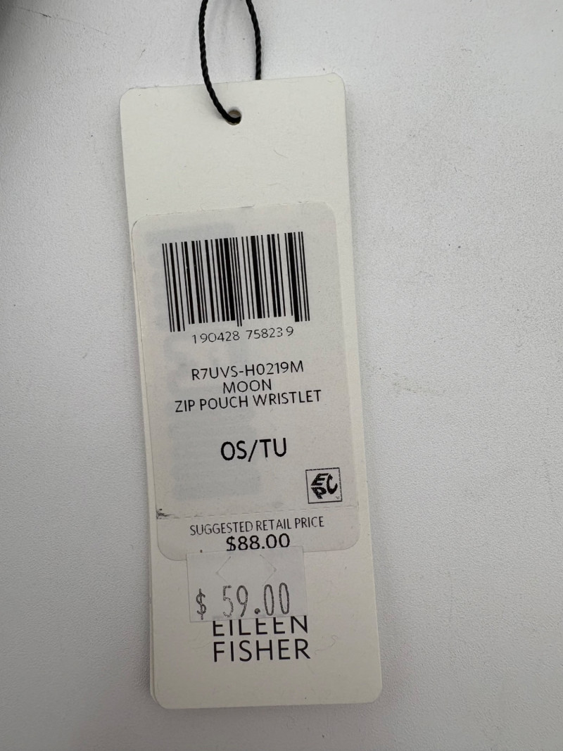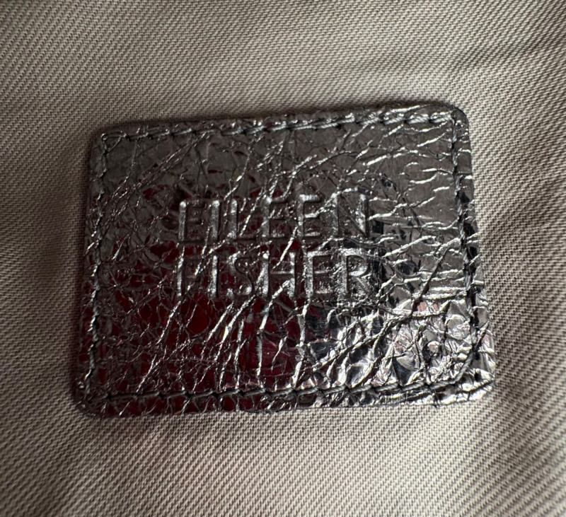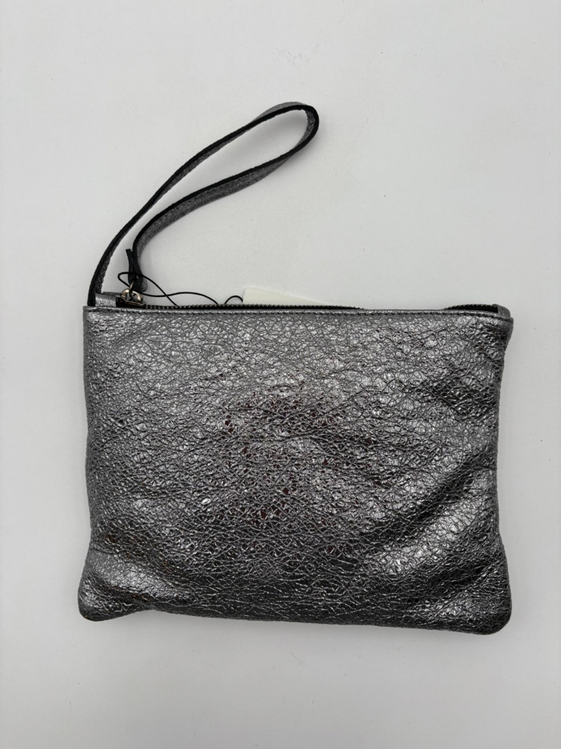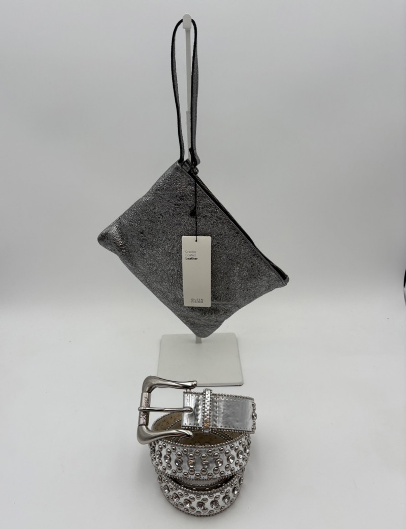 Shiny silver duo would go terrifically with anything black! Wrist purse from Eileen Fisher in a bit larger size than most - easily holds a phone & comb with lots of room left. Silver crackled leather exterior, metal zip top, 1/2" wide zip/wrist strap, and interior lining with card pockets. New with tag. Measures 6.5" x 8.5". Silver studded belt from Guess has rhinestones and a large buckle. Can accommodate waists from 39" to 43" In very good used condition - no content tag, but appears to be leather.