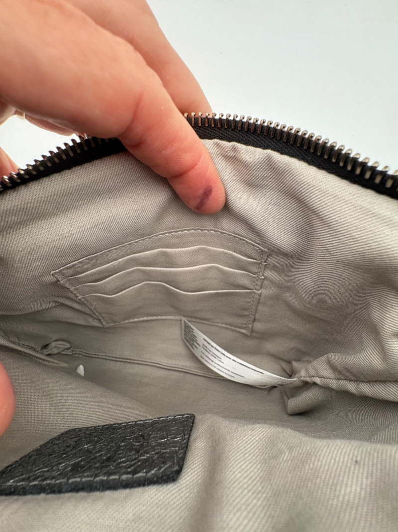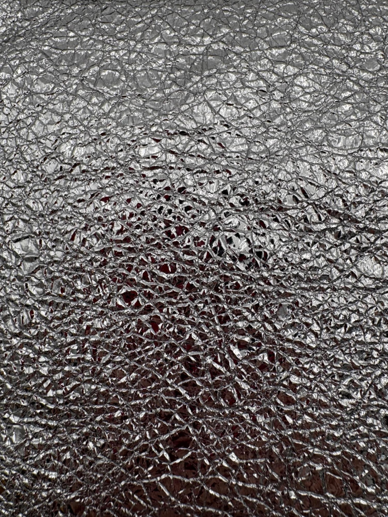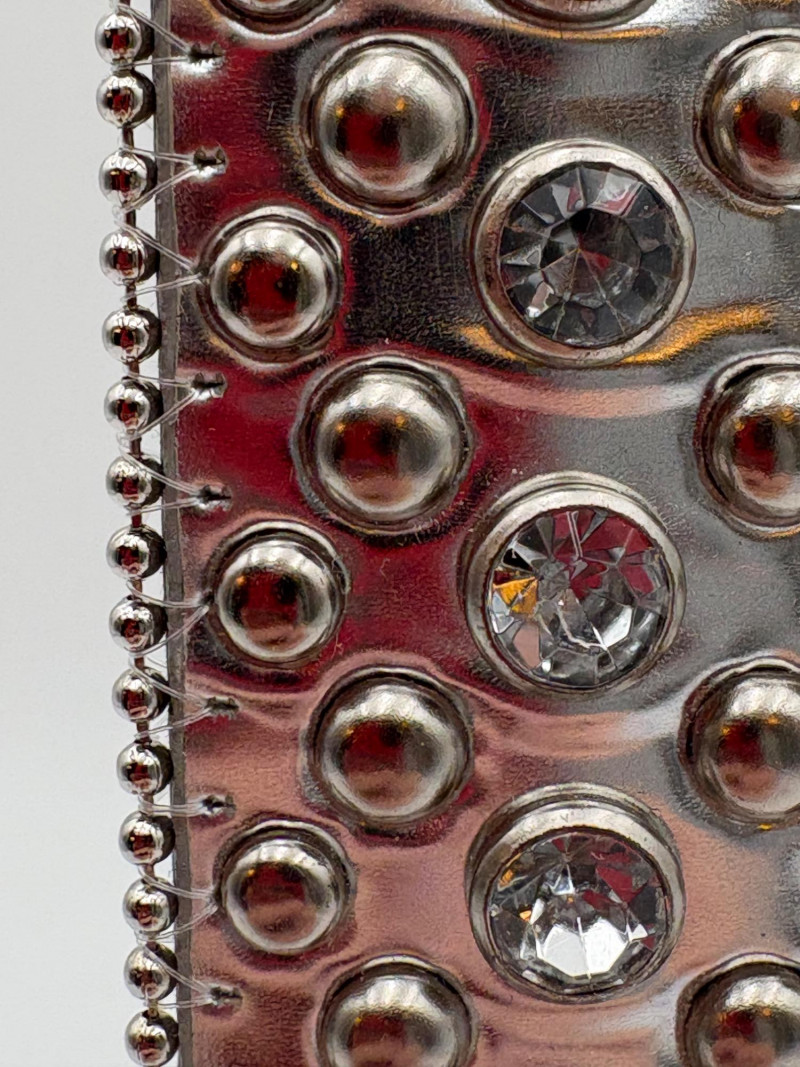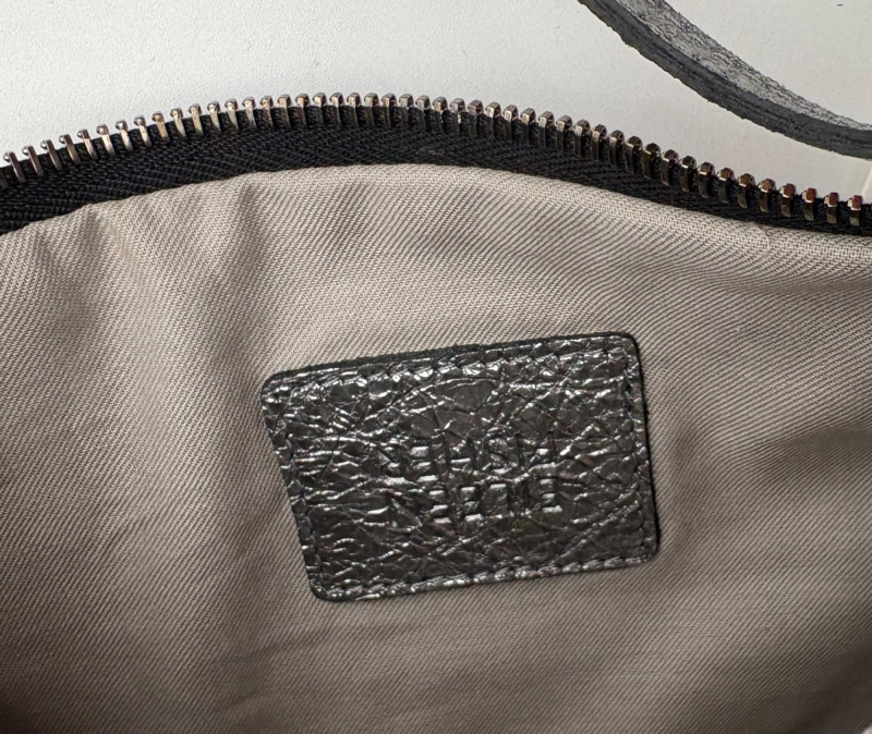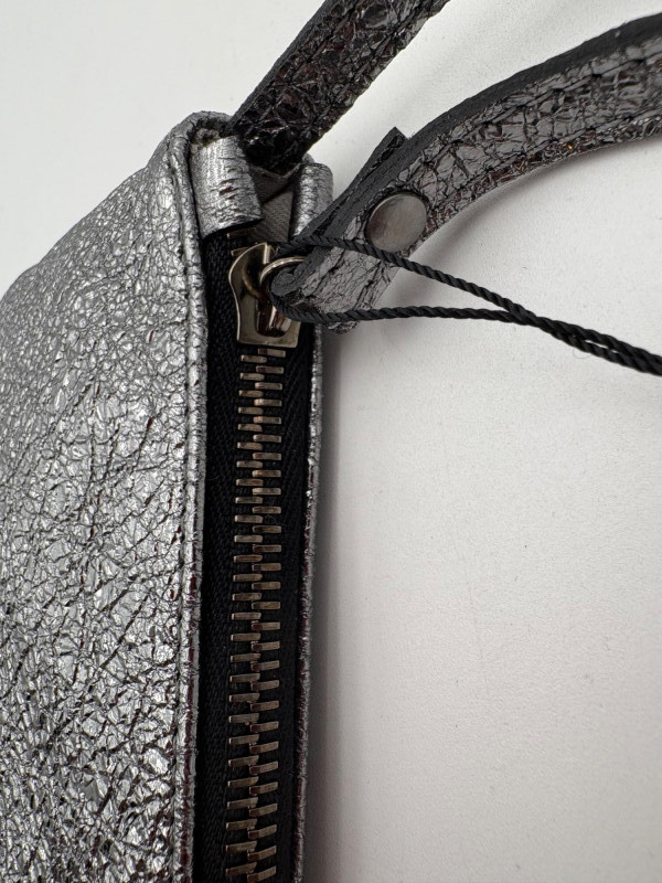 Shiny silver duo would go terrifically with anything black! Wrist purse from Eileen Fisher in a bit larger size than most - easily holds a phone & comb with lots of room left. Silver crackled leather exterior, metal zip top, 1/2" wide zip/wrist strap, and interior lining with card pockets. New with tag. Measures 6.5" x 8.5". Silver studded belt from Guess has rhinestones and a large buckle. Can accommodate waists from 39" to 43" In very good used condition - no content tag, but appears to be leather.