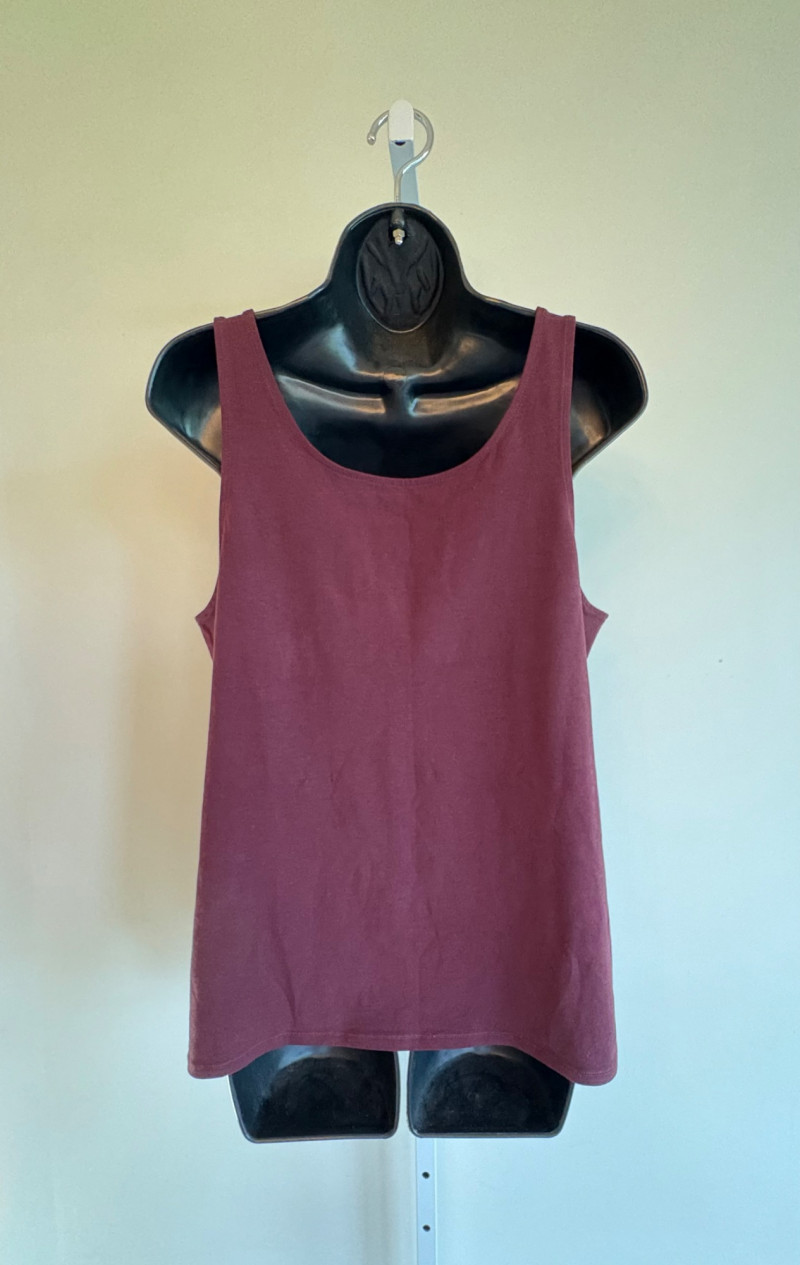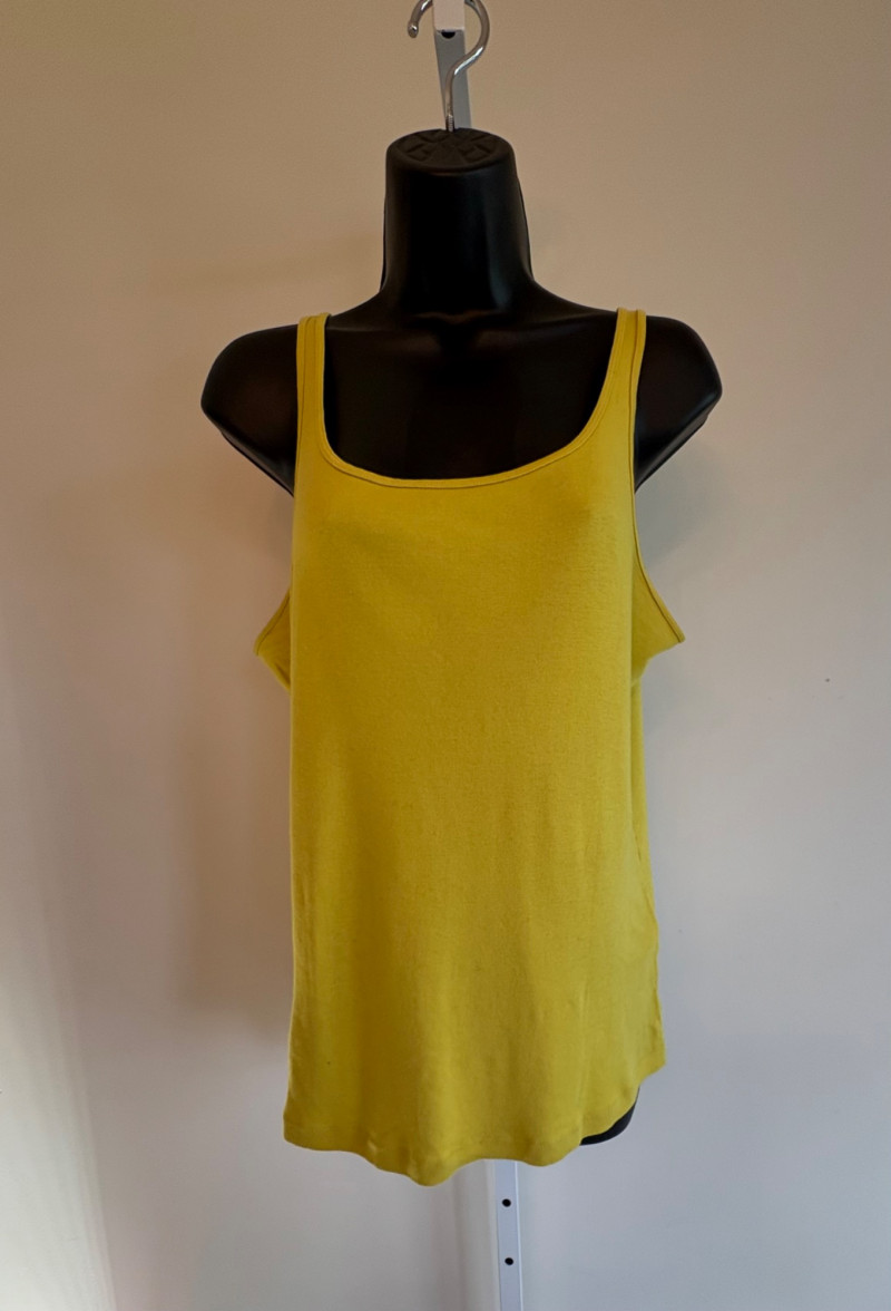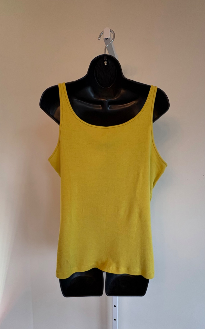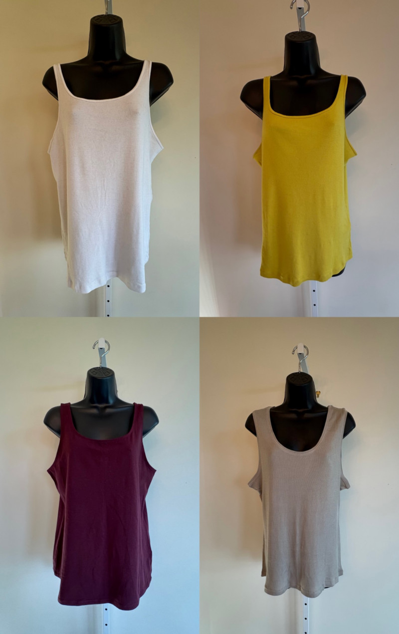 4 tanks in interesting colors from various makers. All measure 18.5" pit to pit and between 24" - 26" from shoulder strap to hem and all are in excellent condition. White tank from Eileen Fisher is 100% organic cotton. Size tag is unclear. Yellow tank from Eileen Fisher is 100% organic cotton. Size tag is missing. Maroon tank from J. Jill is 95% cotton with 5% spandex, Size tag sys L. Silvery/beige tank from Poetry is 85% silk with 15% cashmere. Size tag says 16.