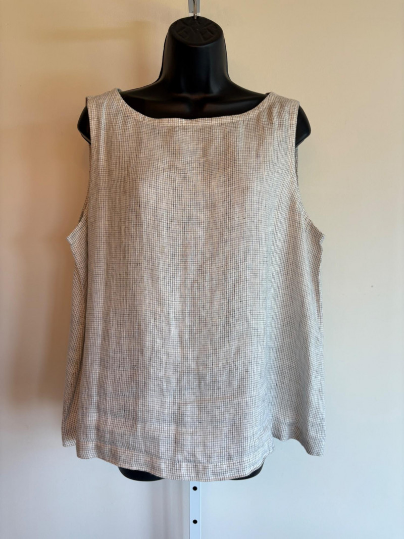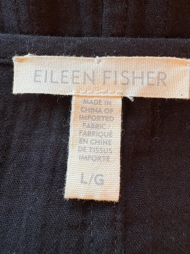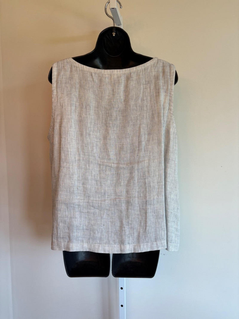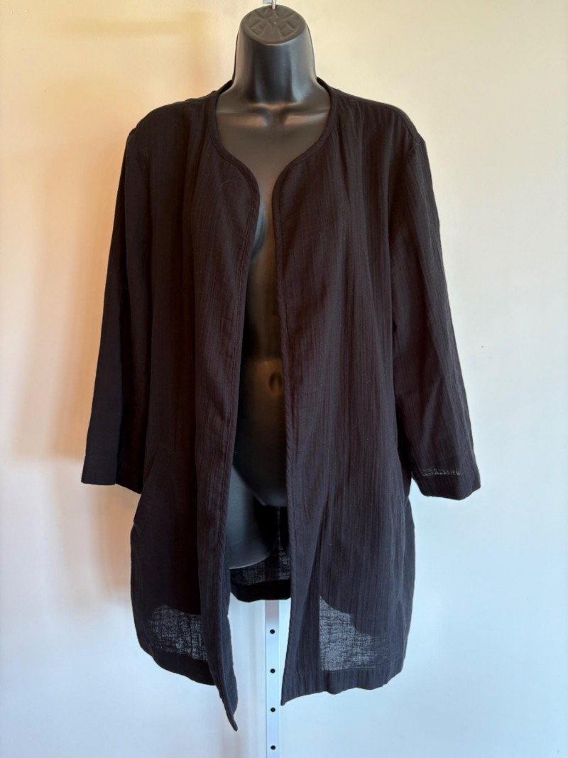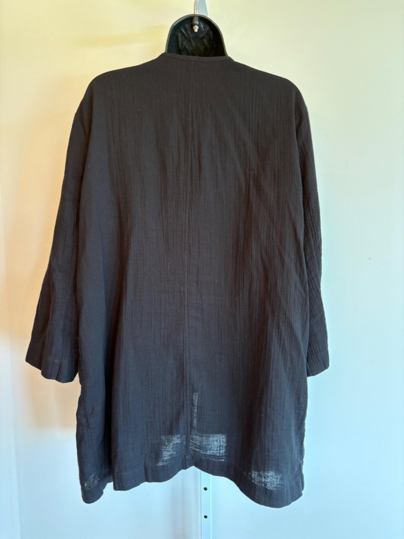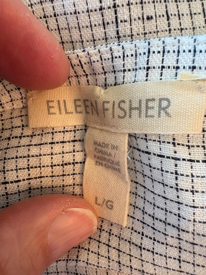 Great duo in black & white from Eileen Fisher. Gridded black on white shell has rounded neck and a slightly flared cut. in excellent condition. 100% organic linen. Measures 22.5" pit to pit and 23" from back neckline to hem. Size tag says L/G. Black gauze jacket has open front with banded edge along with angled front slash pockets with welts. In excellent condition. 100% organic cotton. Measures 24" pit to pit and 32" from back neckline to hem. Size tag says L/G.