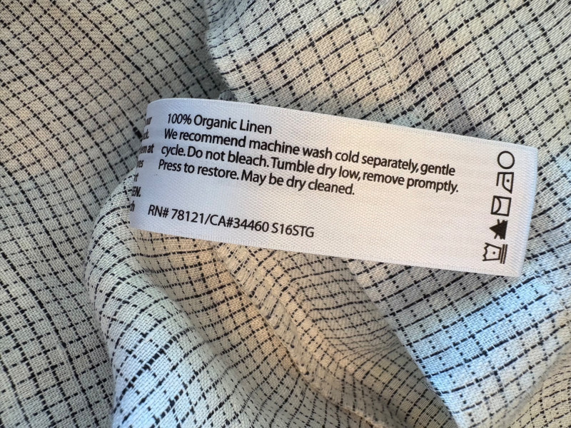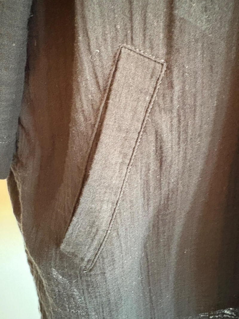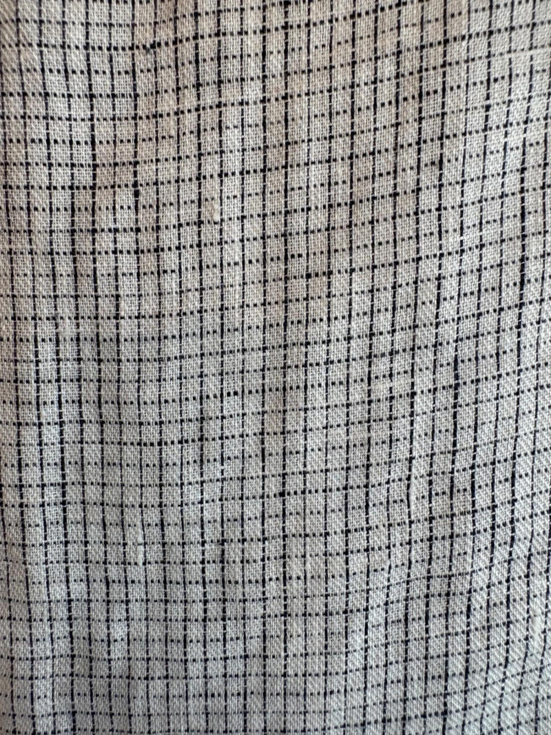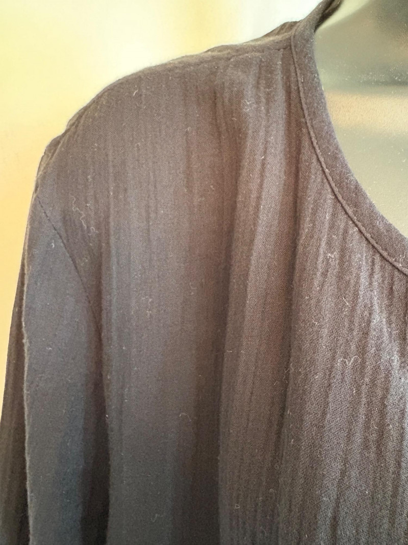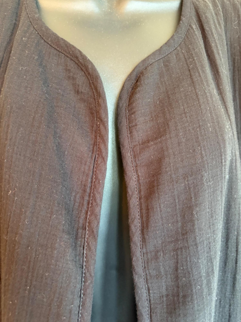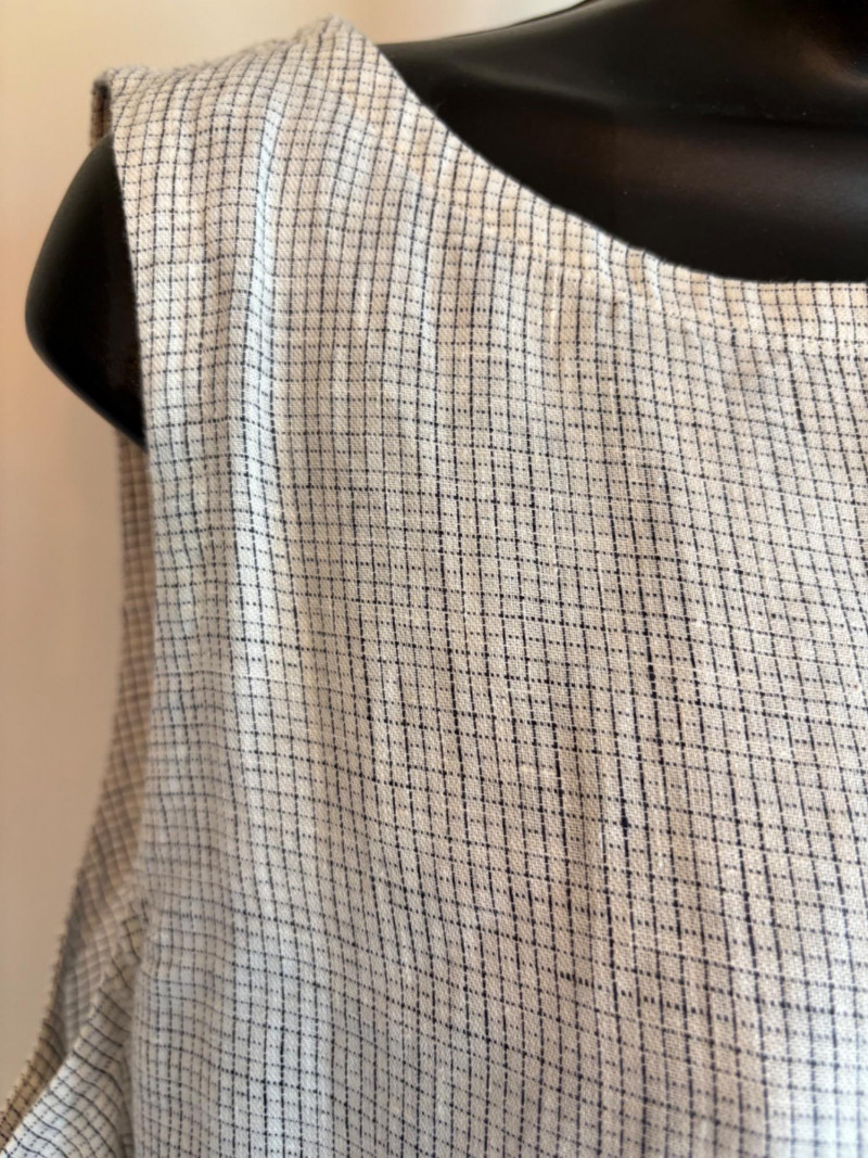 Great duo in black & white from Eileen Fisher. Gridded black on white shell has rounded neck and a slightly flared cut. in excellent condition. 100% organic linen. Measures 22.5" pit to pit and 23" from back neckline to hem. Size tag says L/G. Black gauze jacket has open front with banded edge along with angled front slash pockets with welts. In excellent condition. 100% organic cotton. Measures 24" pit to pit and 32" from back neckline to hem. Size tag says L/G.