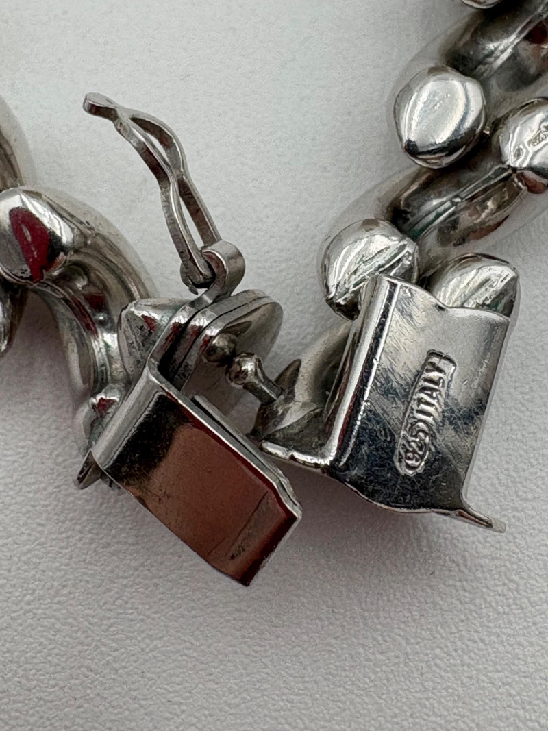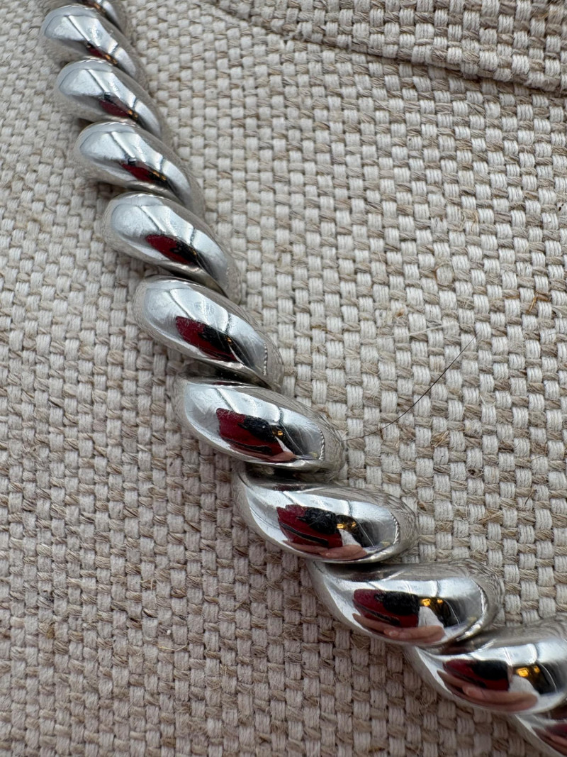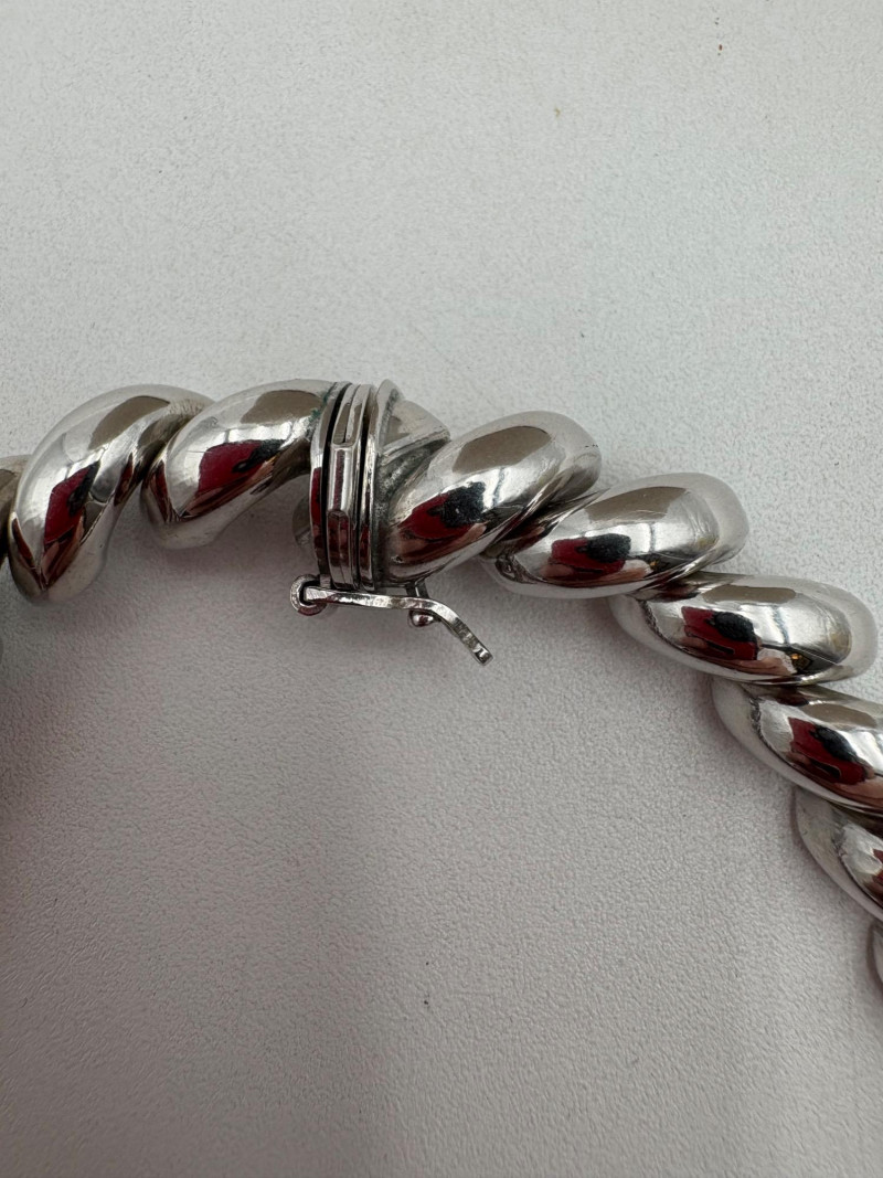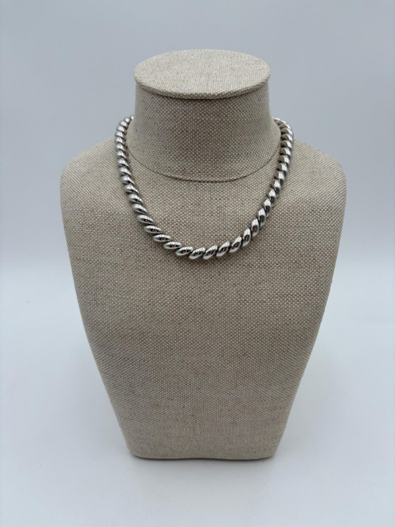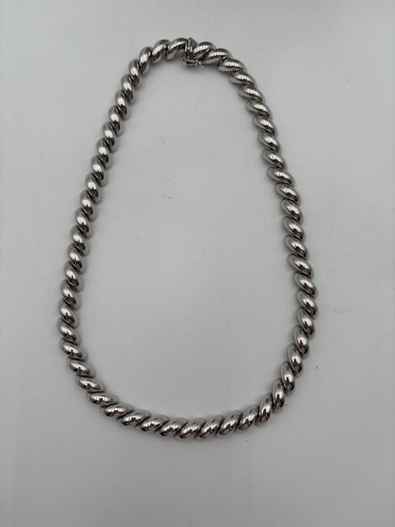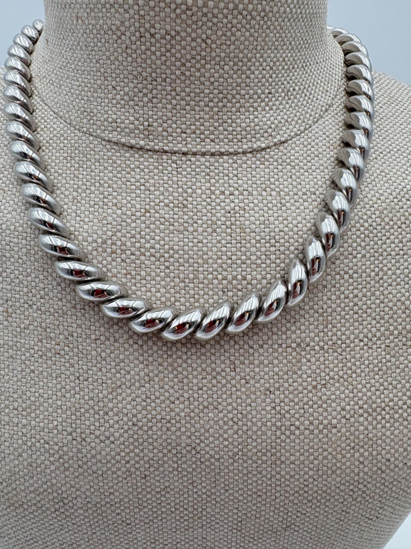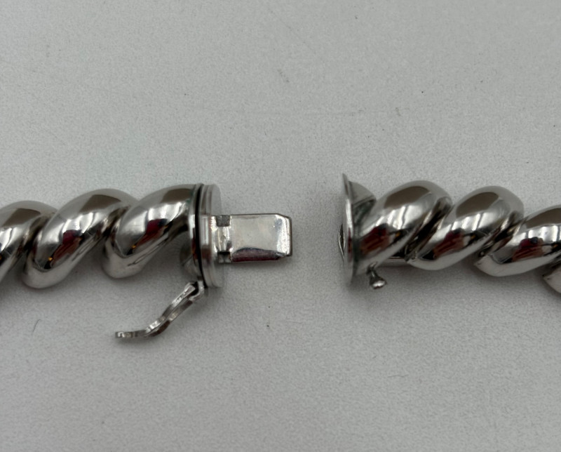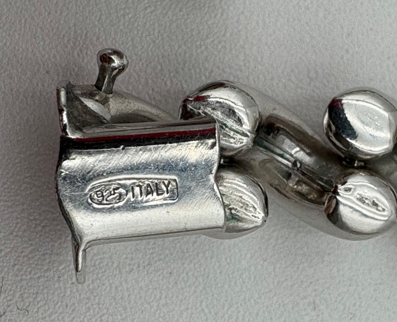 This minimalist sterling silver (.925) chain is thick enough to be noticed, but not so thick that it can't go with a breezy summer sheer top. Unique closure - slide-in with a small spring stop and then a swing clasp. Rides high on the neck - perfect for curved/scoop necklines. Measures just shy of 18" L. No maker mark found, but sterling stamp and "Made in Italy" embossed on the clasp. Weighs 52 grams.