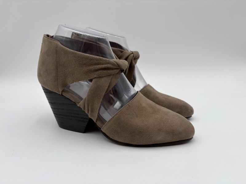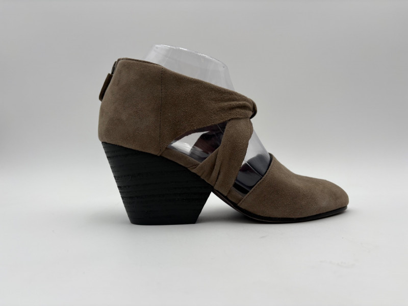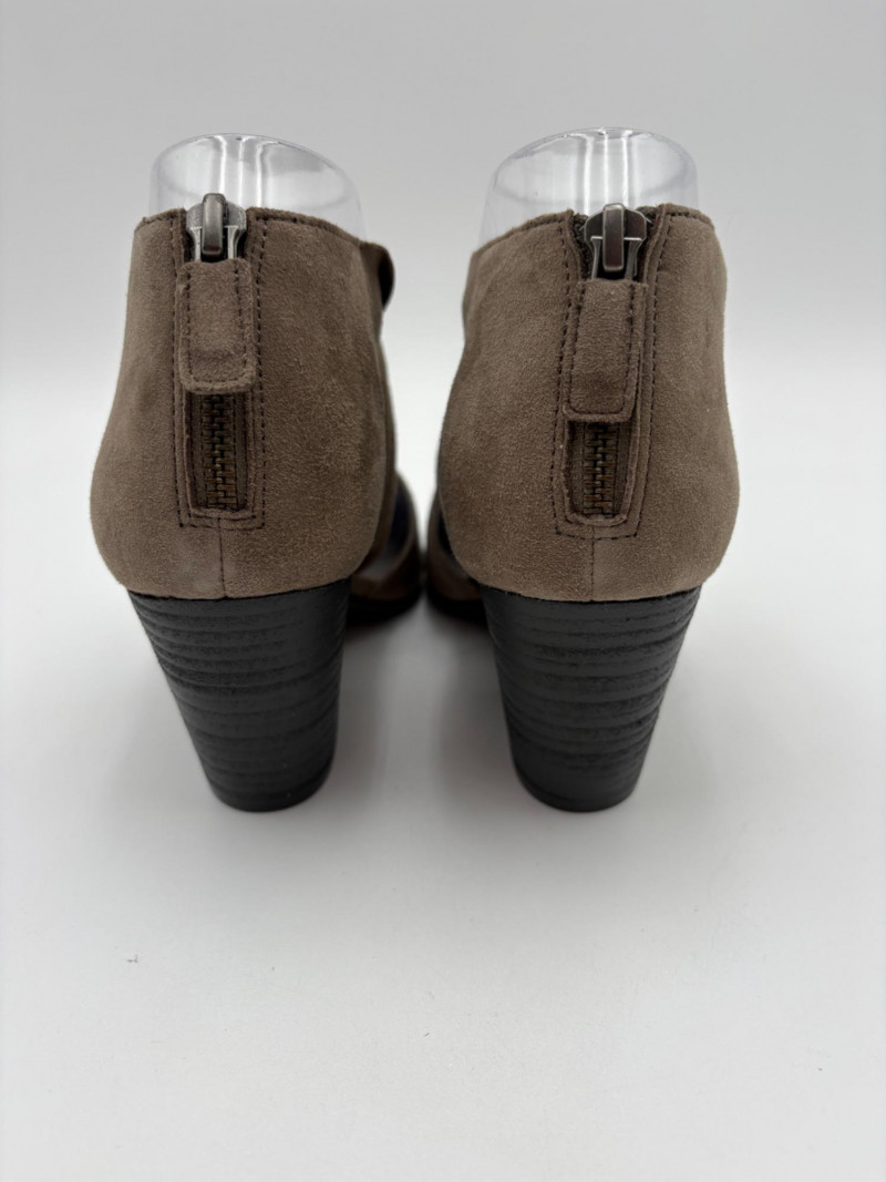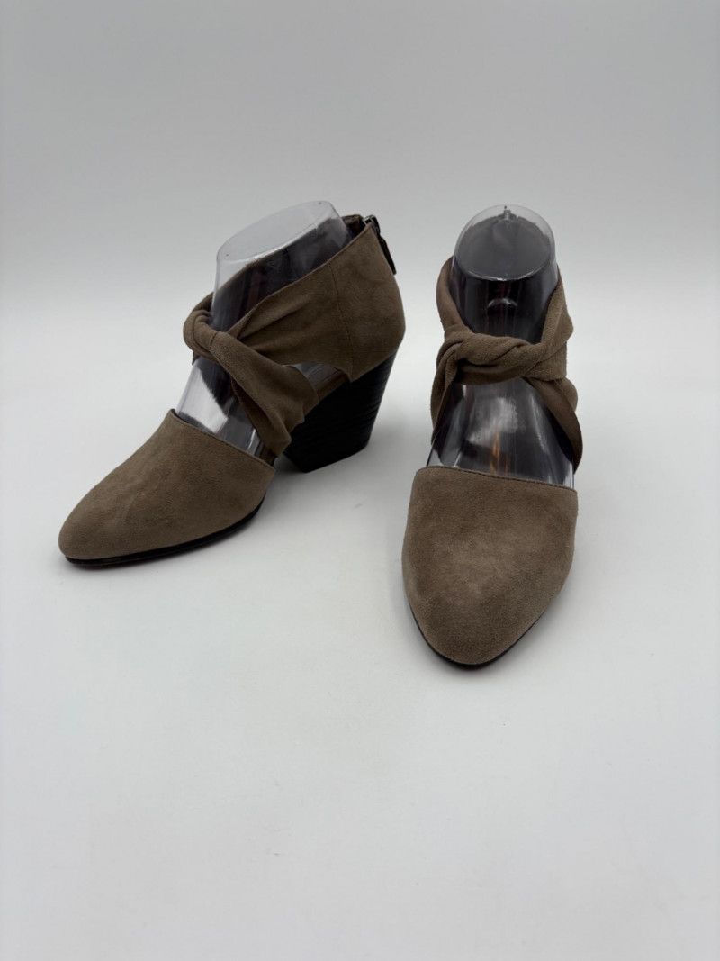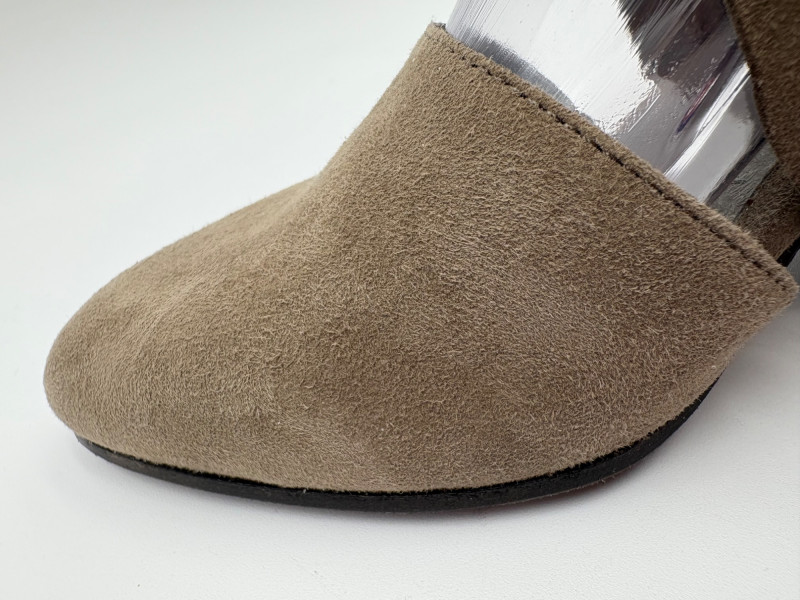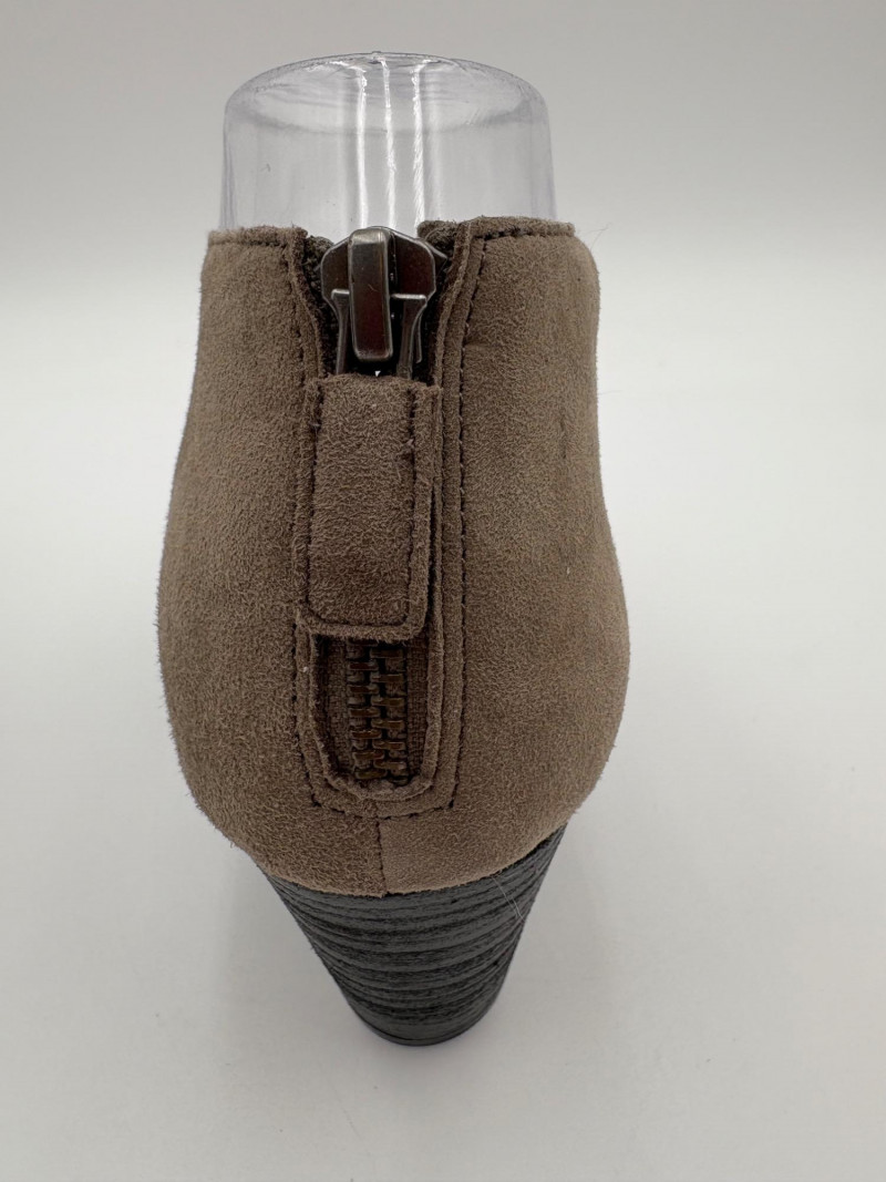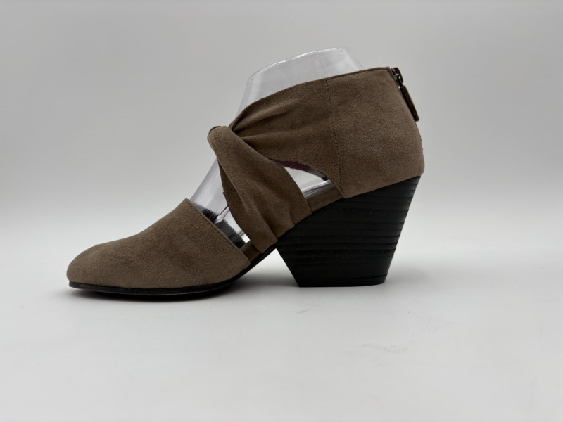 Beautiful pair of grey-taupe suede chunky heels with closed toe, zip back, and super soft wrap over the top of the foot. Stacked black 3" H heel with non-slip rubber insert on sole. Appear new - no soiling on soles or signs of use. Size 7.