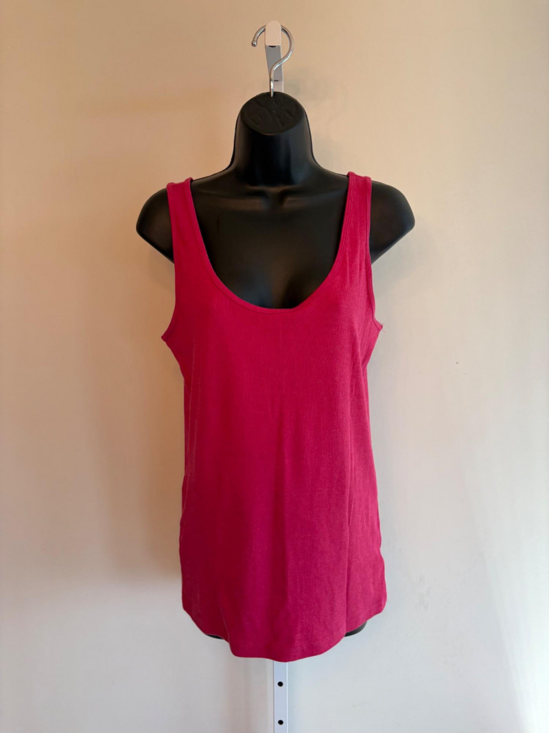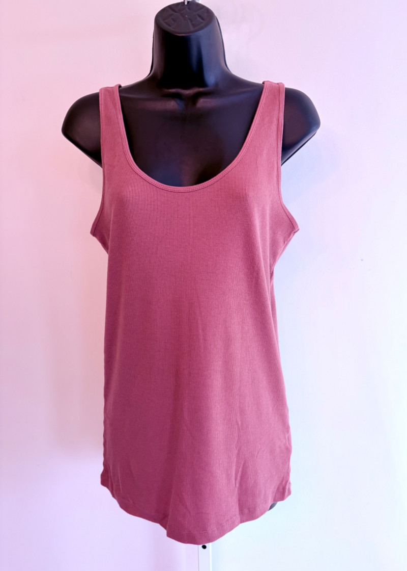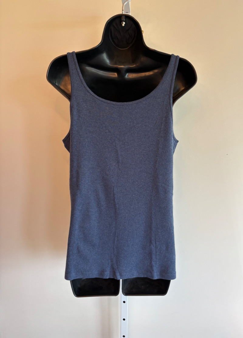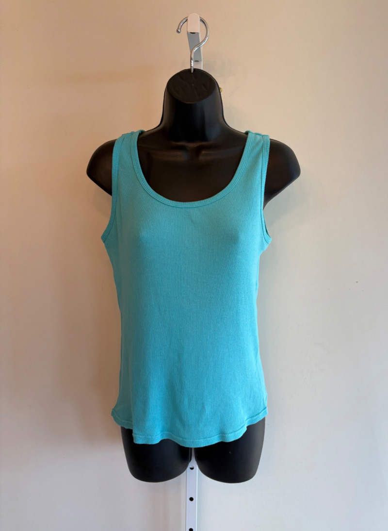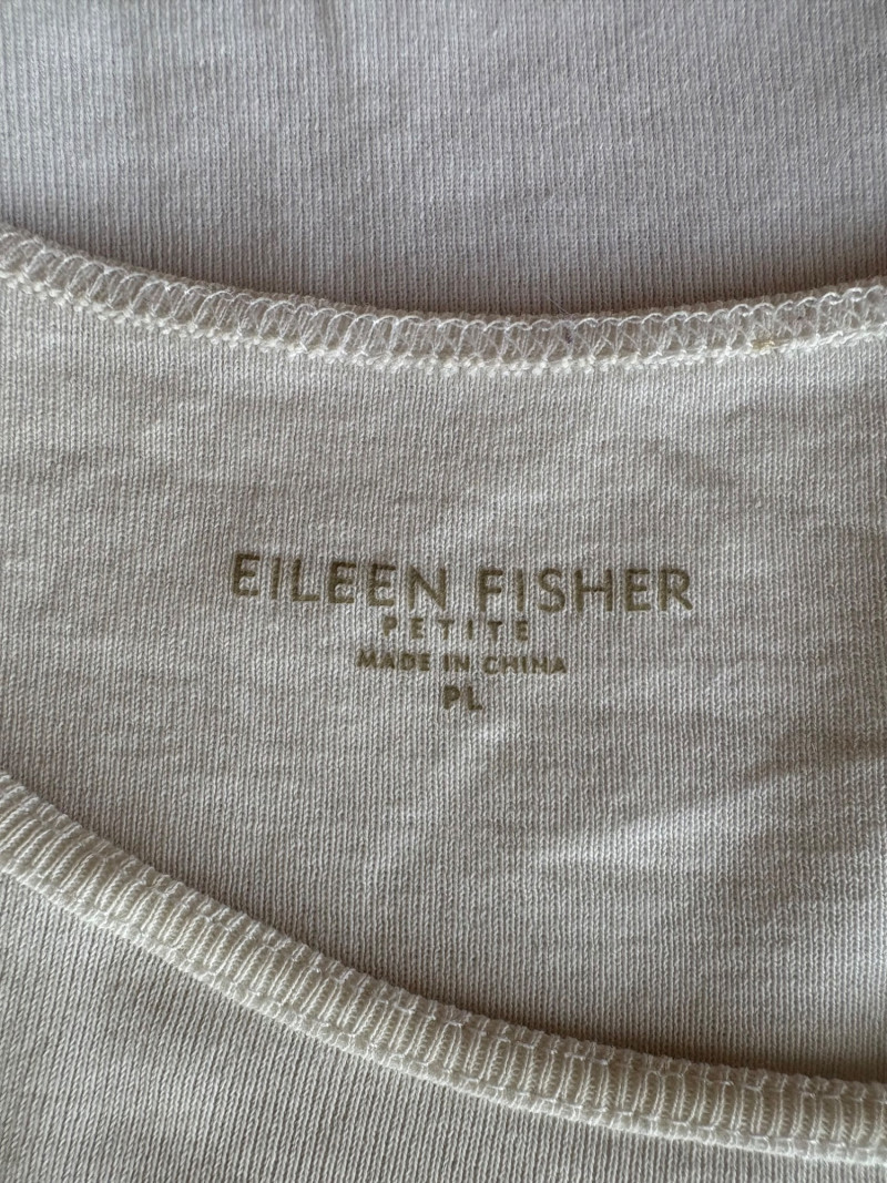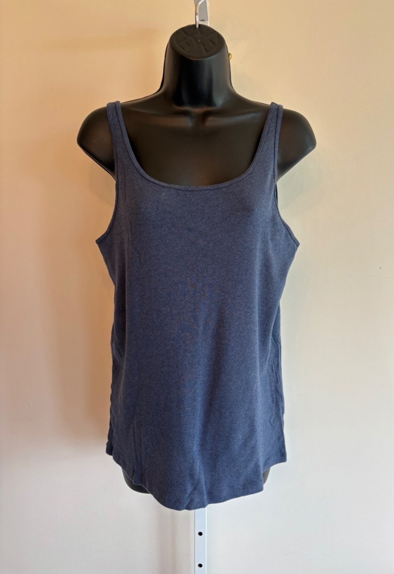 6 tanks in various fibers from Old Navy, French Dressing, & Eileen Fisher. All are in good used condition. Dark pink, puce, and light brown tanks from Old Navy measure 16" pit to pit and 26" or so in length from shoulder strap to hem. 57% cotton with 38% polyester and 5% spandex. All are size L. Light blue tank from French Dressing measures 15" pit to pit and 22" from shoulder strap to hem. 100% cotton. Size tag says XL. White tank from Eileen Fisher measures 16.5" pit to pit and 24" from shoulder strap to hem.. (While it is still in good used condition, it is the most used of the group.) 100% organic cotton. Size tag says PL. Blue Eileen Fisher tank measures 16.5" pit to pit and 26" from shoulder strap to hem. 100% cotton. Size tag says L.