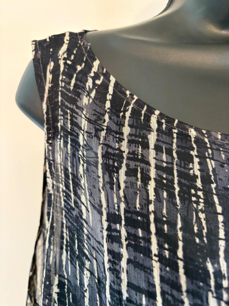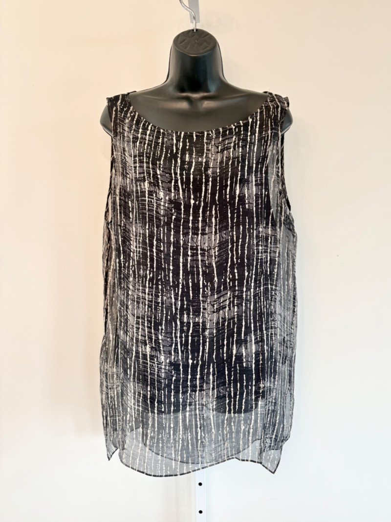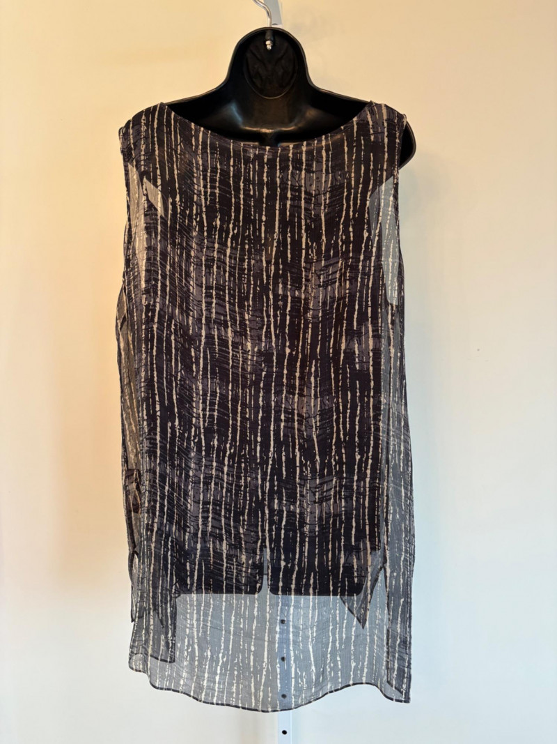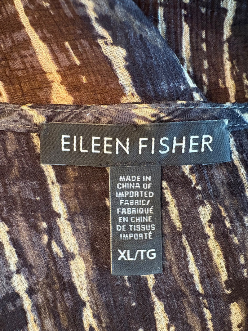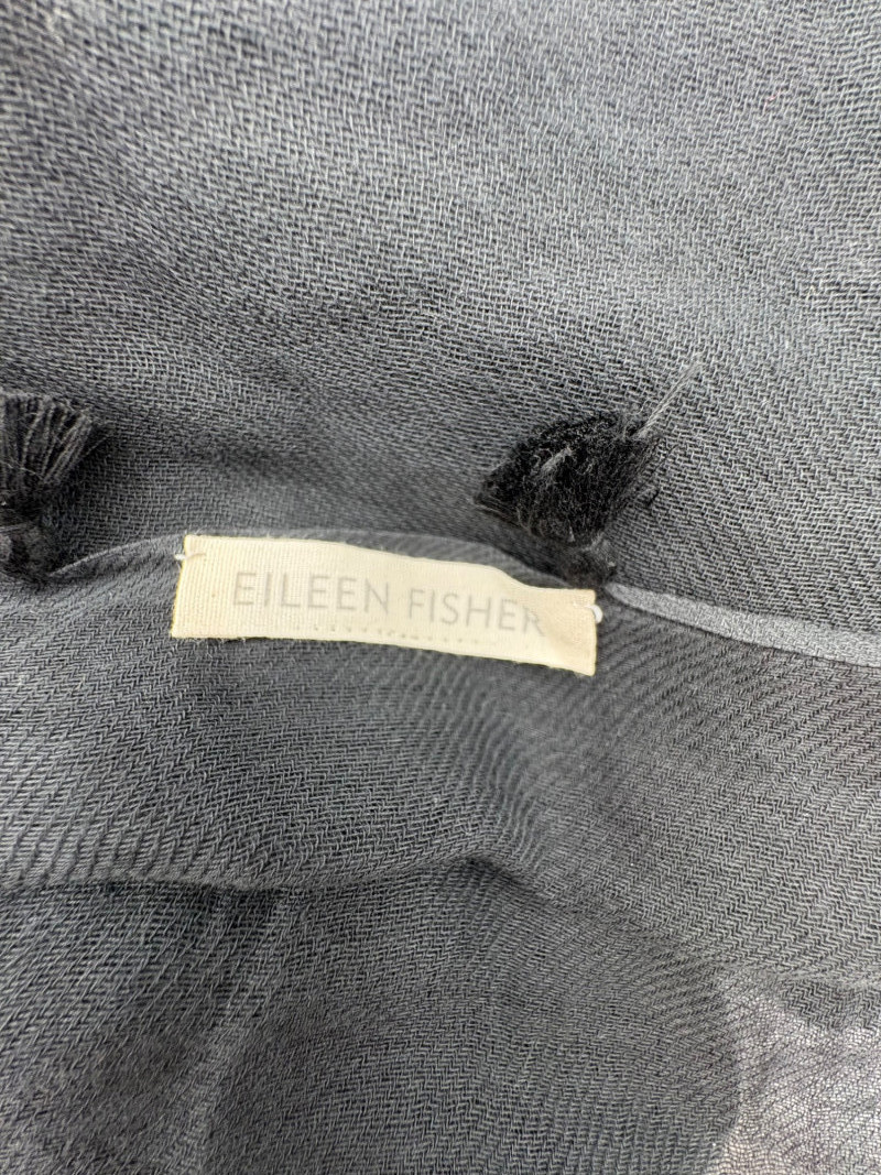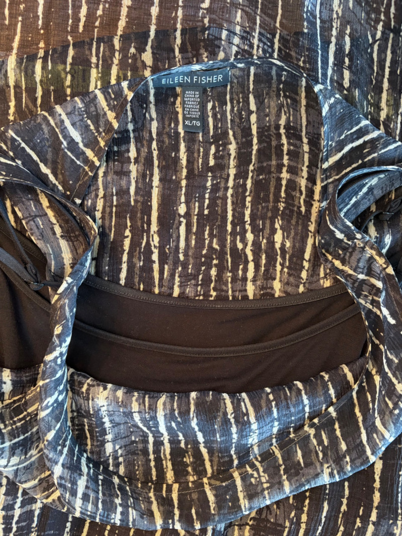 Terrific versatile trio from Eileen Fisher - the camisole could be worn alone or under the filmy print tank and the addition of a scarf can take bare shoulders into a cool summer evening. Solid black camisole in very sheer stretchy knit fabric has adjustable length straps. In excellent condition. 100% Tencel Lyocell. Measures 21.5" pit to pit. Size tag is missing (probably cut out since it is so sheer). Filmy vertical print beige & black long tank has snap fasteners at shoulders to hold cami in place without showing straps and split hem with curved back hem lower than front. In excellent condition. 100% silk. Measures 23" from pit to pit and 34" from top of shoulder strap to bottom back curve of hem. Size tag says XL. Solid black scarf has tassels on all edges. Fabric tag is missing, but very soft. Measures approx. 38" x 76".