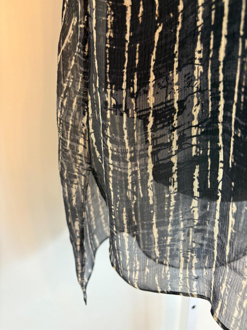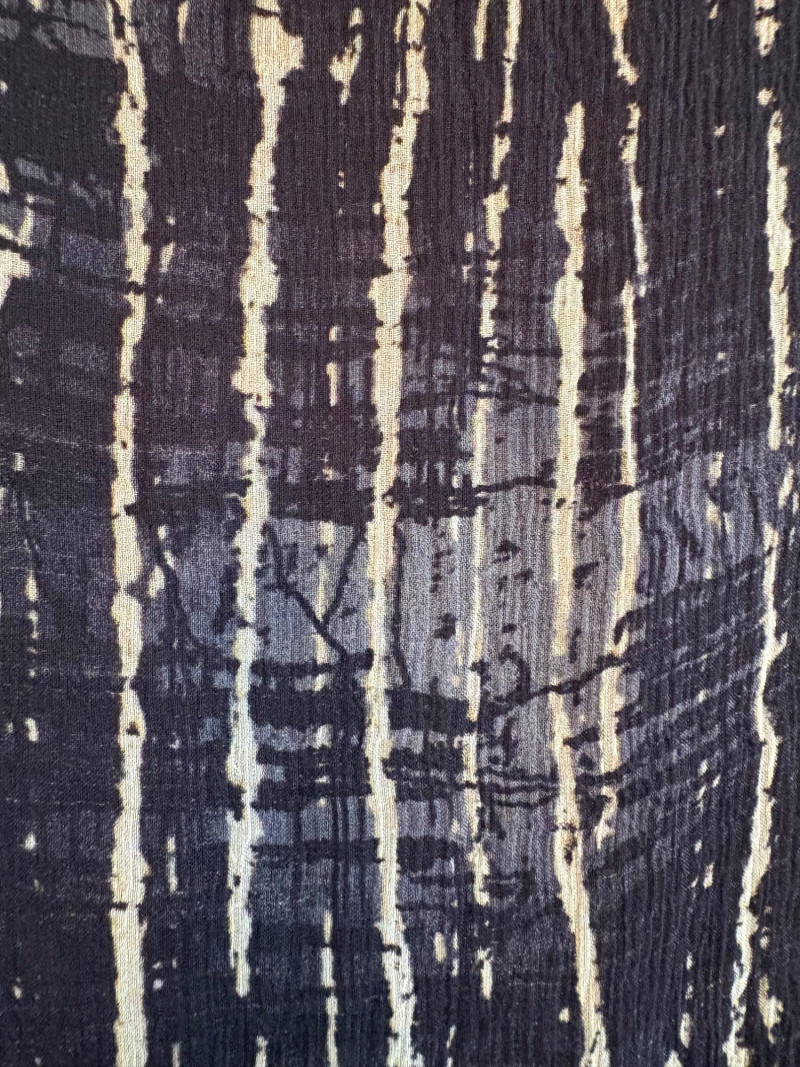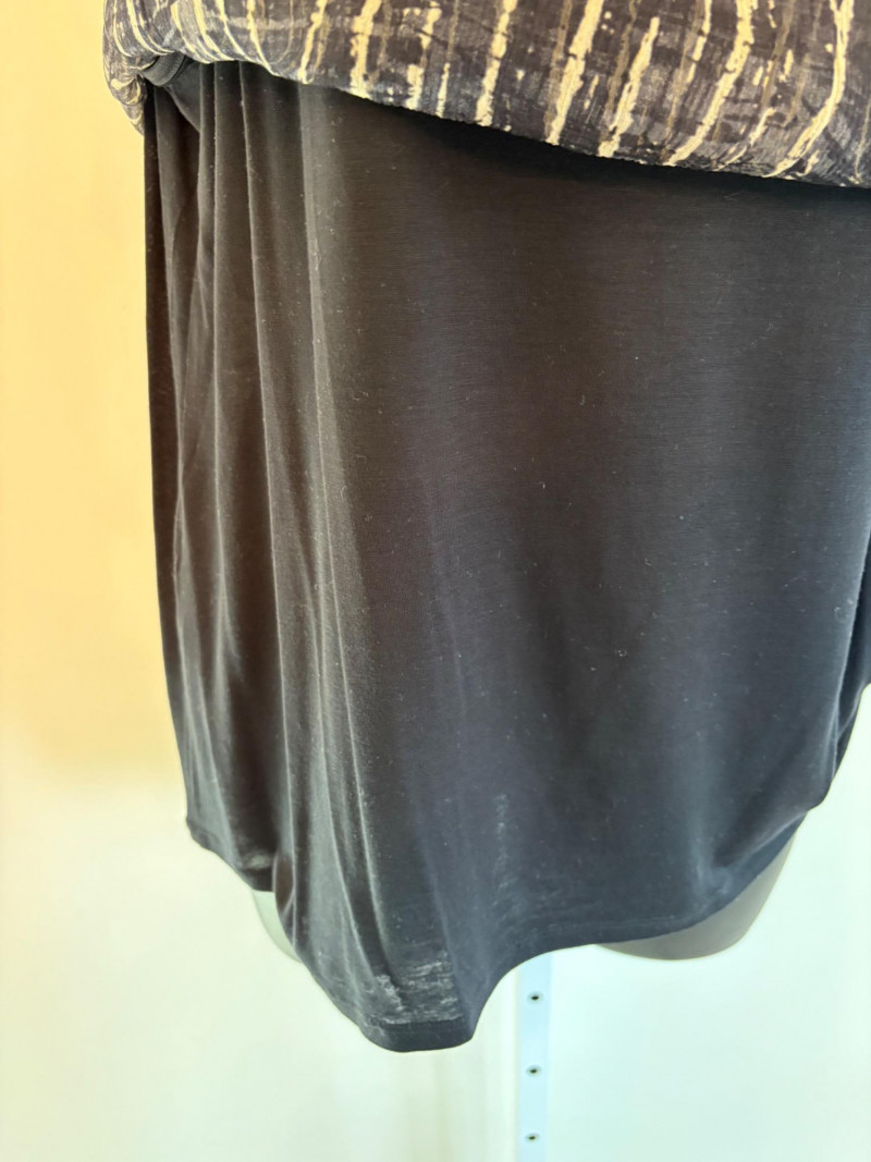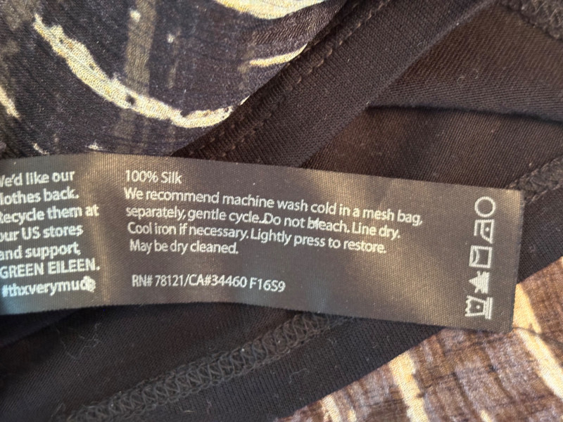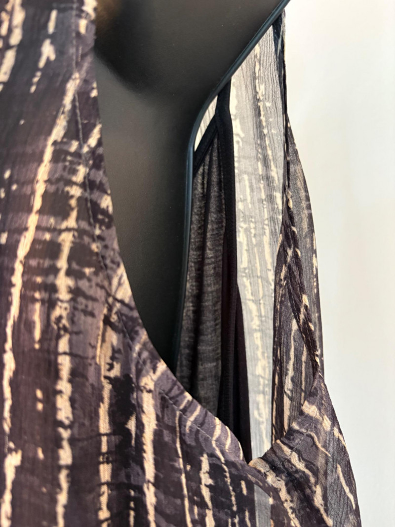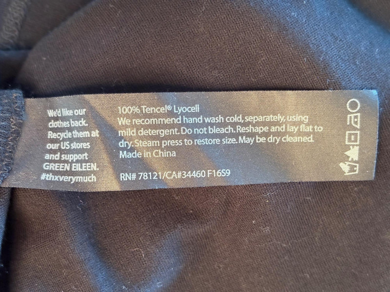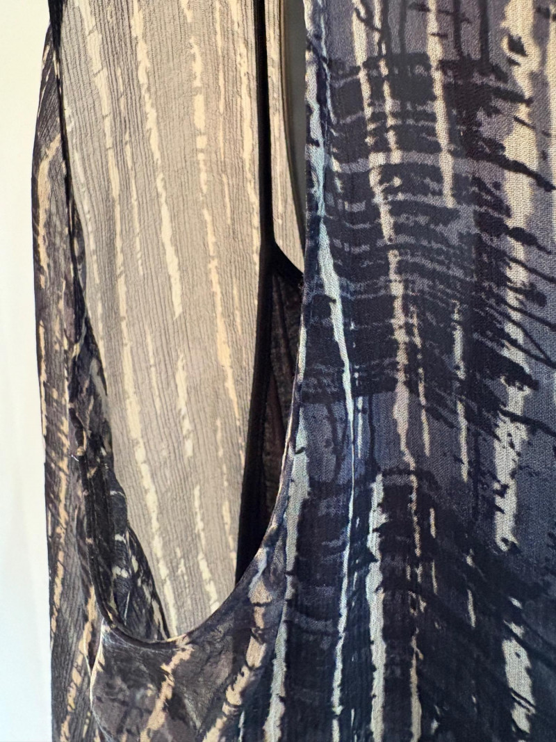 Terrific versatile trio from Eileen Fisher - the camisole could be worn alone or under the filmy print tank and the addition of a scarf can take bare shoulders into a cool summer evening. Solid black camisole in very sheer stretchy knit fabric has adjustable length straps. In excellent condition. 100% Tencel Lyocell. Measures 21.5" pit to pit. Size tag is missing (probably cut out since it is so sheer). Filmy vertical print beige & black long tank has snap fasteners at shoulders to hold cami in place without showing straps and split hem with curved back hem lower than front. In excellent condition. 100% silk. Measures 23" from pit to pit and 34" from top of shoulder strap to bottom back curve of hem. Size tag says XL. Solid black scarf has tassels on all edges. Fabric tag is missing, but very soft. Measures approx. 38" x 76".