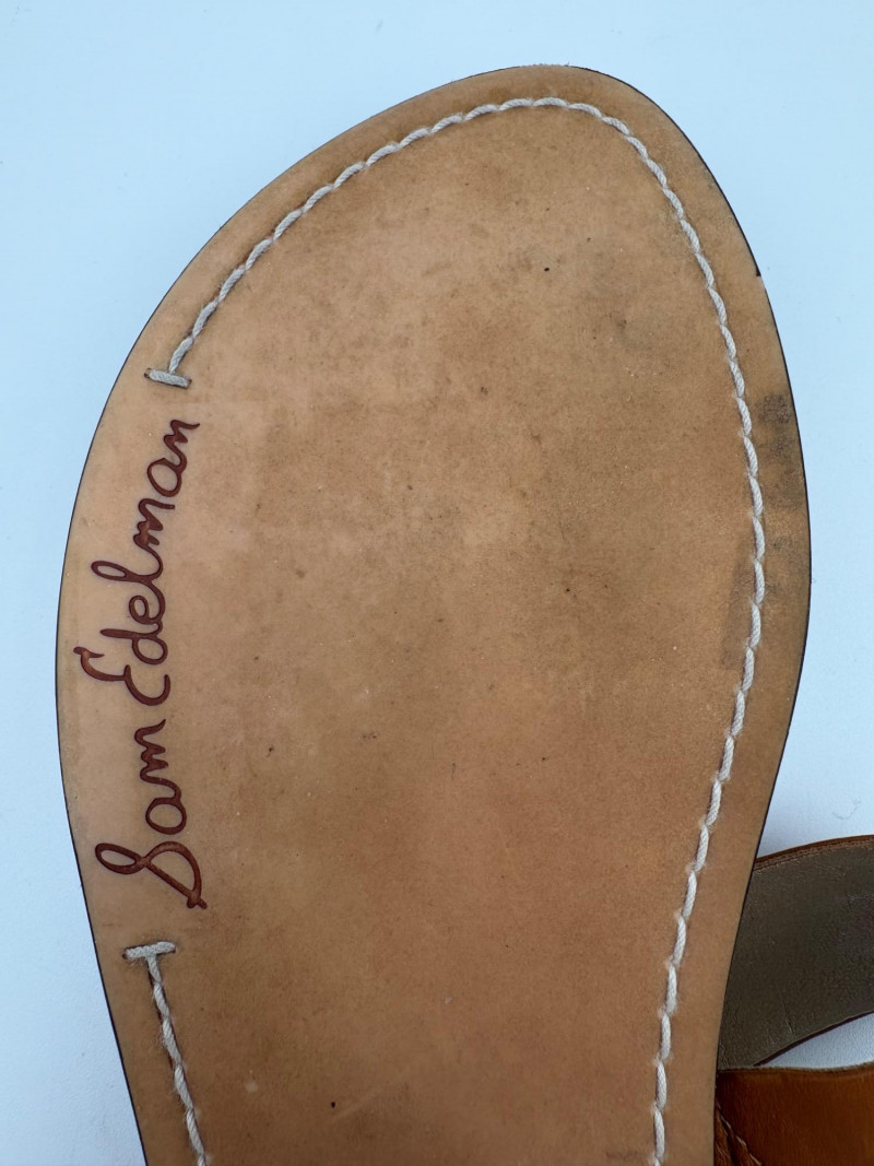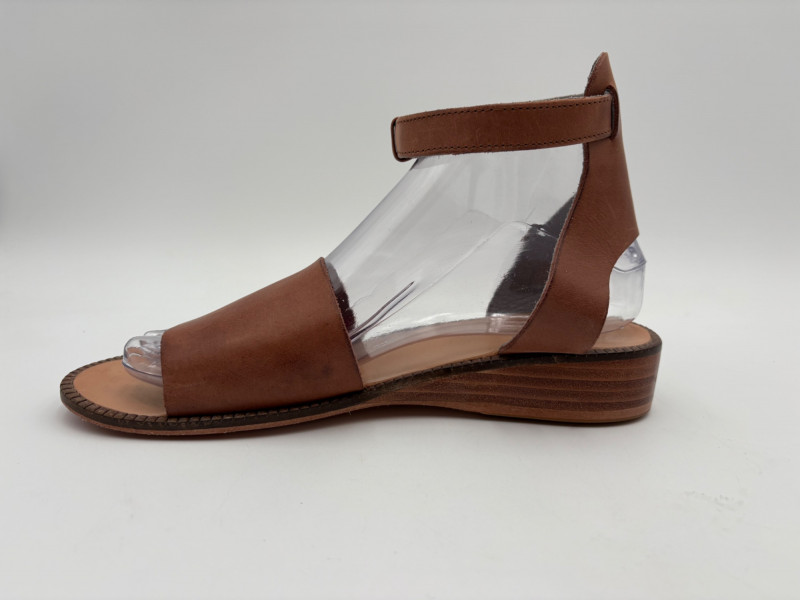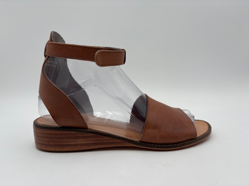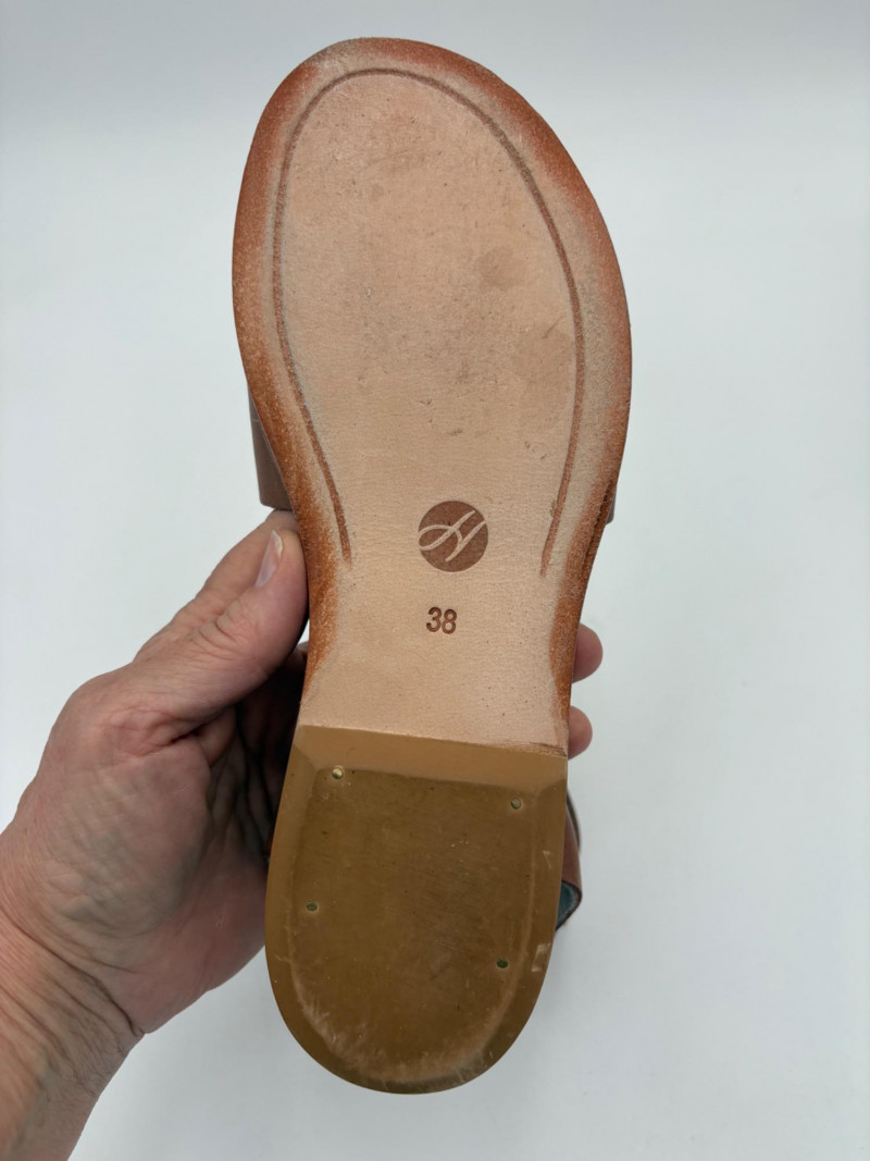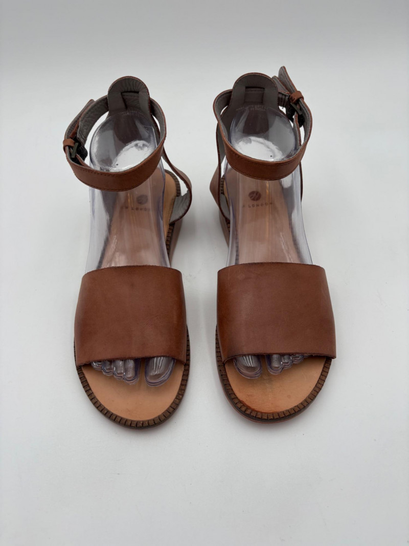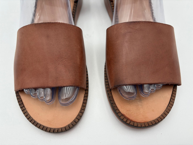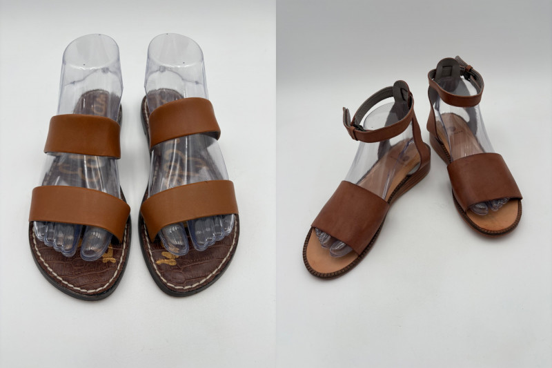 2 pairs of virtually new sandals for casual dates or comfortable evenings out. Tan smooth brown leather slides form Sam Edelman are incredibly simple with just 2 straps (instep has a hidden elastic gusset for comfort). Natural leather soles show little to no soiling and uppers show no wear. Size 7. Mid-tone brown wedge sandals from H. London have a 1.25" stacked heel and natural leather soles. Wide strap at ball of the foot and interesting ankle strap; inside narrow strap works on the buckle while the outer wider strap covers the buckle area making the closed sandal look more sleek. Appear almost new except for alight scuffing along heel perimeter on sole - probably from trying on. Size 38. (roughly a US 7 to 7.5)