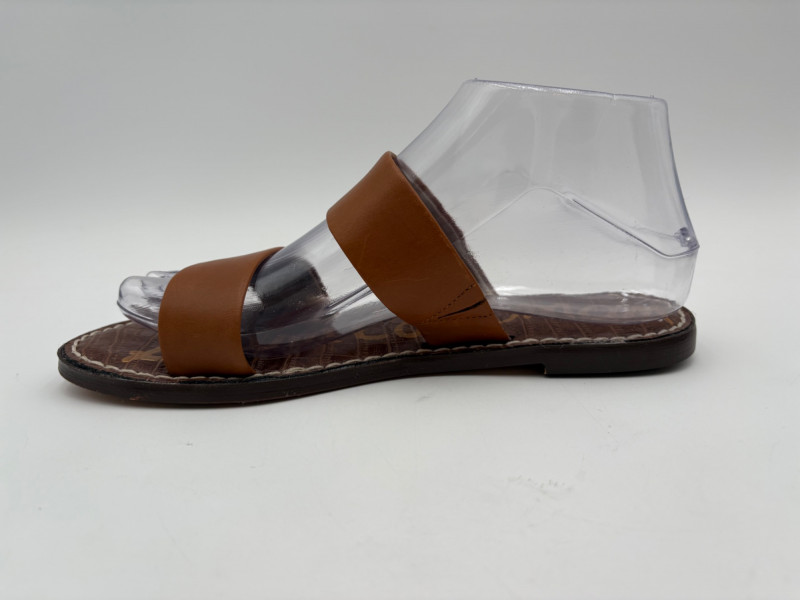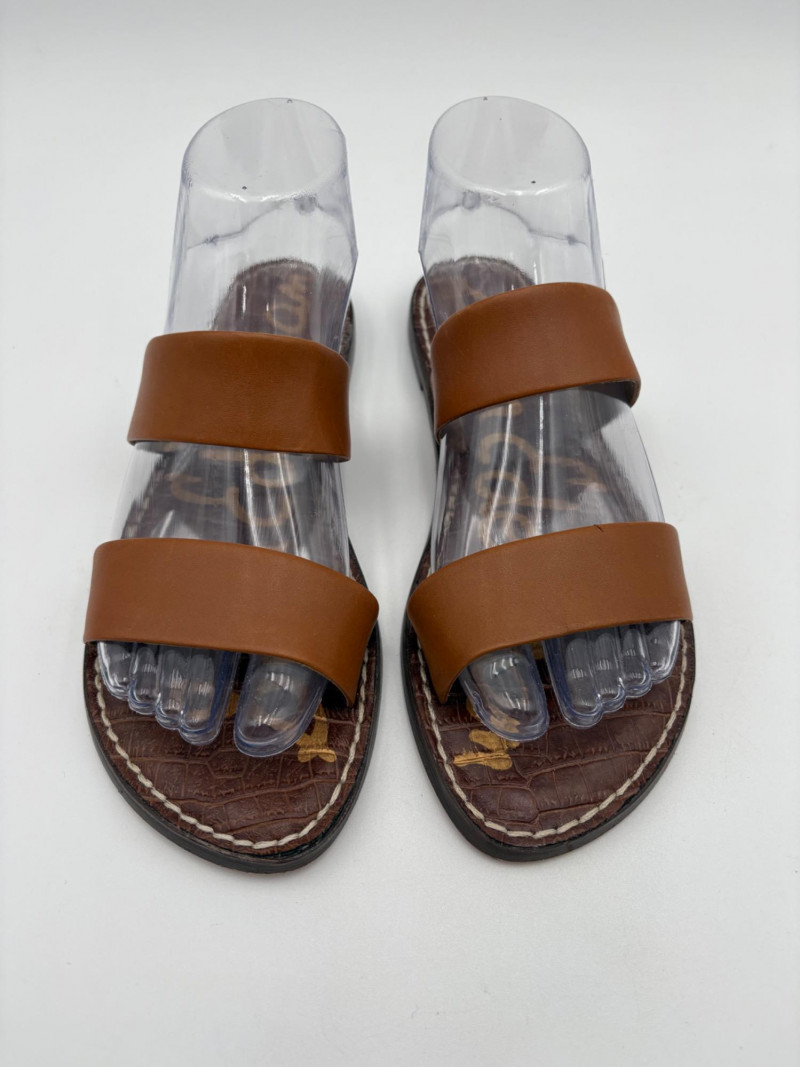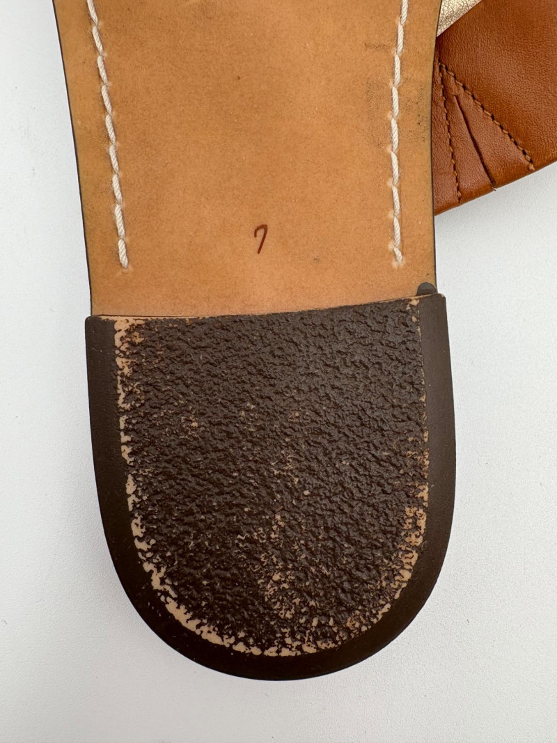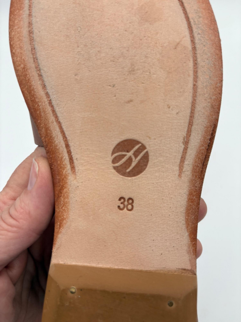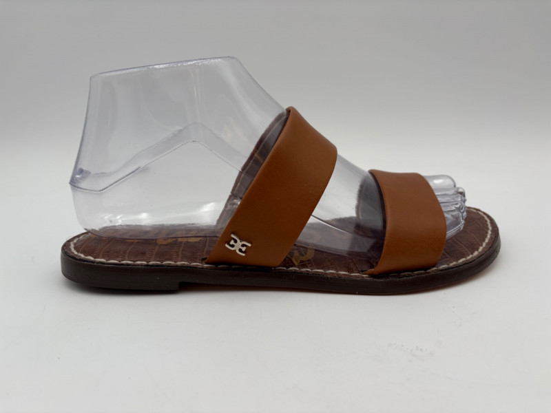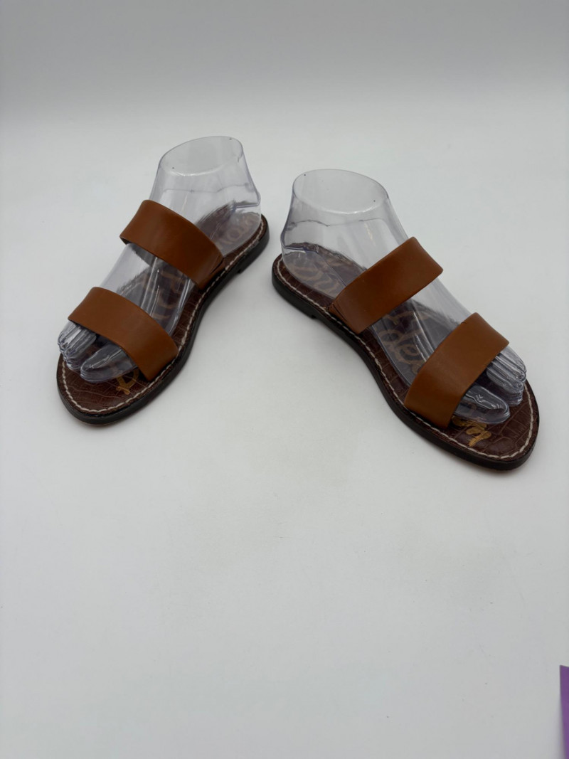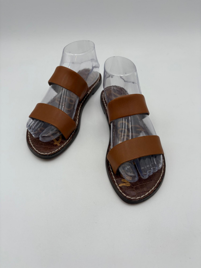 2 pairs of virtually new sandals for casual dates or comfortable evenings out. Tan smooth brown leather slides form Sam Edelman are incredibly simple with just 2 straps (instep has a hidden elastic gusset for comfort). Natural leather soles show little to no soiling and uppers show no wear. Size 7. Mid-tone brown wedge sandals from H. London have a 1.25" stacked heel and natural leather soles. Wide strap at ball of the foot and interesting ankle strap; inside narrow strap works on the buckle while the outer wider strap covers the buckle area making the closed sandal look more sleek. Appear almost new except for alight scuffing along heel perimeter on sole - probably from trying on. Size 38. (roughly a US 7 to 7.5)