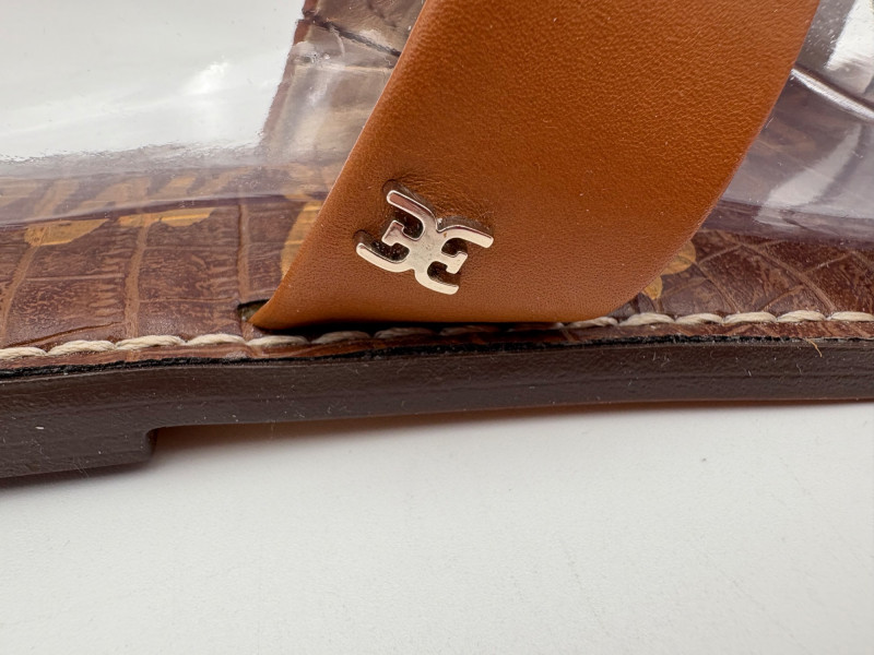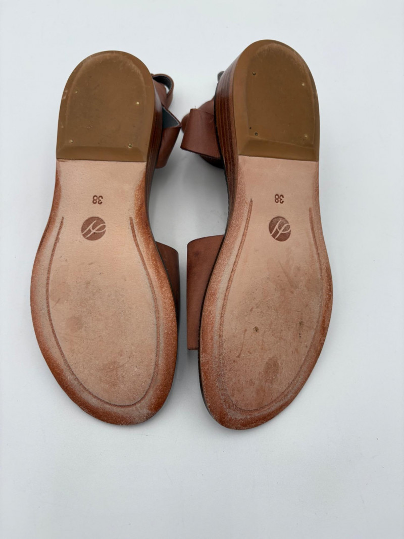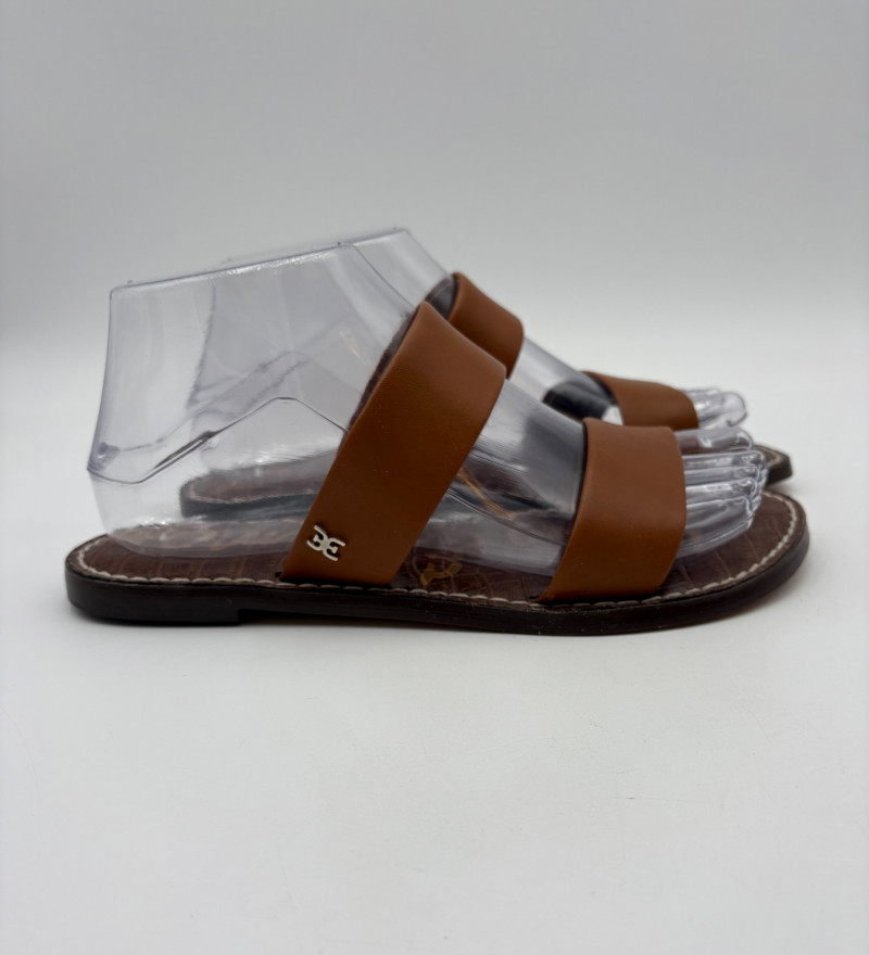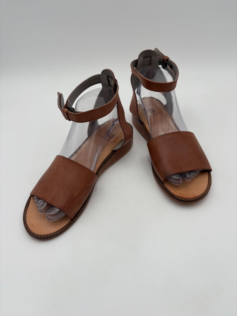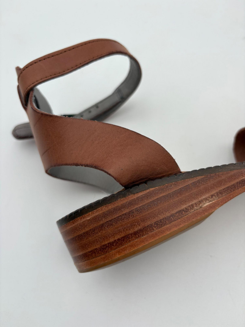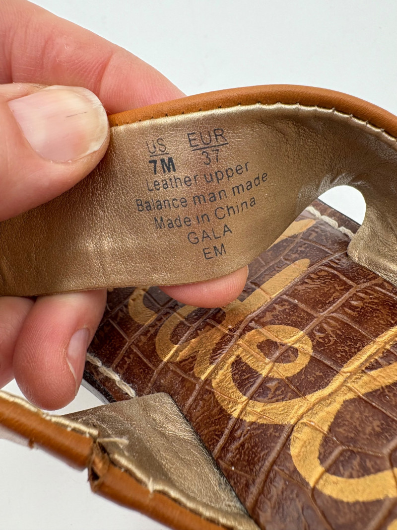 2 pairs of virtually new sandals for casual dates or comfortable evenings out. Tan smooth brown leather slides form Sam Edelman are incredibly simple with just 2 straps (instep has a hidden elastic gusset for comfort). Natural leather soles show little to no soiling and uppers show no wear. Size 7. Mid-tone brown wedge sandals from H. London have a 1.25" stacked heel and natural leather soles. Wide strap at ball of the foot and interesting ankle strap; inside narrow strap works on the buckle while the outer wider strap covers the buckle area making the closed sandal look more sleek. Appear almost new except for alight scuffing along heel perimeter on sole - probably from trying on. Size 38. (roughly a US 7 to 7.5)