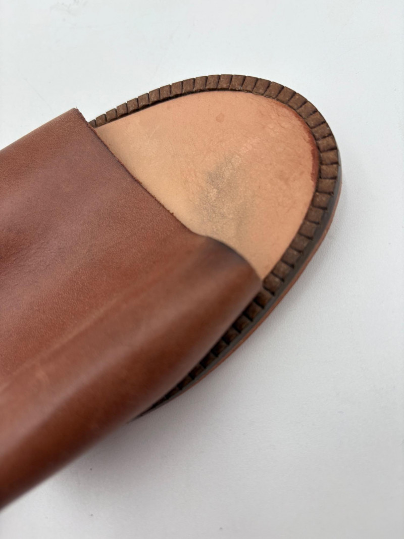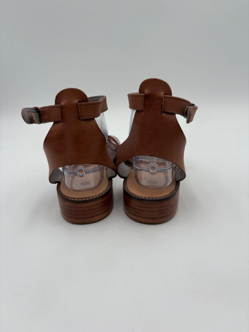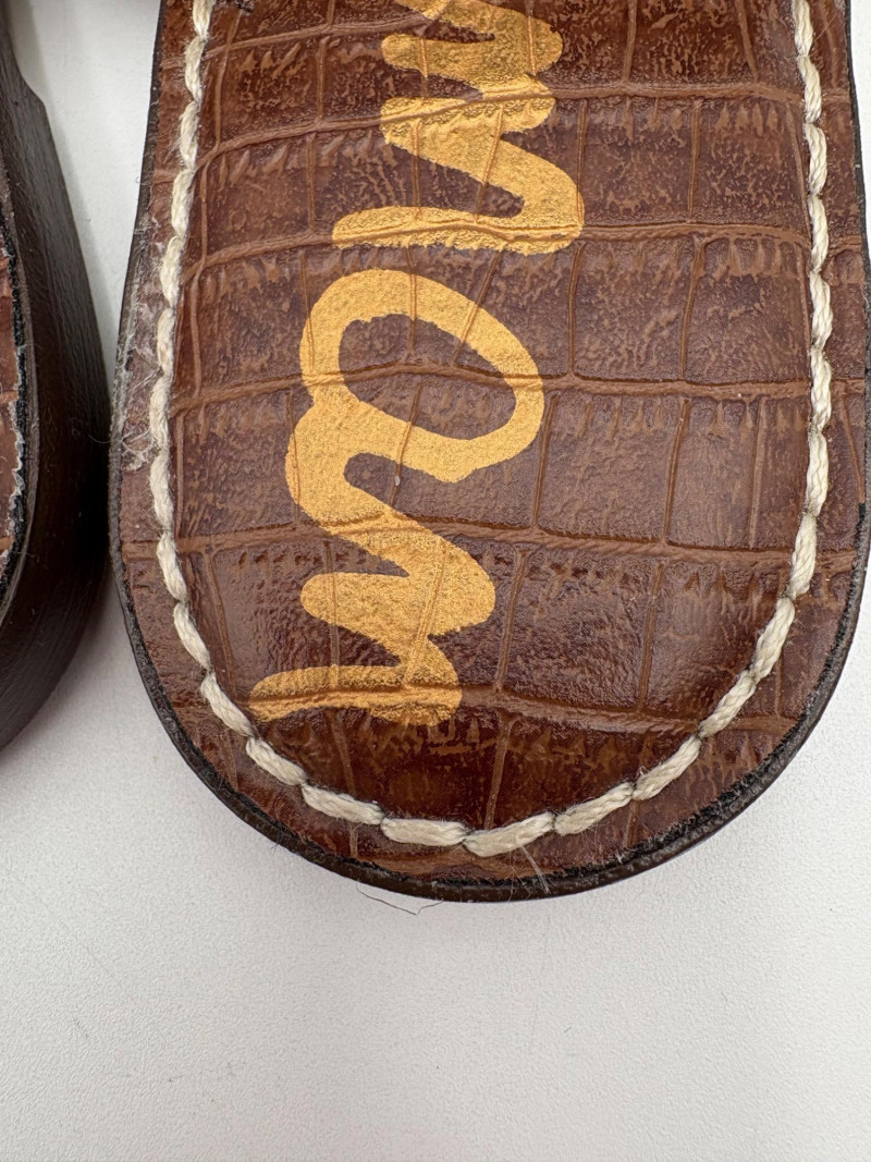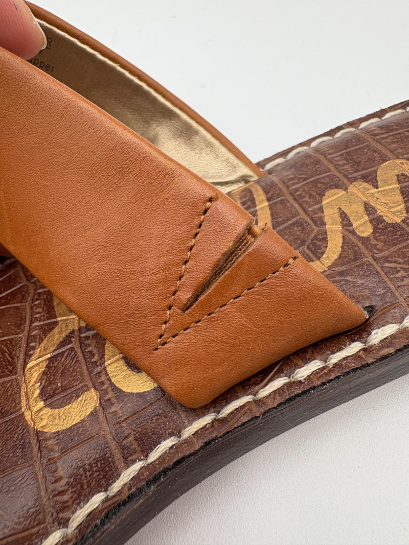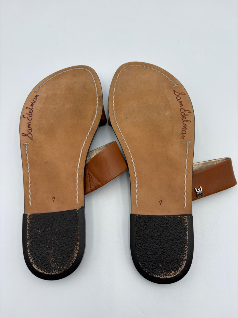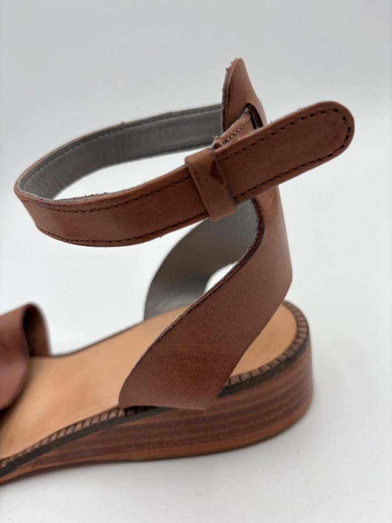 2 pairs of virtually new sandals for casual dates or comfortable evenings out. Tan smooth brown leather slides form Sam Edelman are incredibly simple with just 2 straps (instep has a hidden elastic gusset for comfort). Natural leather soles show little to no soiling and uppers show no wear. Size 7. Mid-tone brown wedge sandals from H. London have a 1.25" stacked heel and natural leather soles. Wide strap at ball of the foot and interesting ankle strap; inside narrow strap works on the buckle while the outer wider strap covers the buckle area making the closed sandal look more sleek. Appear almost new except for alight scuffing along heel perimeter on sole - probably from trying on. Size 38. (roughly a US 7 to 7.5)
