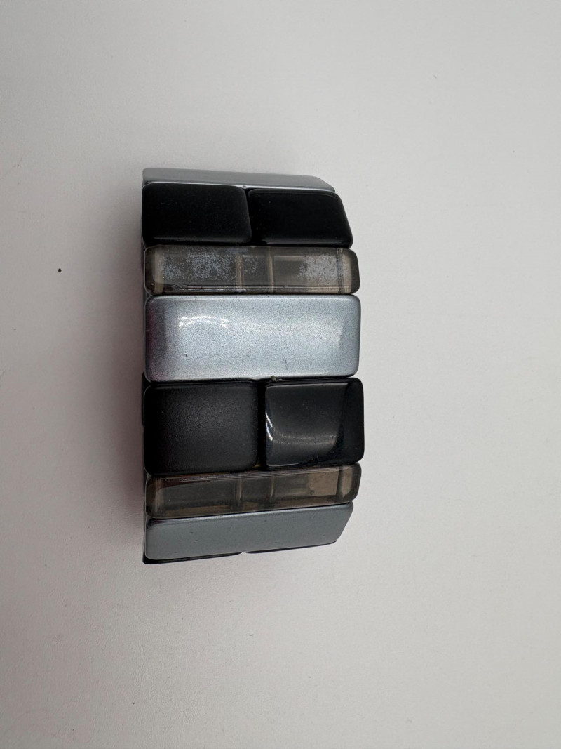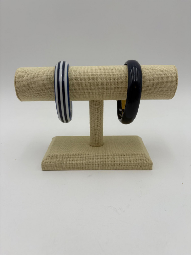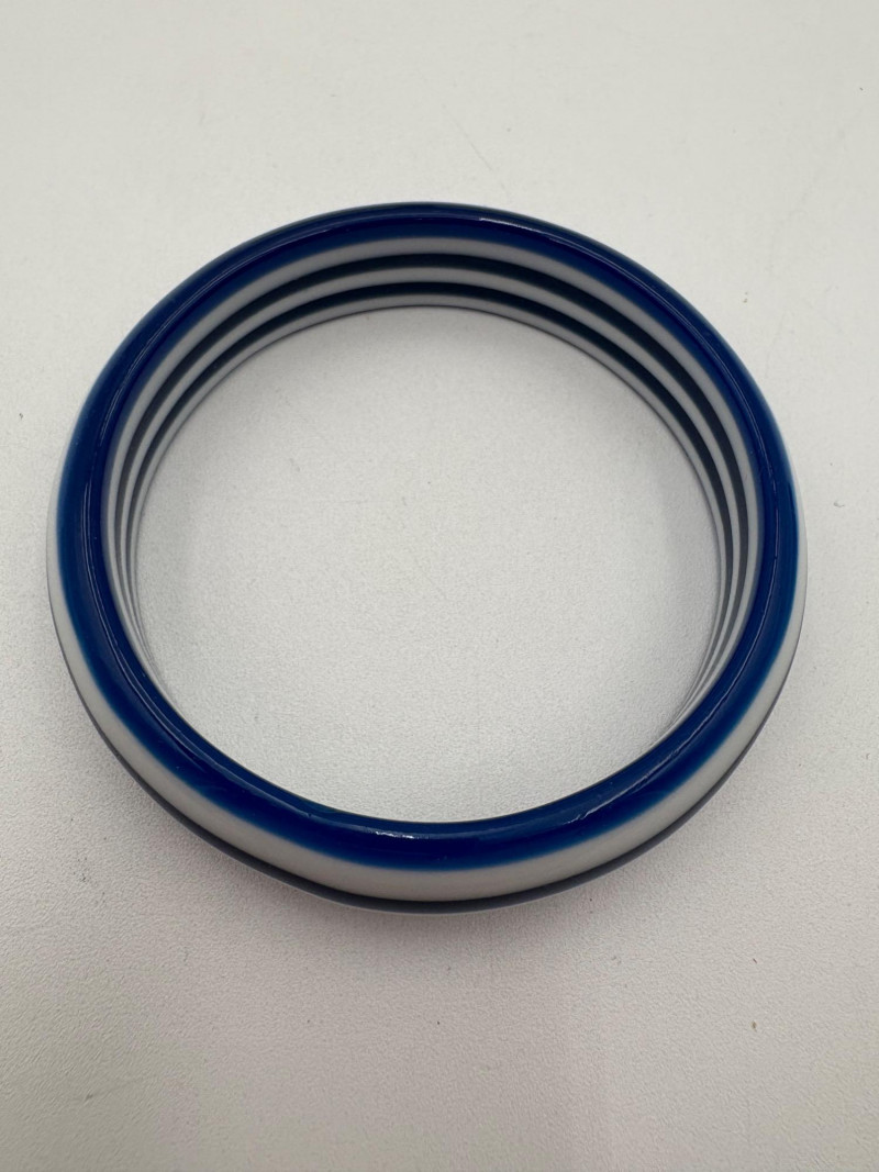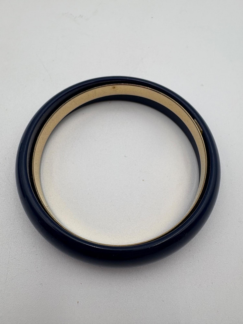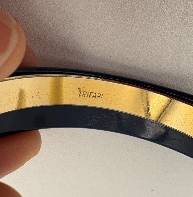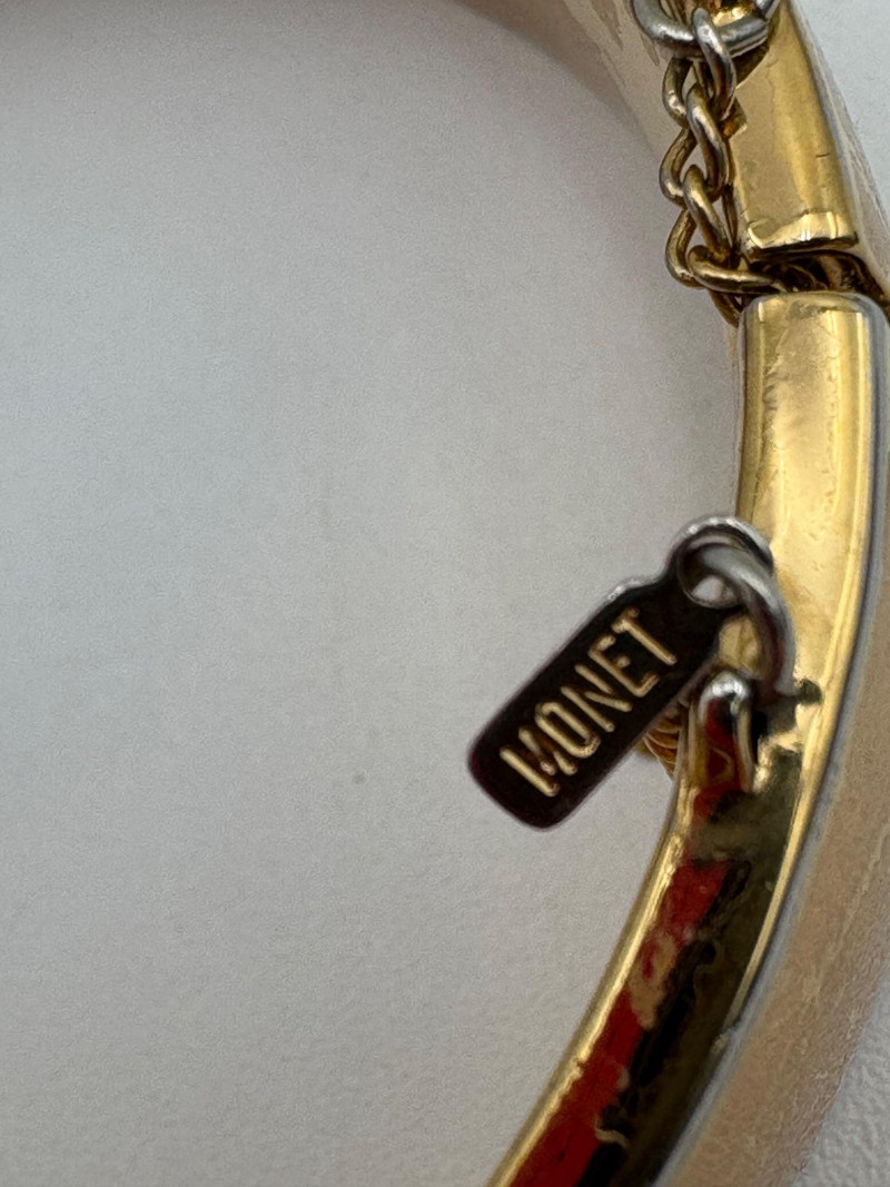 Bracelet lot consisting of: 4 silver tone plain bangles 1 interconnected silver tone bracelet with perforations 1 black plastic faceted bracelet 1 blue & white striped plastic bracelet 1 blue and gold plastic bracelet from Trifari (note the interior gold ring appears to have slipped out of alignment a bit) 1 elasticated amber tone iridescent stretch bracelet 1 black, silver, and grey stretch bracelet 1 gold hinged bracelet with safety from Monet 1 gold hinged bracelet with green stone on front