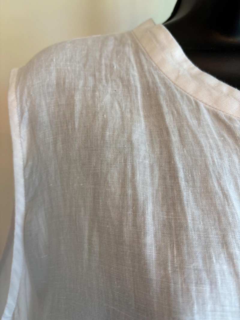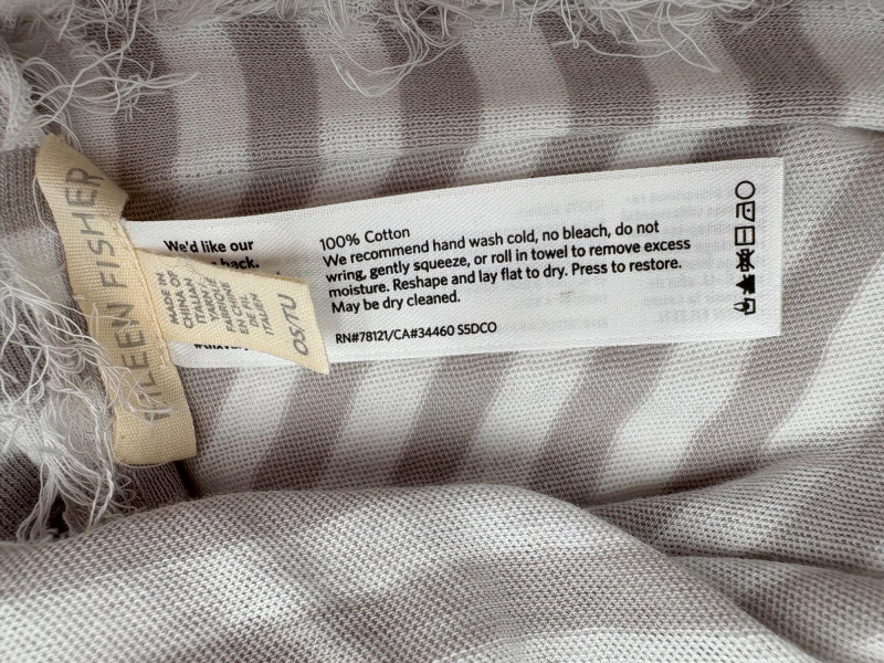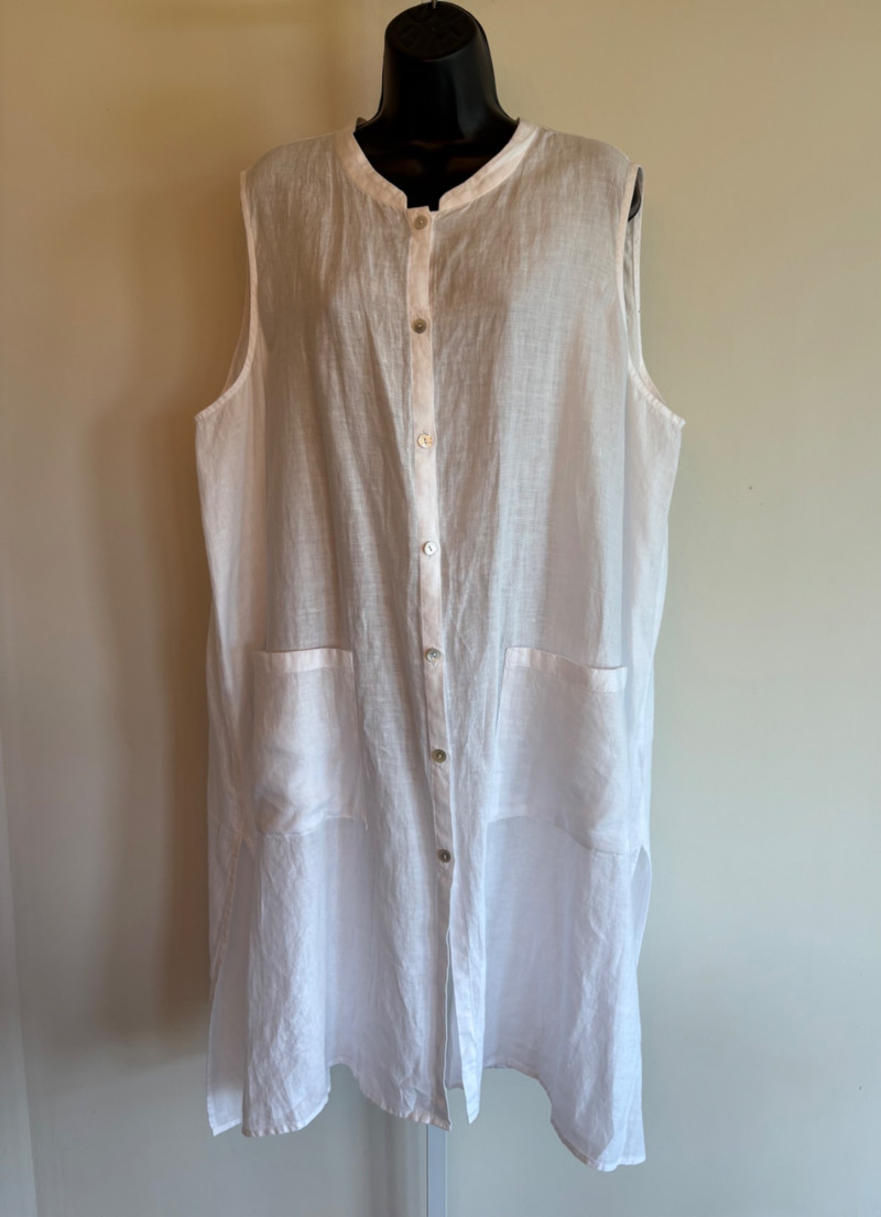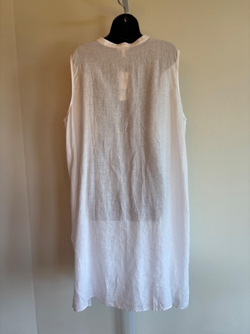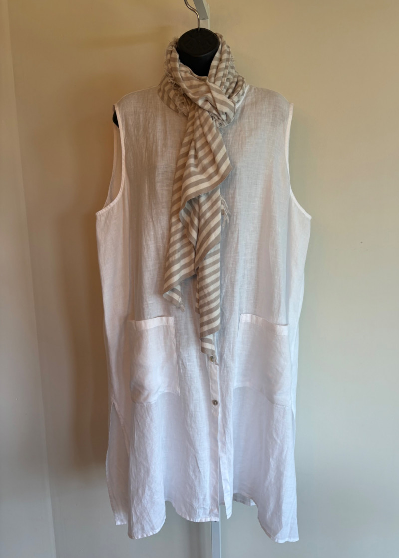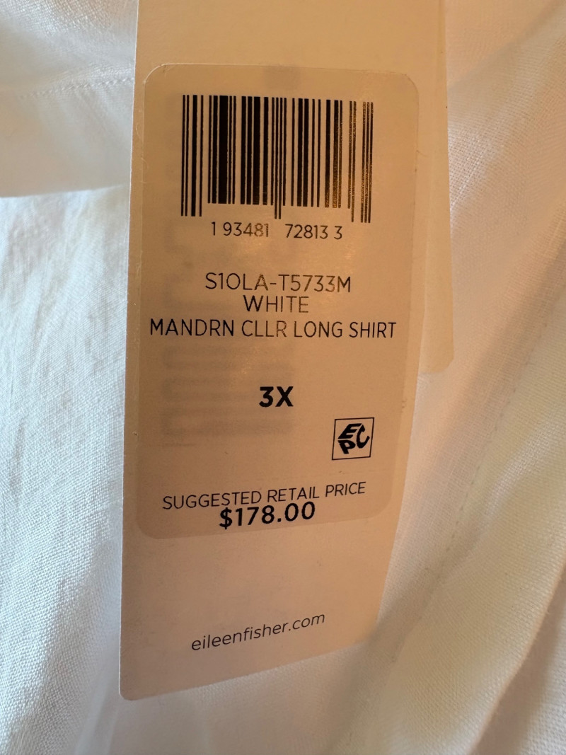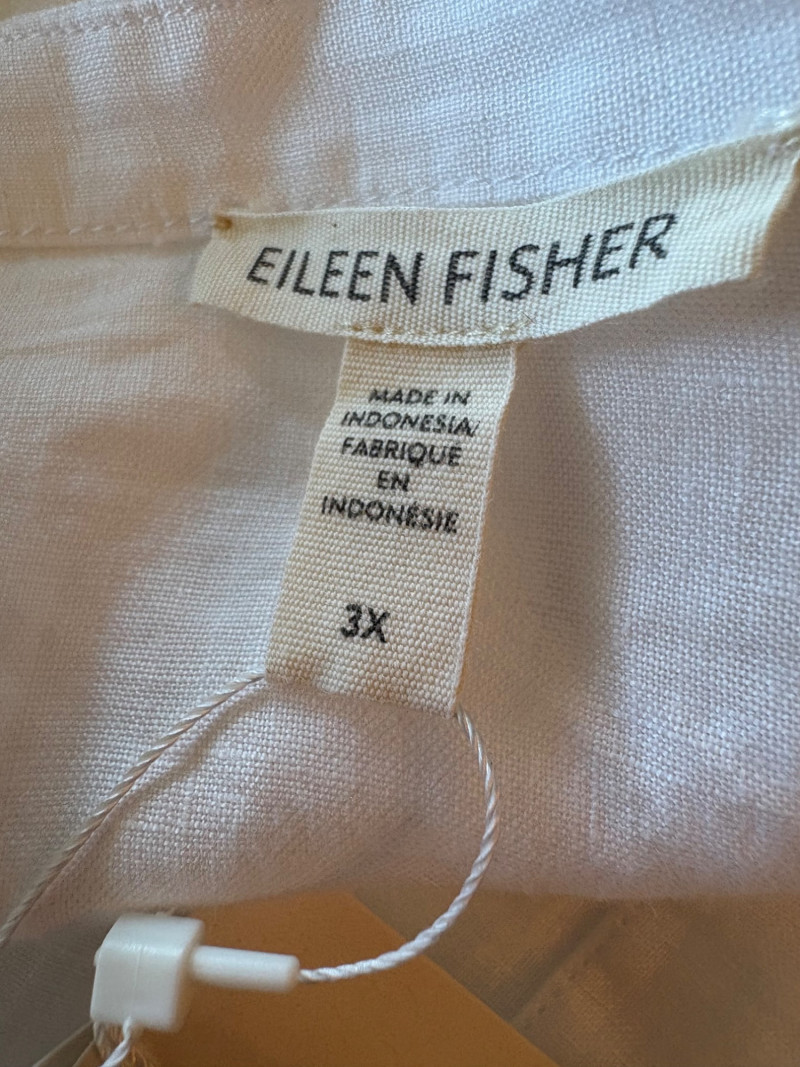 Two great pieces from Eileen Fisher- pure white sleeveless button front tunic with matching white and grey long rectangular scarf for hiding shoulders from the sun or keeping them warm in the evening. Front patch pockets, banded collar, and deep split hem. New with tag. 100% organic linen. Measures 26' pit to pit and 40" from back neckline to bottom hem. Size tag says 3X. White and grey 100% cotton knit scarf has fringe on the short ends. Measures approx. 20" x 70".