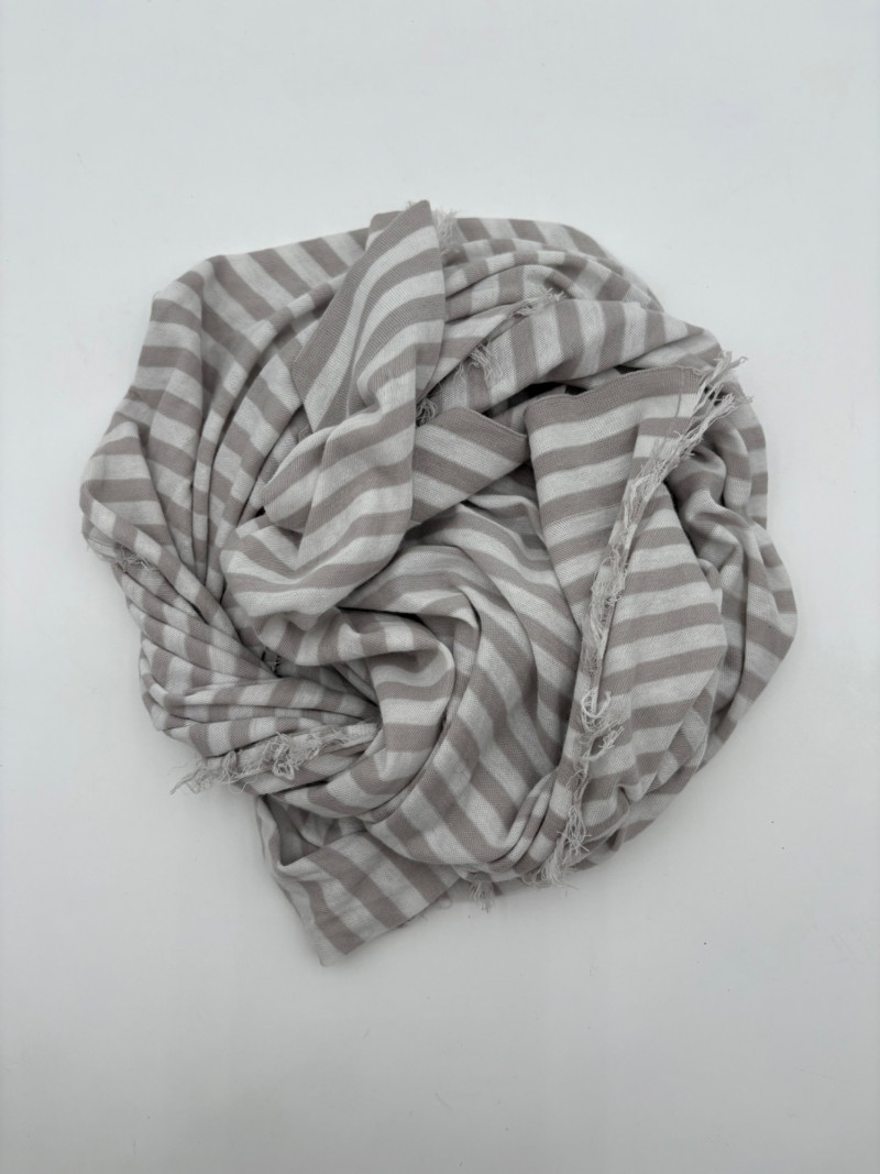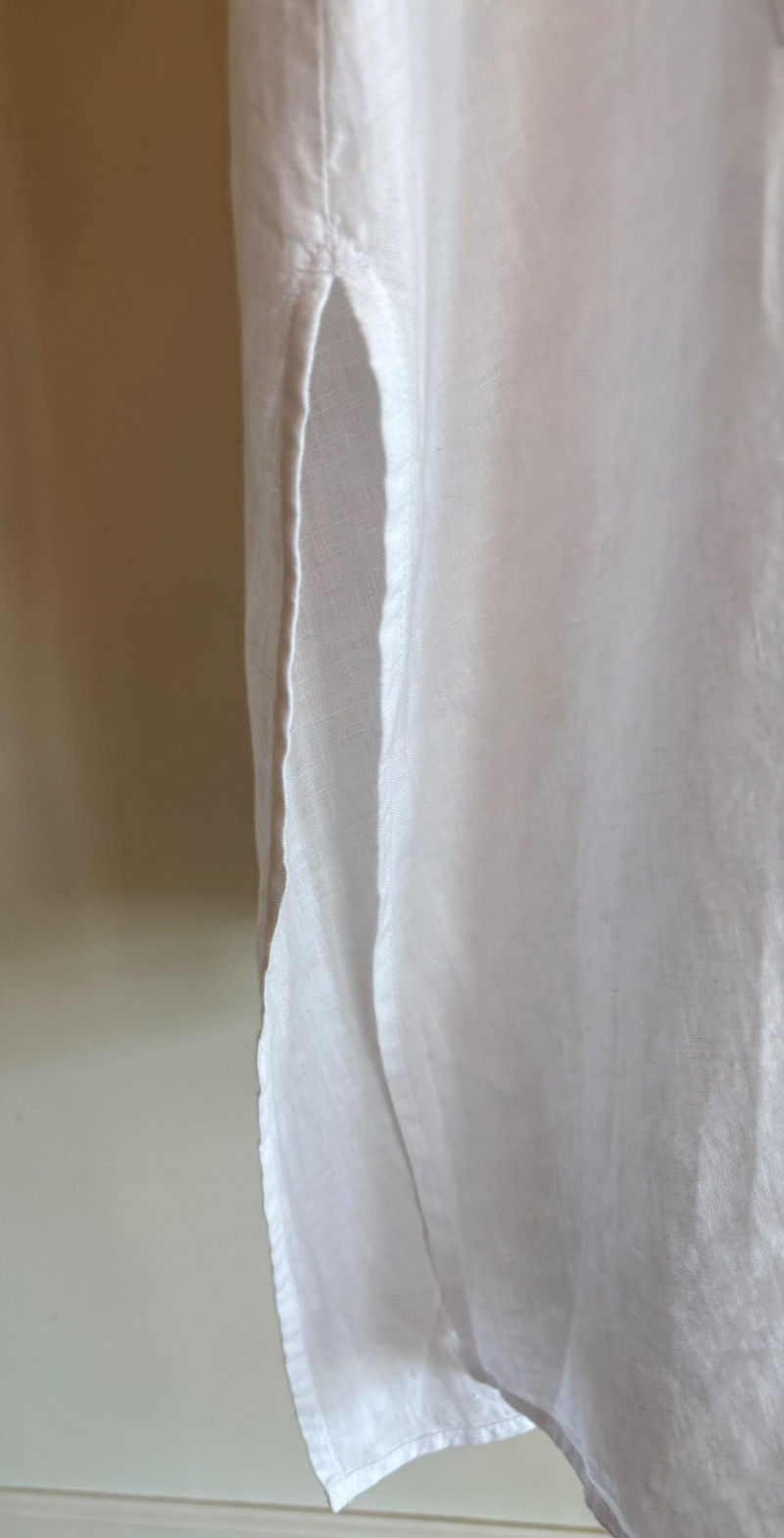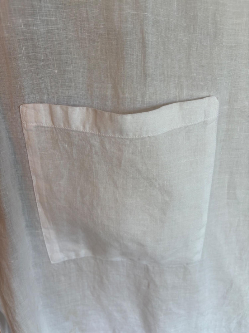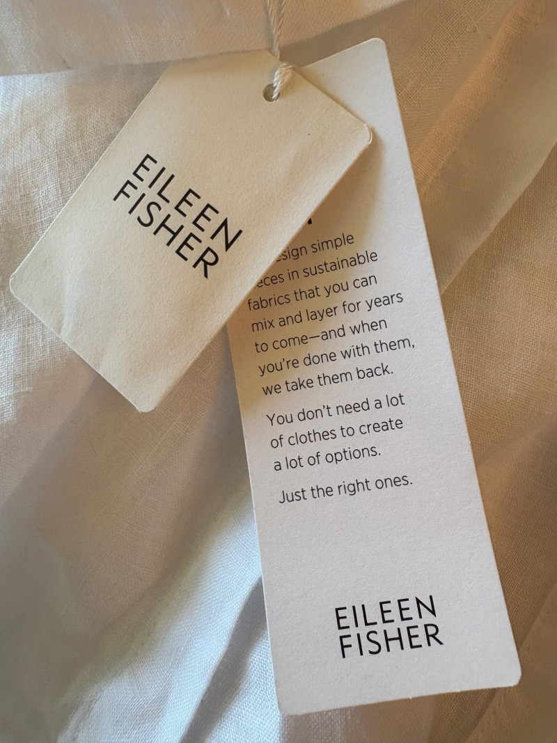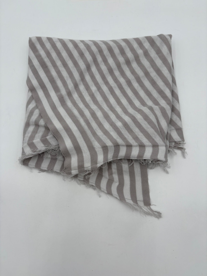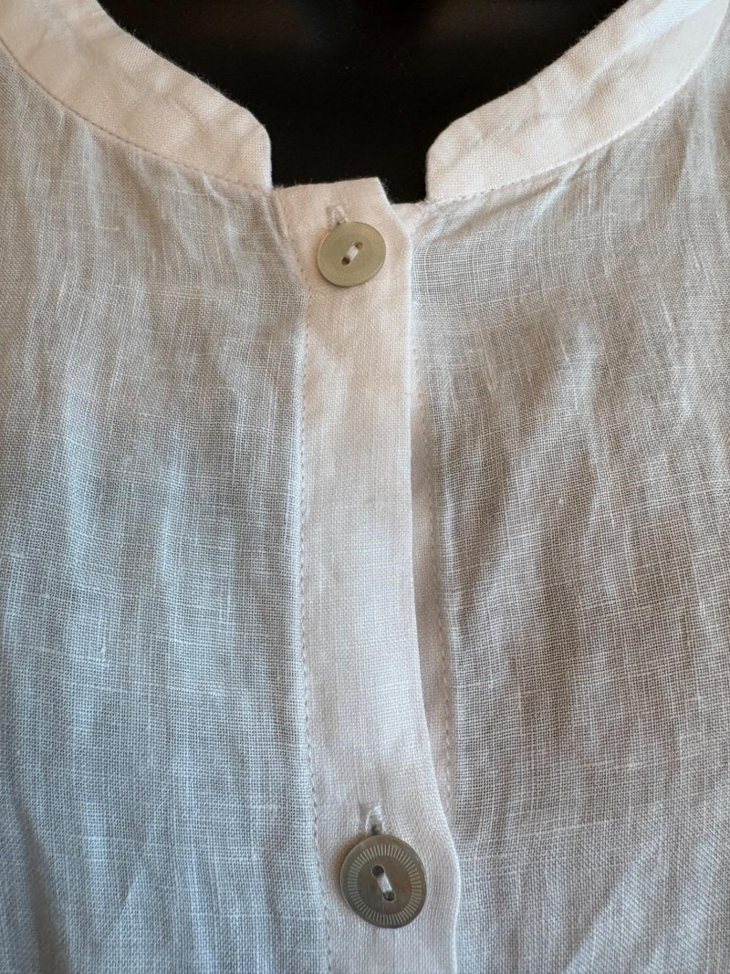 Two great pieces from Eileen Fisher- pure white sleeveless button front tunic with matching white and grey long rectangular scarf for hiding shoulders from the sun or keeping them warm in the evening. Front patch pockets, banded collar, and deep split hem. New with tag. 100% organic linen. Measures 26' pit to pit and 40" from back neckline to bottom hem. Size tag says 3X. White and grey 100% cotton knit scarf has fringe on the short ends. Measures approx. 20" x 70".