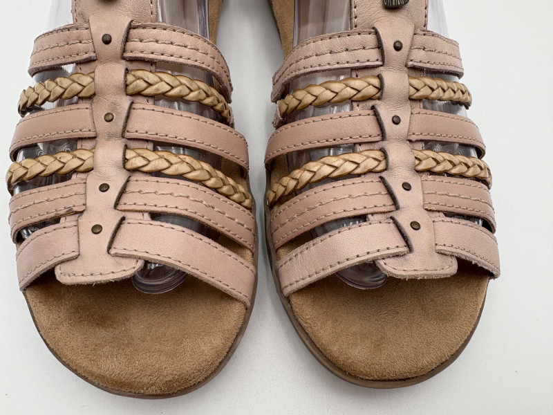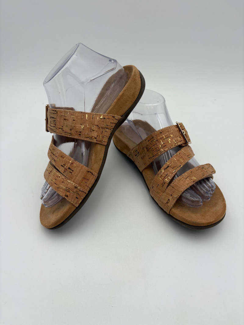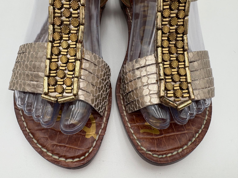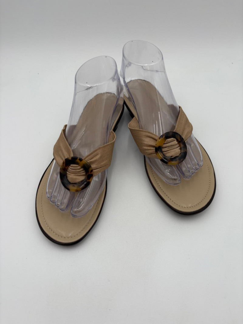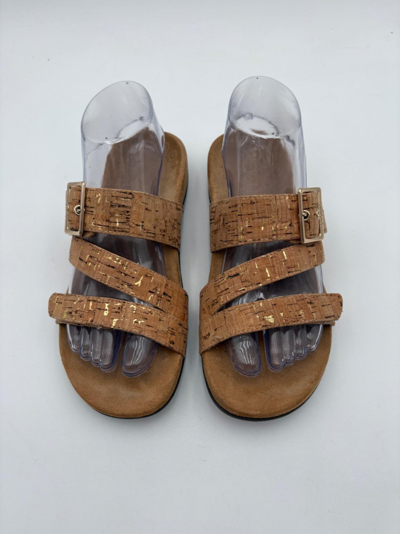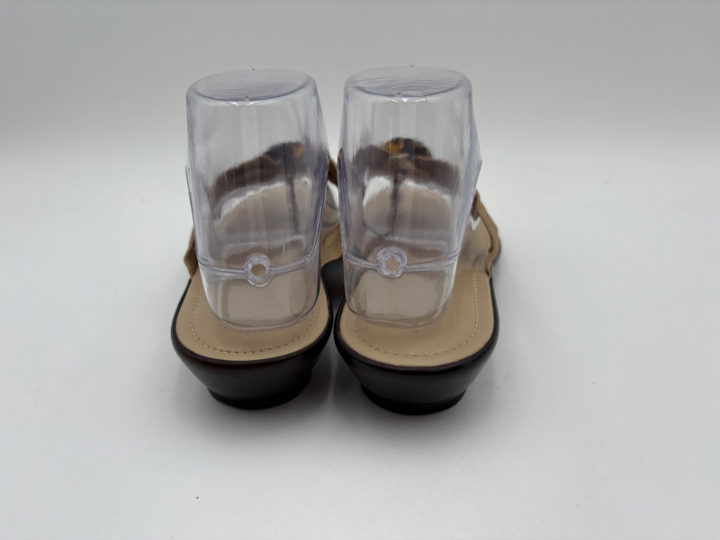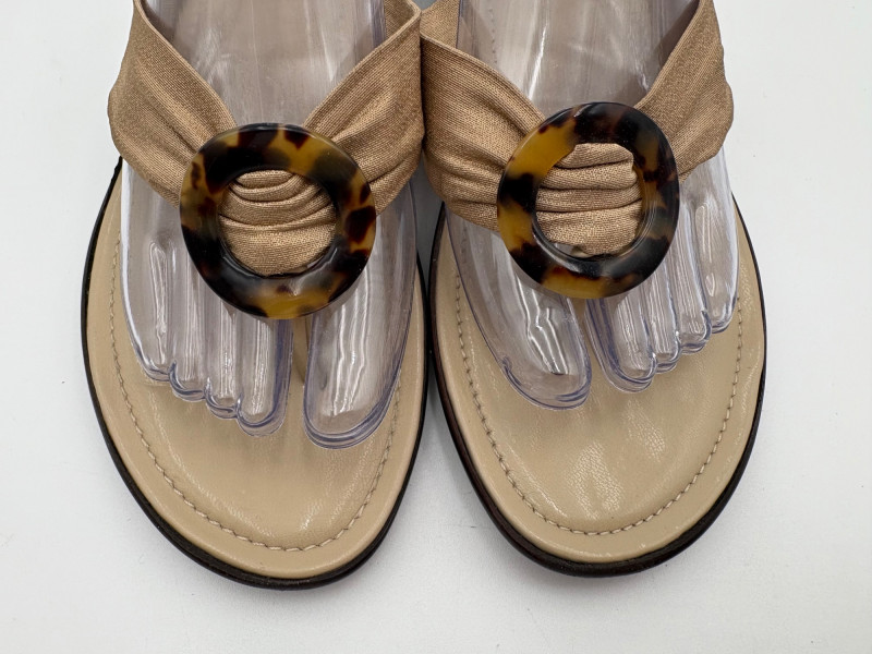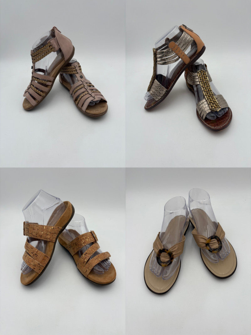 Four pairs of neutral-toned sandals - all have been worn enough to break them in, but definitely have a a lot more life left in them. Vionic cork strap sandals have a molded footbed and adjustable straps across the top of the foot - the 2 lower ones close with Velcro and the top one with a buckle. In good used condition. Size 7. Gold "alligator leather" sandals from Sam Edelman have decorative metal beading and neutral leather trim on straps. Zip heel closure with natural leather sole and low stacked heel. In very good condition - very little wear on the uppers or soles. Size 7. Beige braided strap sandals from Earth Origins have alternating braided leather and top stitched leather straps. zip heel closure, and heavily padded insole.. In very good used condition. Size 7 Flip flop style sandals from Italian Shoemakers with elasticated upper band & tortoiseshell ring above toes. Low 1.25" heel. In excellent condition. Size 8 (we think it fits closer to a 7.5),