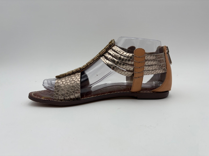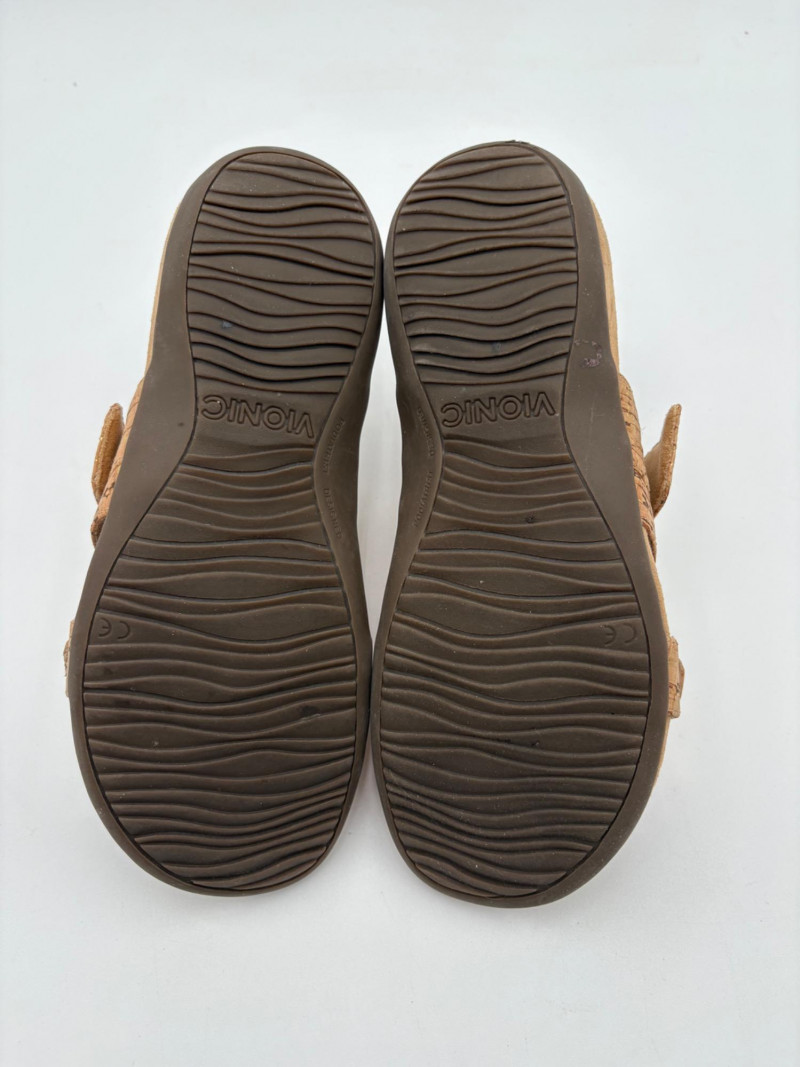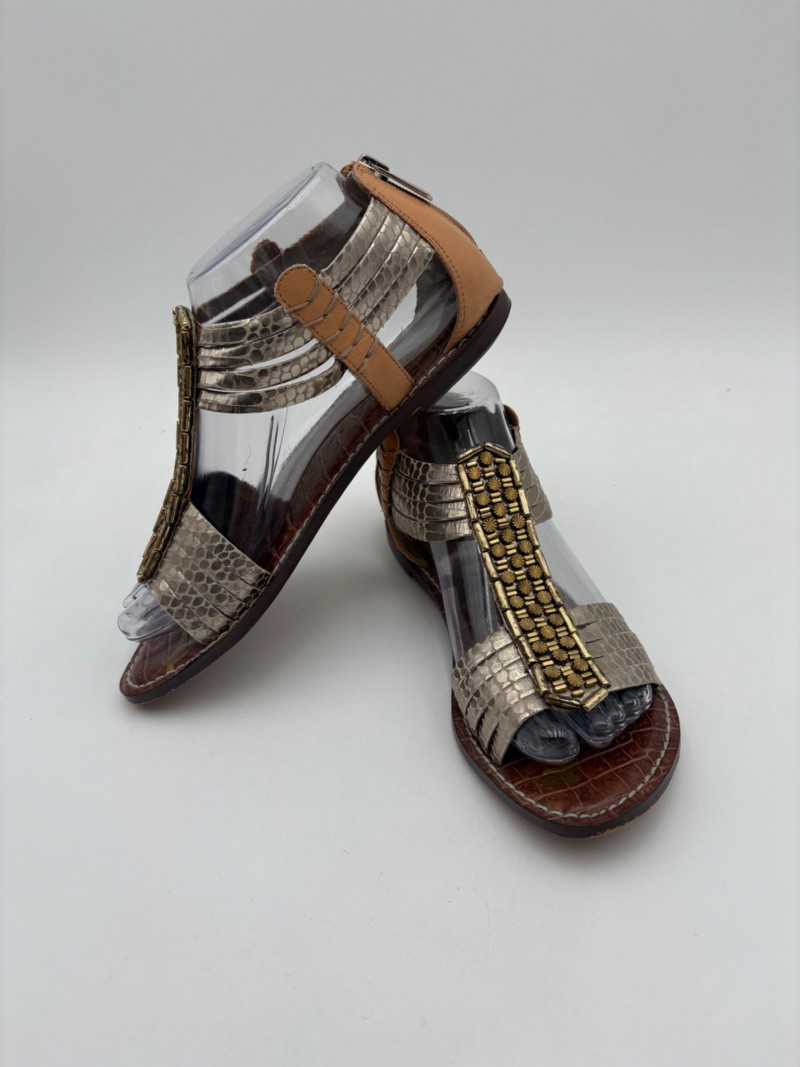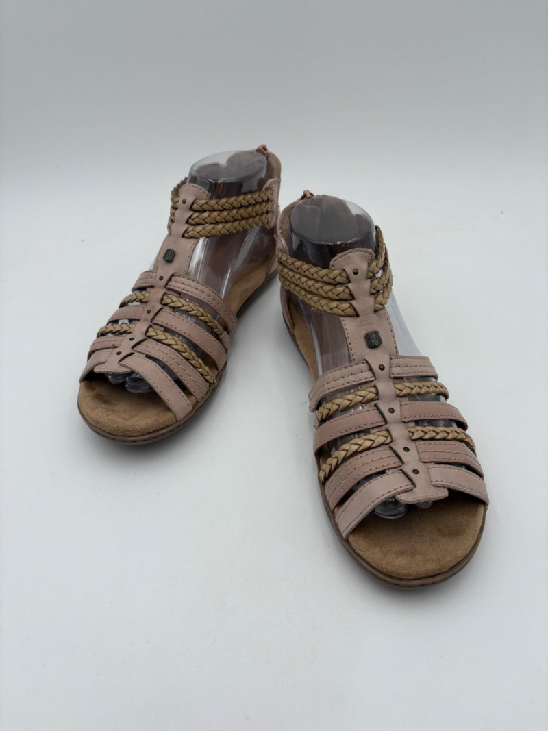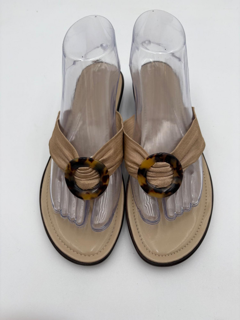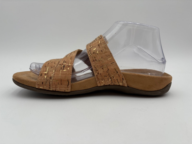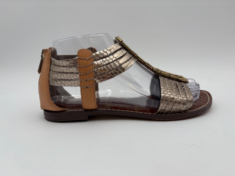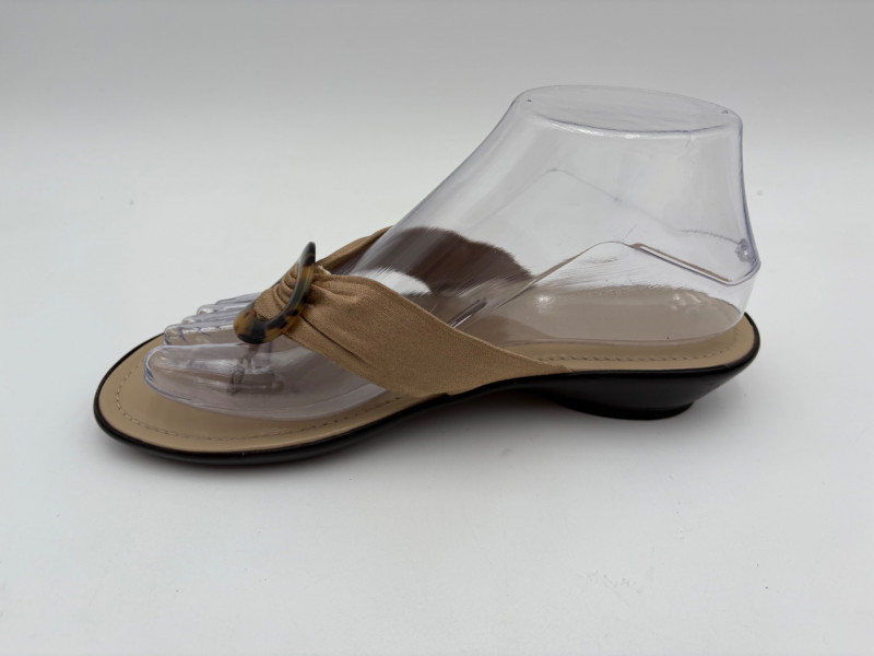 Four pairs of neutral-toned sandals - all have been worn enough to break them in, but definitely have a a lot more life left in them. Vionic cork strap sandals have a molded footbed and adjustable straps across the top of the foot - the 2 lower ones close with Velcro and the top one with a buckle. In good used condition. Size 7. Gold "alligator leather" sandals from Sam Edelman have decorative metal beading and neutral leather trim on straps. Zip heel closure with natural leather sole and low stacked heel. In very good condition - very little wear on the uppers or soles. Size 7. Beige braided strap sandals from Earth Origins have alternating braided leather and top stitched leather straps. zip heel closure, and heavily padded insole.. In very good used condition. Size 7 Flip flop style sandals from Italian Shoemakers with elasticated upper band & tortoiseshell ring above toes. Low 1.25" heel. In excellent condition. Size 8 (we think it fits closer to a 7.5),