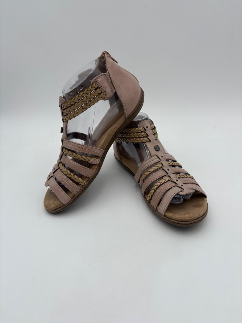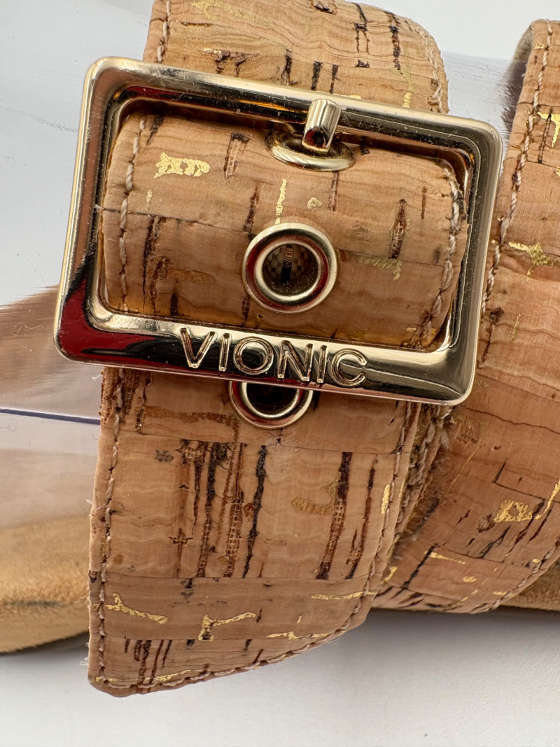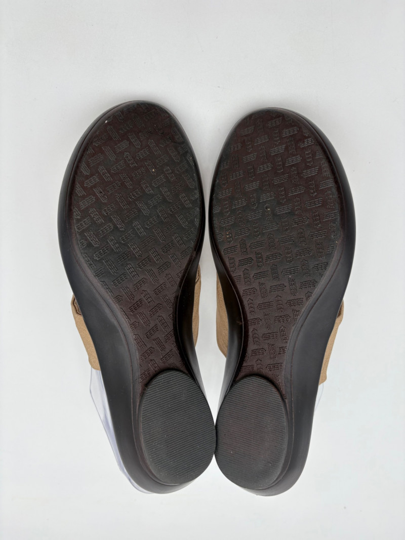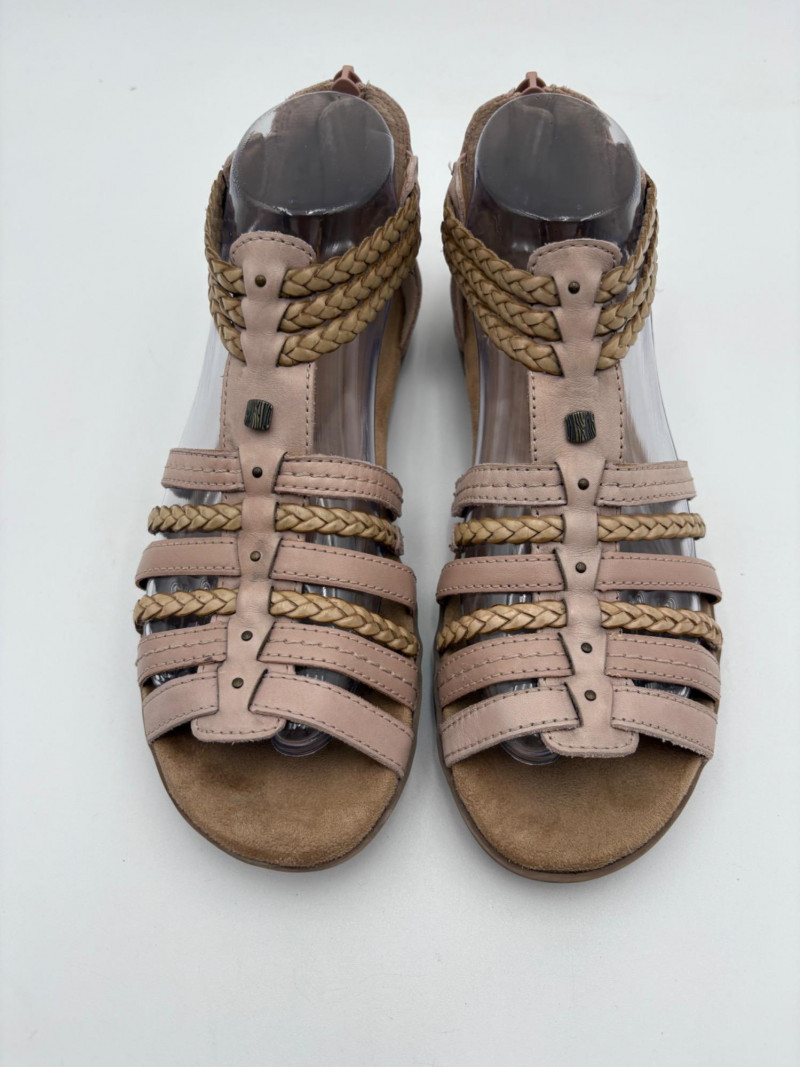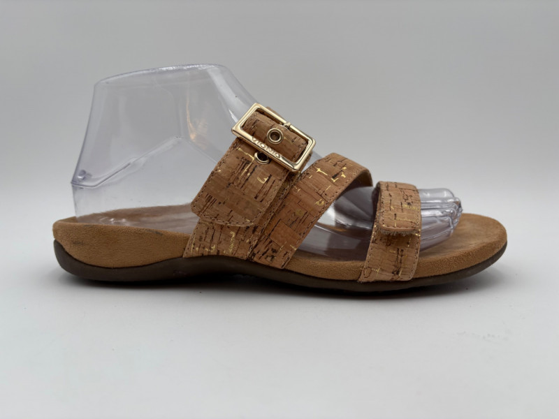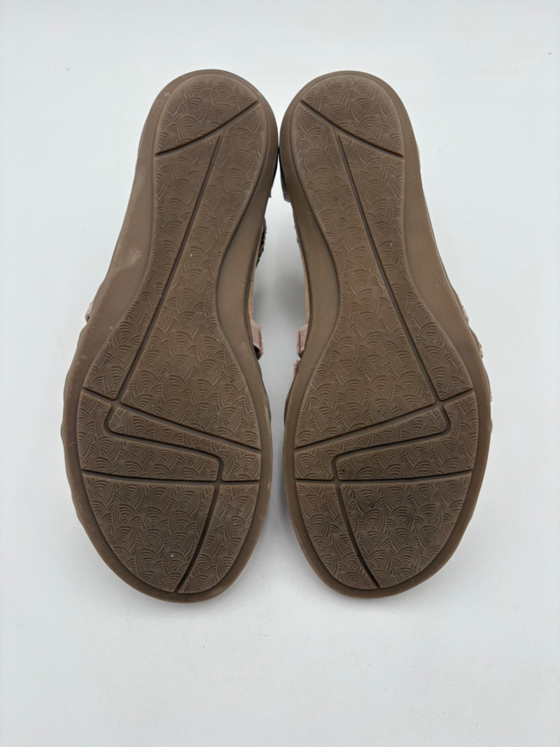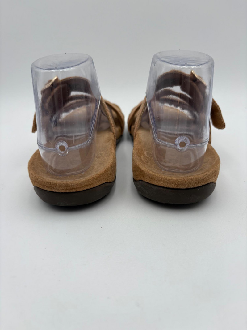 Four pairs of neutral-toned sandals - all have been worn enough to break them in, but definitely have a a lot more life left in them. Vionic cork strap sandals have a molded footbed and adjustable straps across the top of the foot - the 2 lower ones close with Velcro and the top one with a buckle. In good used condition. Size 7. Gold "alligator leather" sandals from Sam Edelman have decorative metal beading and neutral leather trim on straps. Zip heel closure with natural leather sole and low stacked heel. In very good condition - very little wear on the uppers or soles. Size 7. Beige braided strap sandals from Earth Origins have alternating braided leather and top stitched leather straps. zip heel closure, and heavily padded insole.. In very good used condition. Size 7 Flip flop style sandals from Italian Shoemakers with elasticated upper band & tortoiseshell ring above toes. Low 1.25" heel. In excellent condition. Size 8 (we think it fits closer to a 7.5),