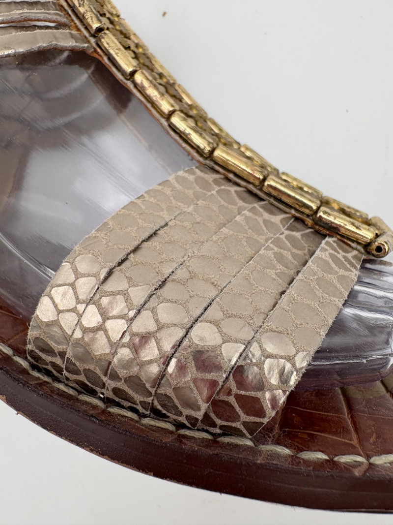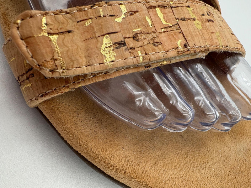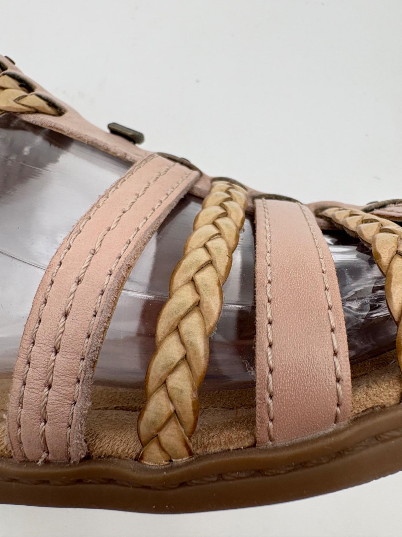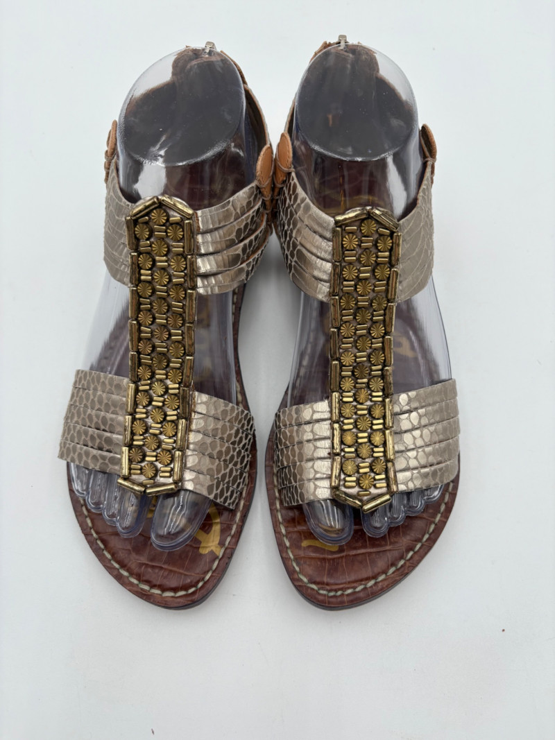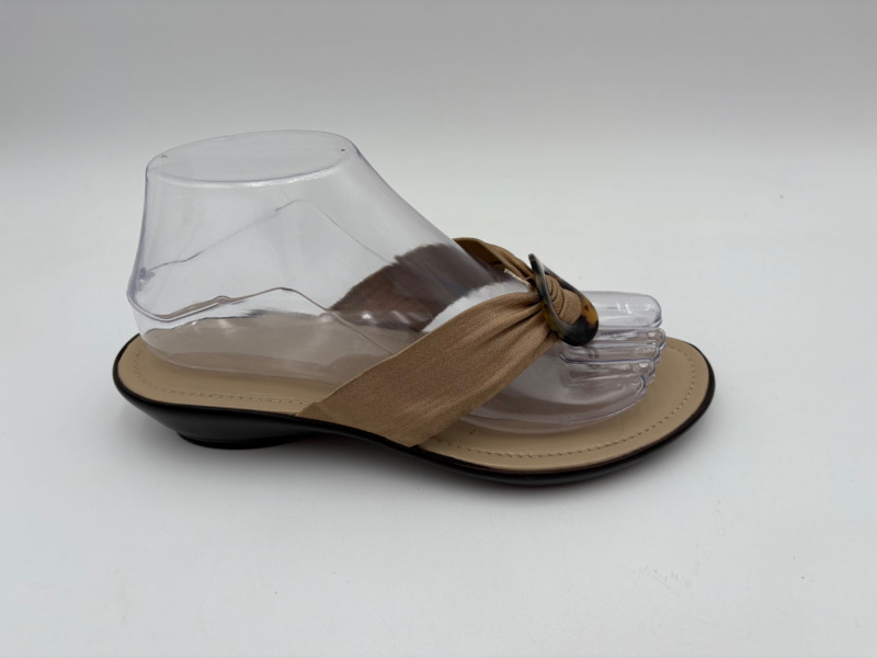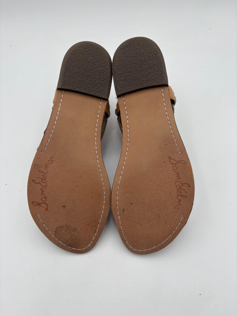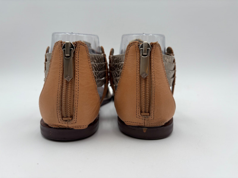 Four pairs of neutral-toned sandals - all have been worn enough to break them in, but definitely have a a lot more life left in them. Vionic cork strap sandals have a molded footbed and adjustable straps across the top of the foot - the 2 lower ones close with Velcro and the top one with a buckle. In good used condition. Size 7. Gold "alligator leather" sandals from Sam Edelman have decorative metal beading and neutral leather trim on straps. Zip heel closure with natural leather sole and low stacked heel. In very good condition - very little wear on the uppers or soles. Size 7. Beige braided strap sandals from Earth Origins have alternating braided leather and top stitched leather straps. zip heel closure, and heavily padded insole.. In very good used condition. Size 7 Flip flop style sandals from Italian Shoemakers with elasticated upper band & tortoiseshell ring above toes. Low 1.25" heel. In excellent condition. Size 8 (we think it fits closer to a 7.5),