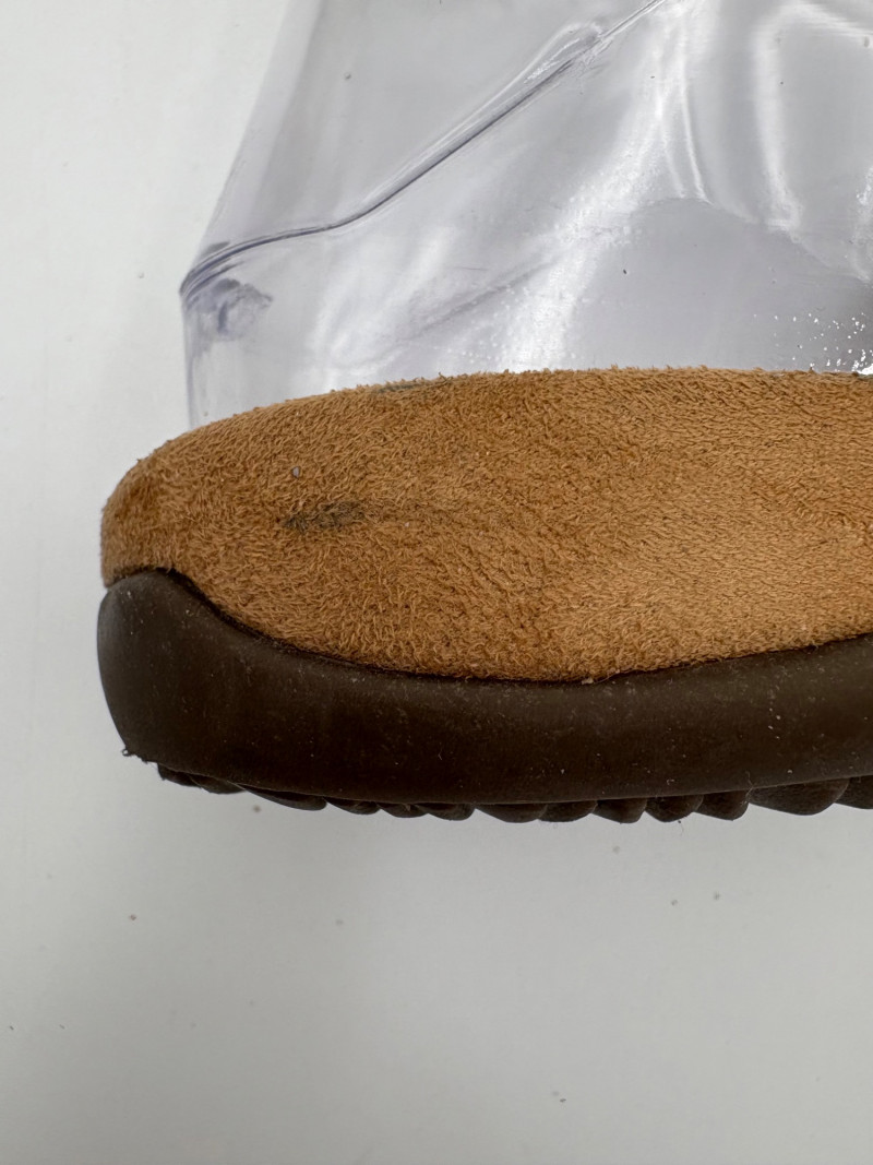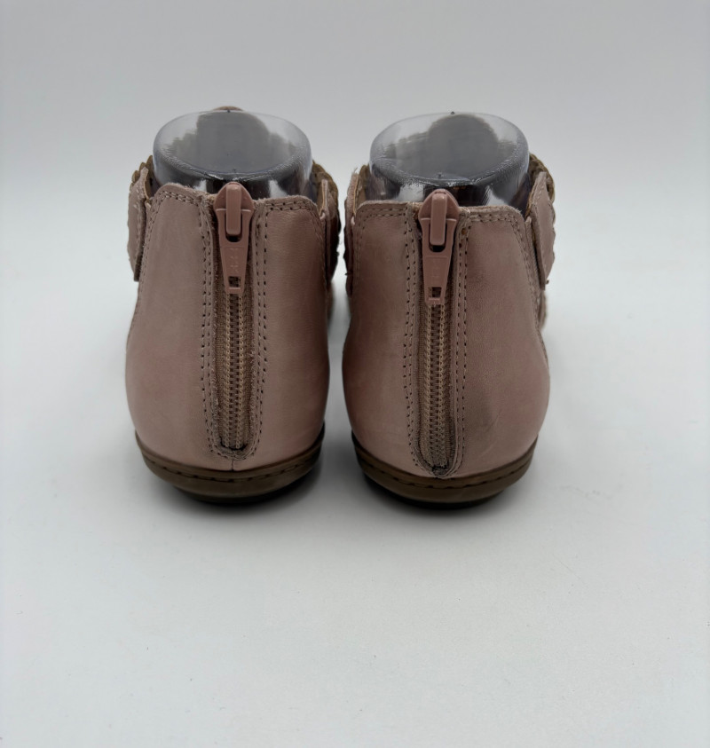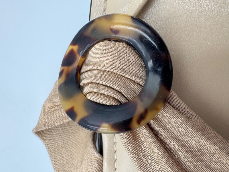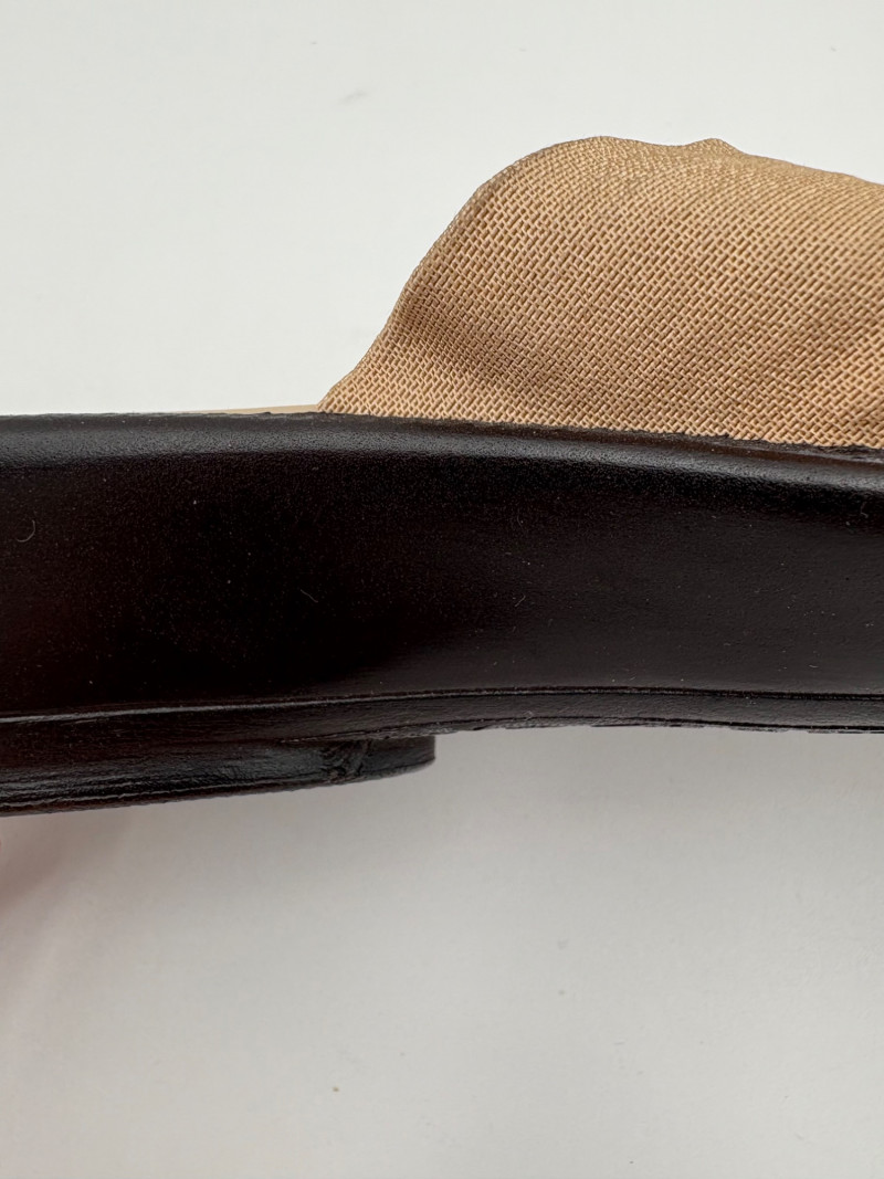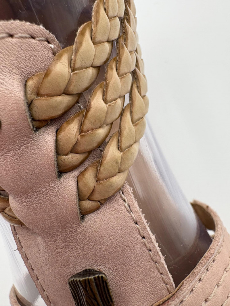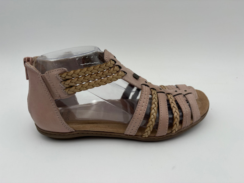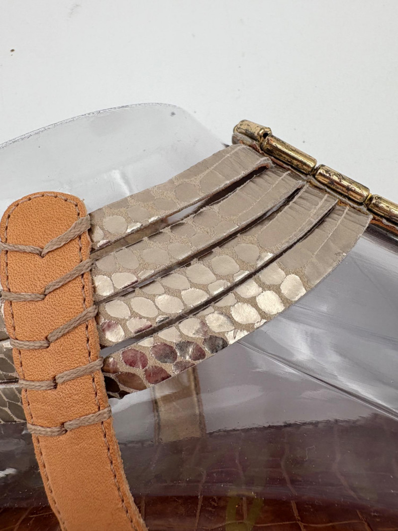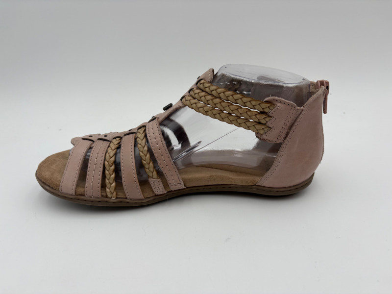 Four pairs of neutral-toned sandals - all have been worn enough to break them in, but definitely have a a lot more life left in them. Vionic cork strap sandals have a molded footbed and adjustable straps across the top of the foot - the 2 lower ones close with Velcro and the top one with a buckle. In good used condition. Size 7. Gold "alligator leather" sandals from Sam Edelman have decorative metal beading and neutral leather trim on straps. Zip heel closure with natural leather sole and low stacked heel. In very good condition - very little wear on the uppers or soles. Size 7. Beige braided strap sandals from Earth Origins have alternating braided leather and top stitched leather straps. zip heel closure, and heavily padded insole.. In very good used condition. Size 7 Flip flop style sandals from Italian Shoemakers with elasticated upper band & tortoiseshell ring above toes. Low 1.25" heel. In excellent condition. Size 8 (we think it fits closer to a 7.5),